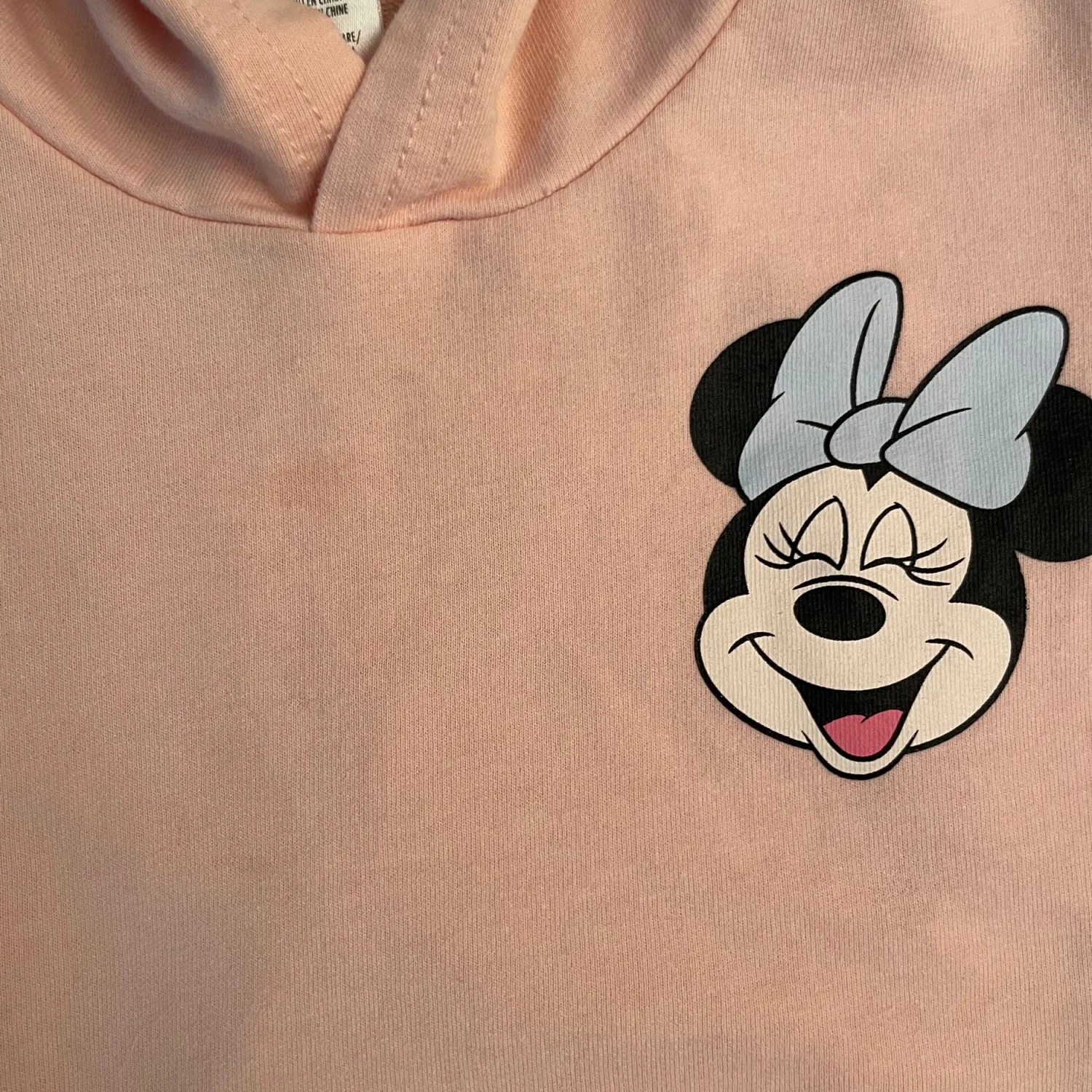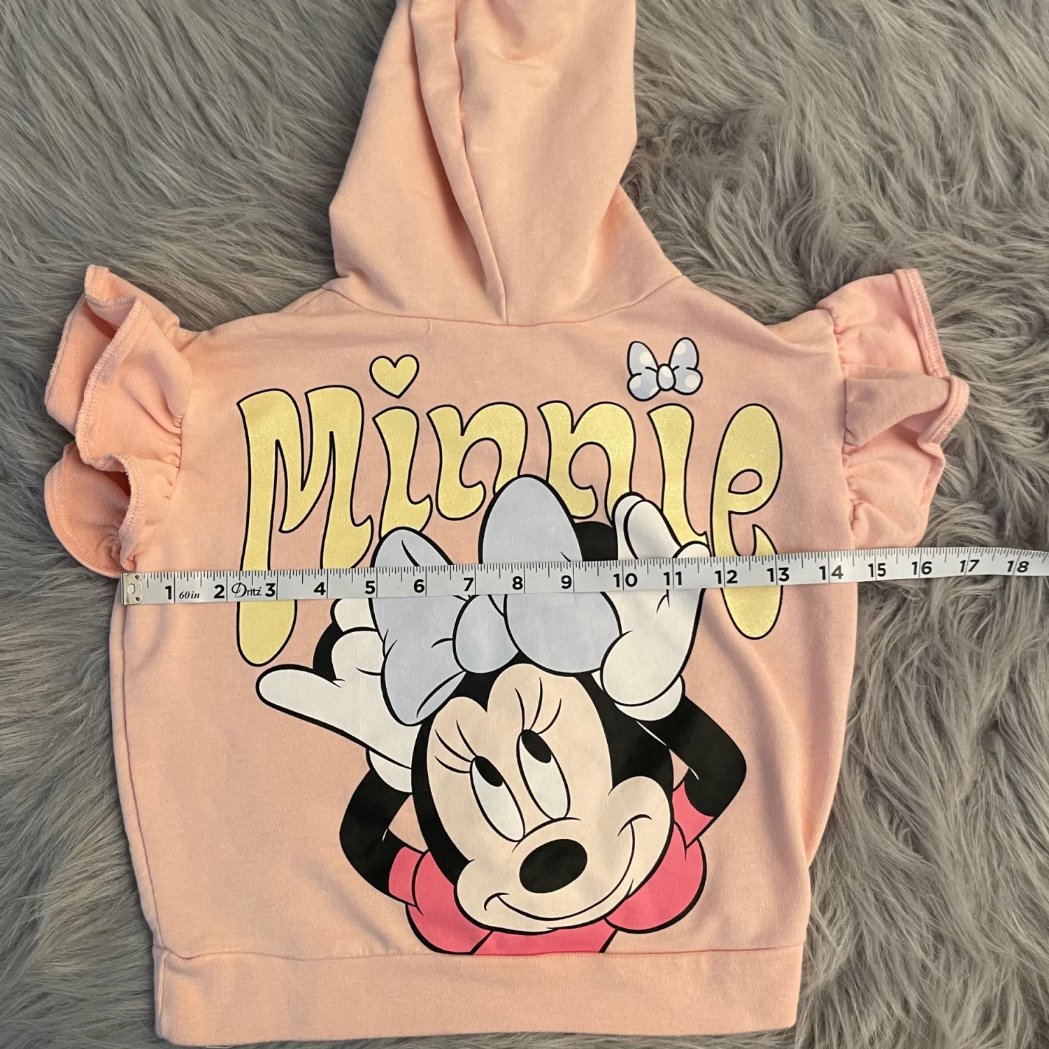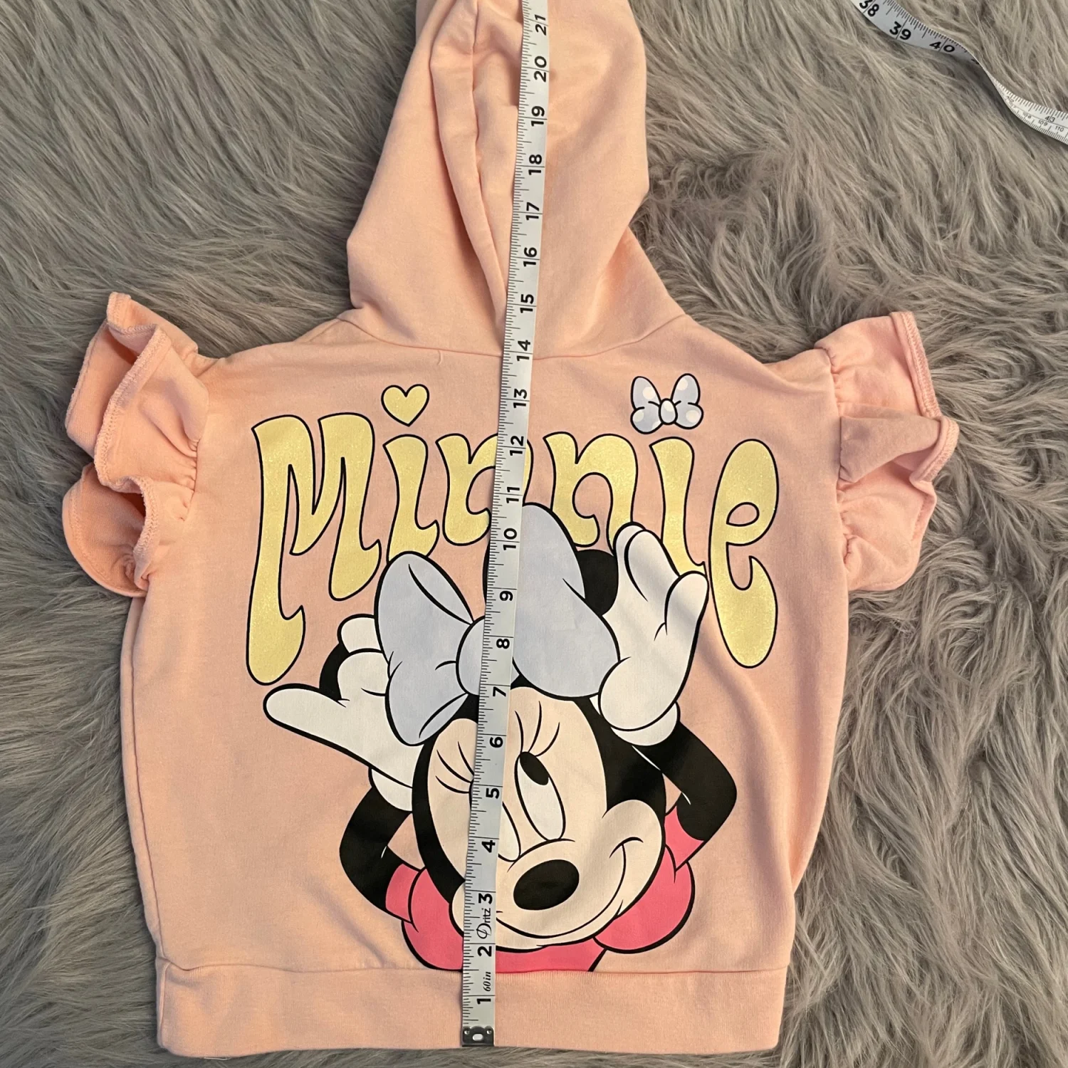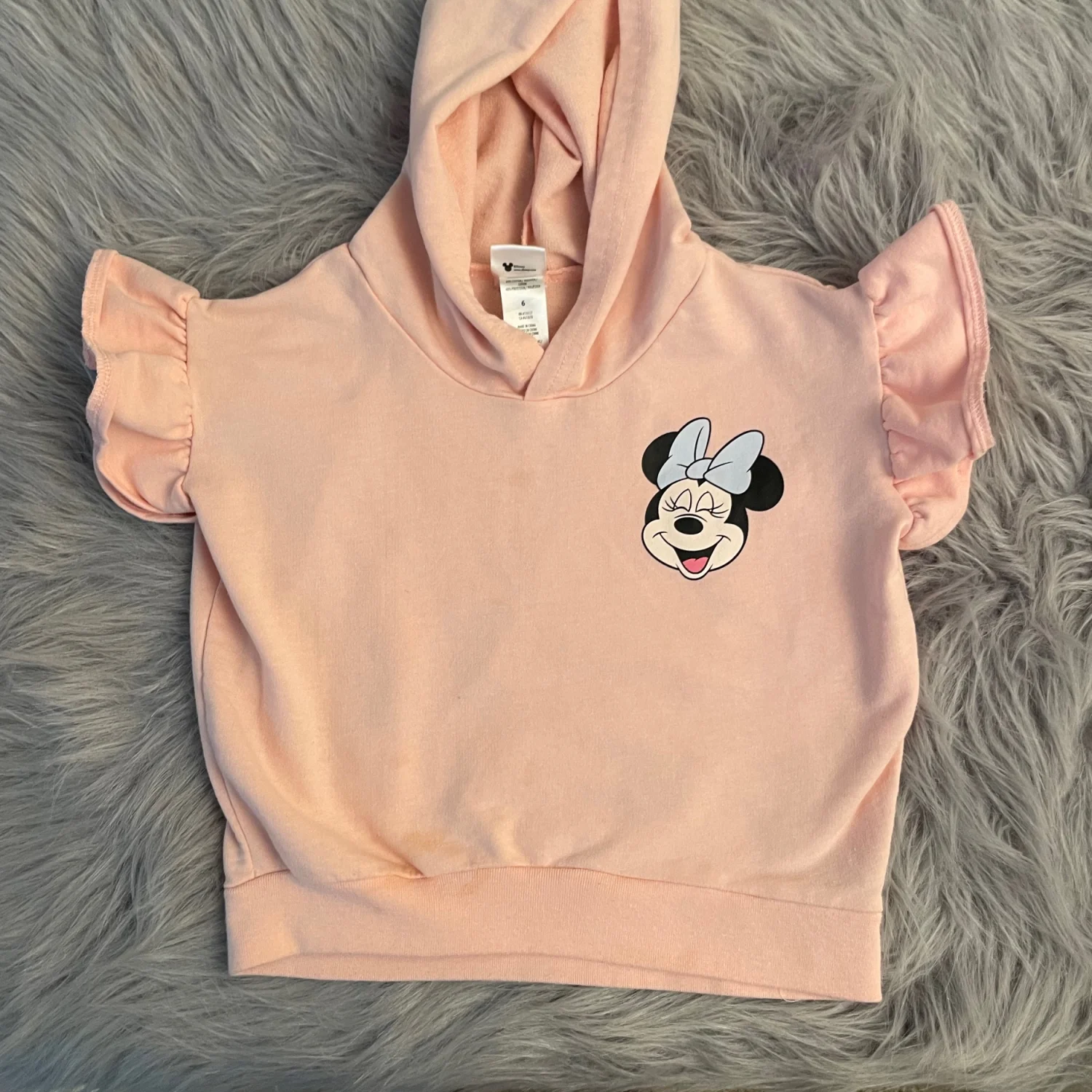 Soft Disney hooded top with Minnie Mouse graphic. Short ruffled sleeves. Pullover style with cozy hood. Cute and casual look. Brown stains. Difficult to see from further away