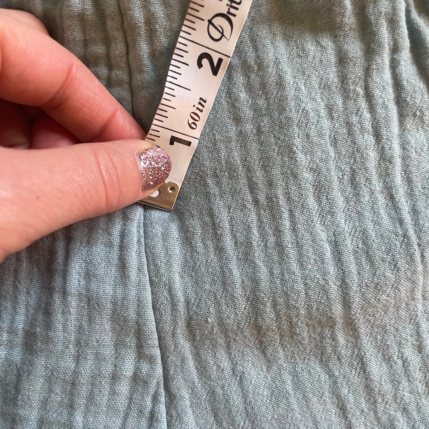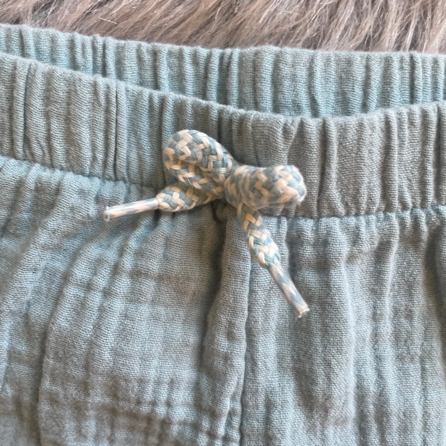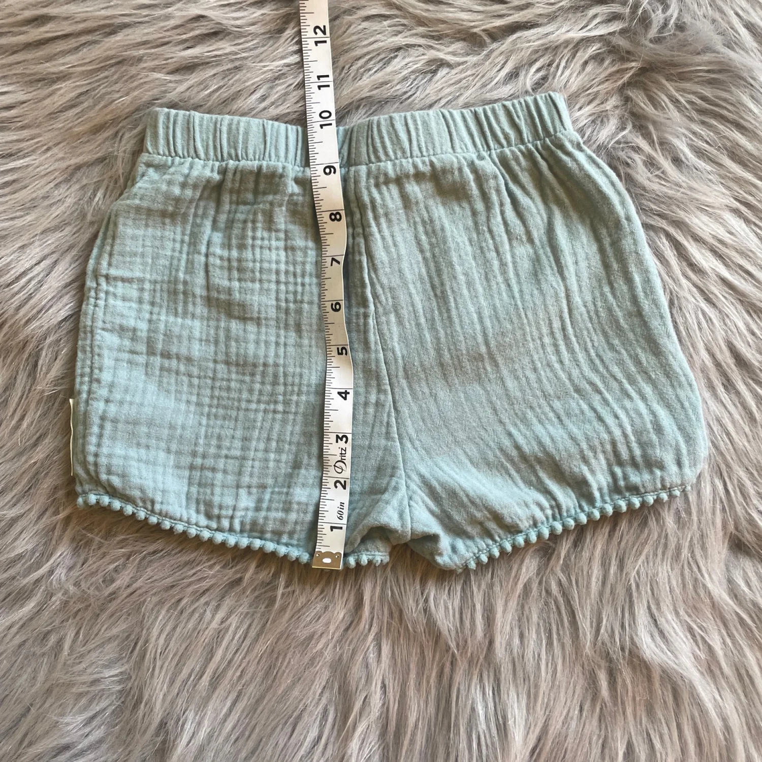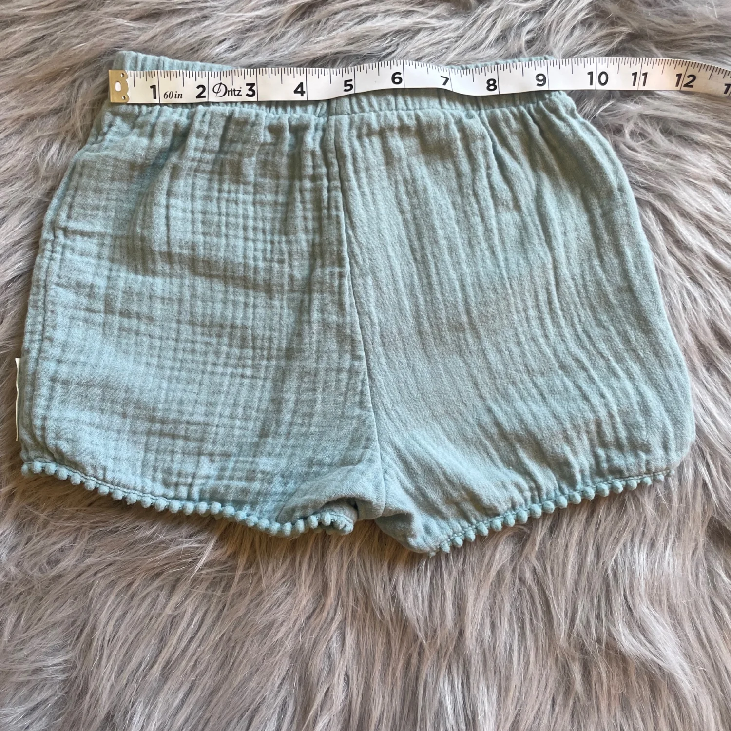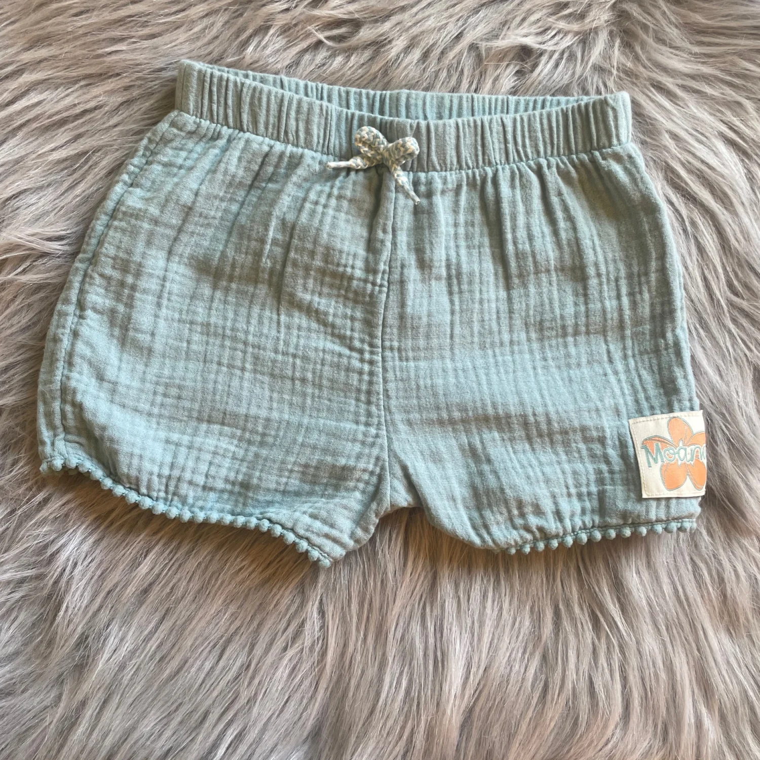 Soft light blue/green shorts. Cotton gauze fabric with elastic waist and tie. Pom trim at hem and decorative patch on leg. Comfortable everyday piece. Very light spot on back.