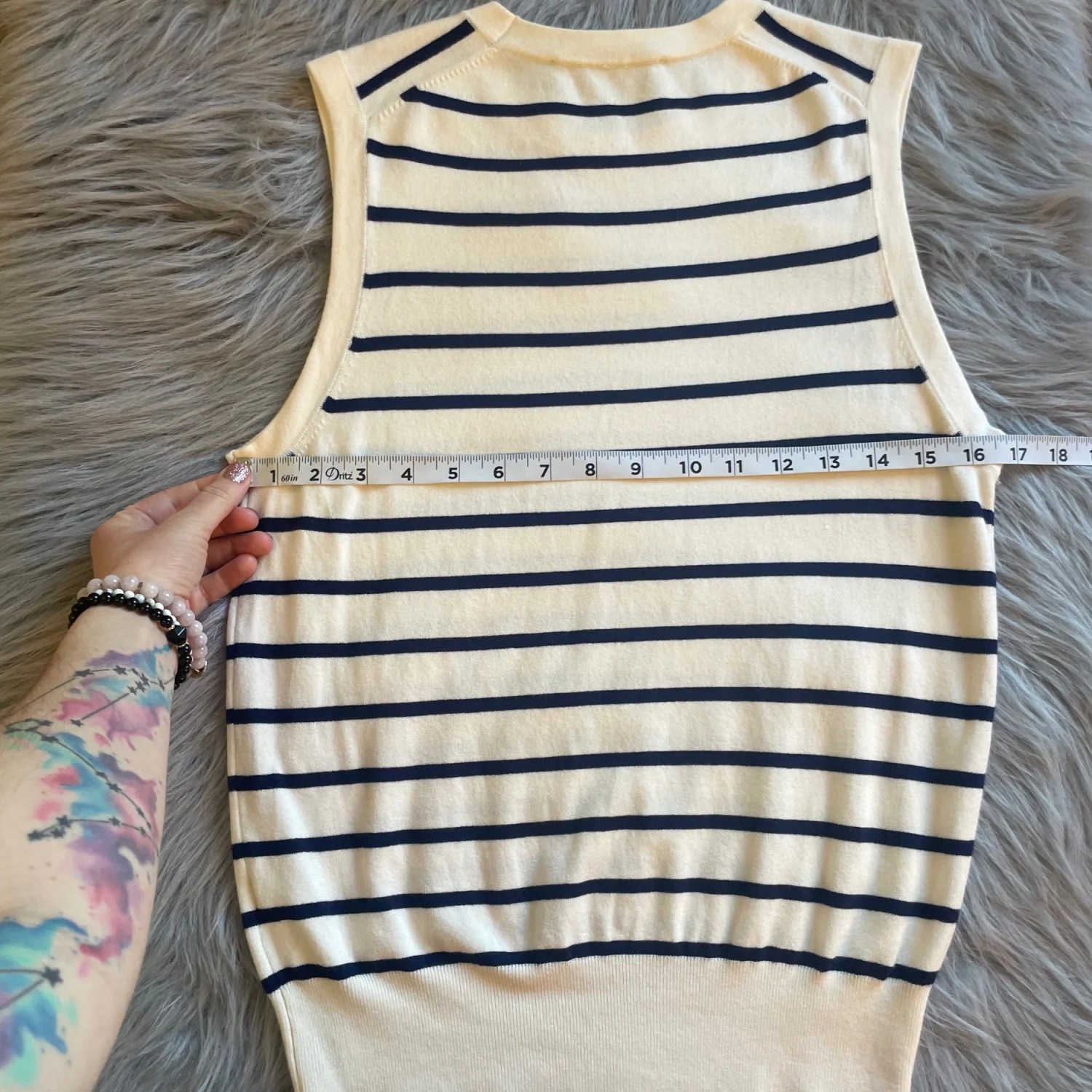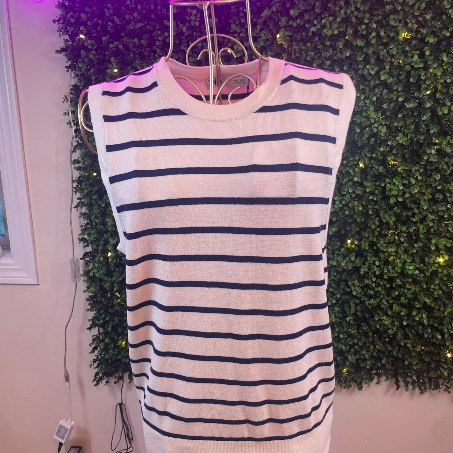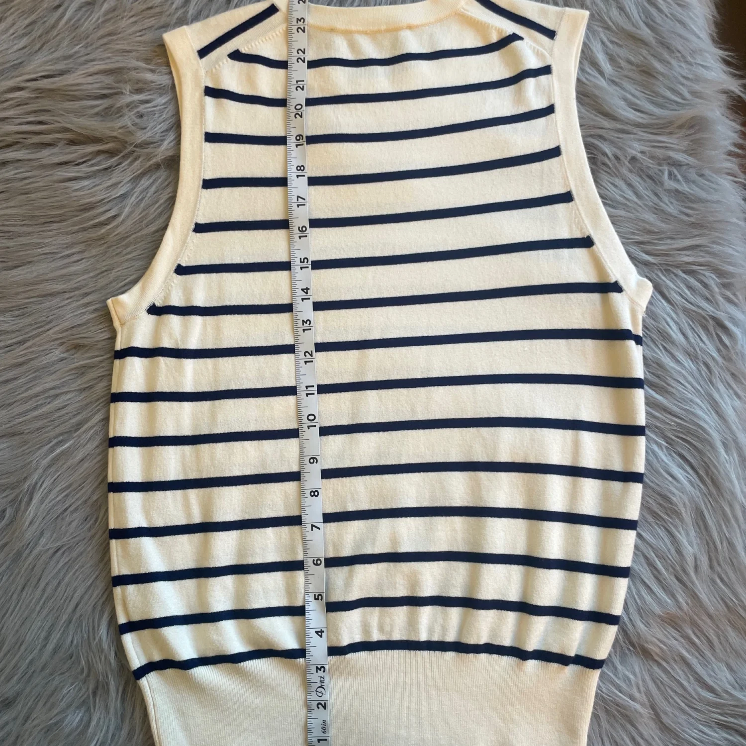 Sleeveless knit top with horizontal navy stripes on a cream base. Crew neckline. Soft, lightweight fabric. Timeless, versatile look.