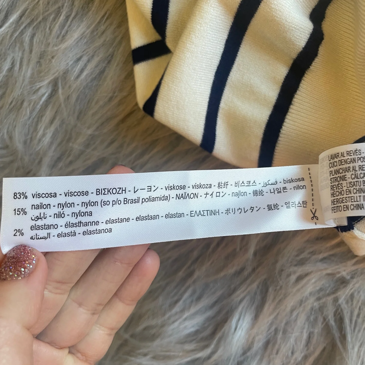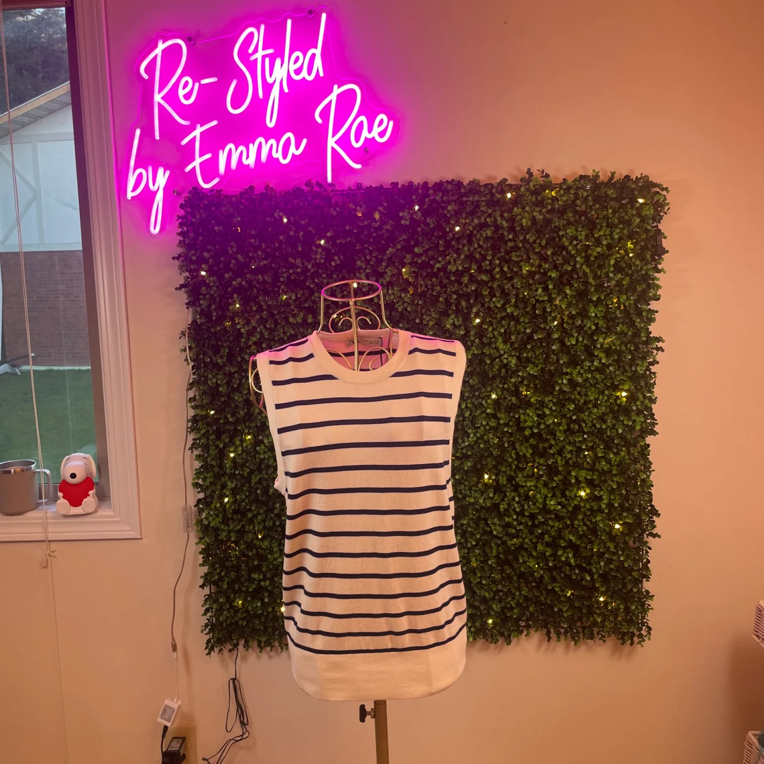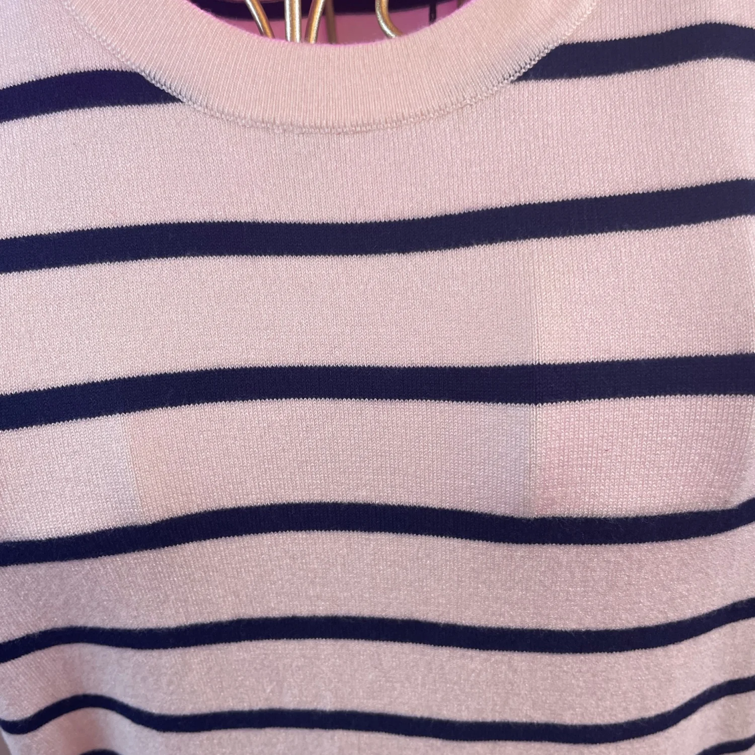 Sleeveless knit top with horizontal navy stripes on a cream base. Crew neckline. Soft, lightweight fabric. Timeless, versatile look.