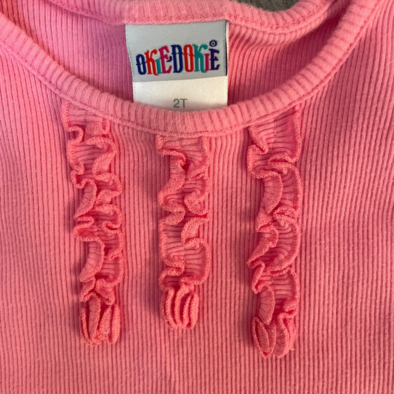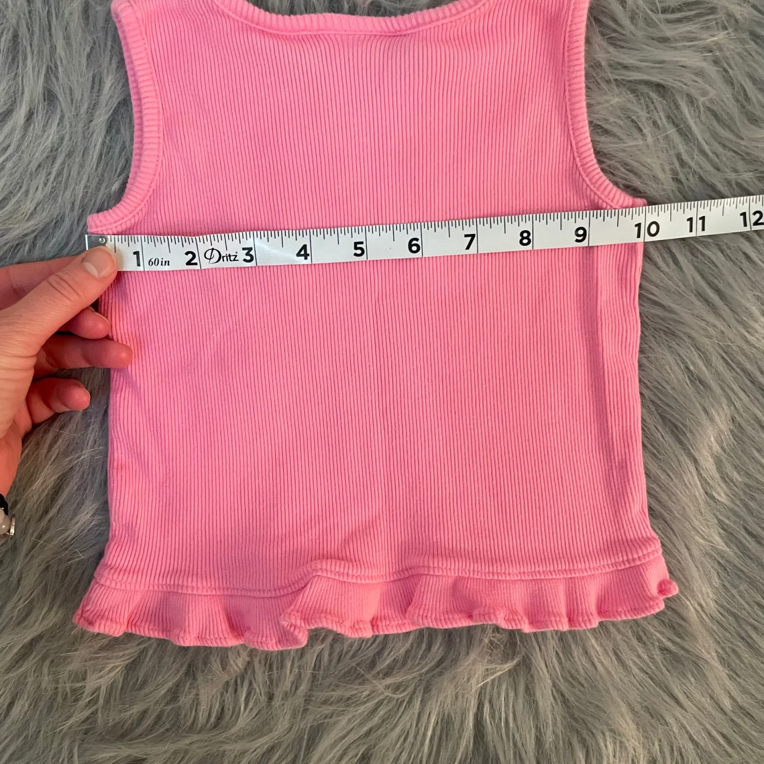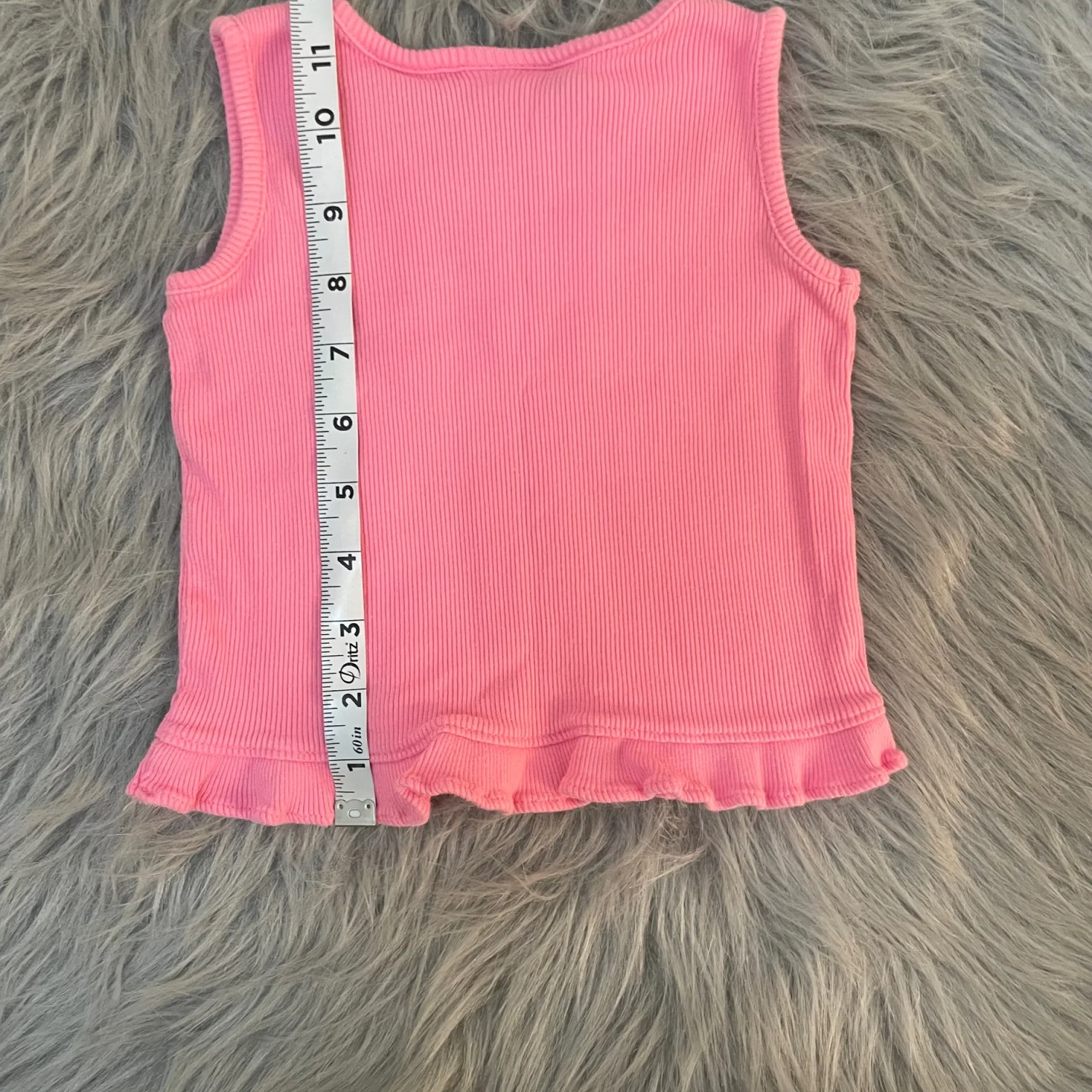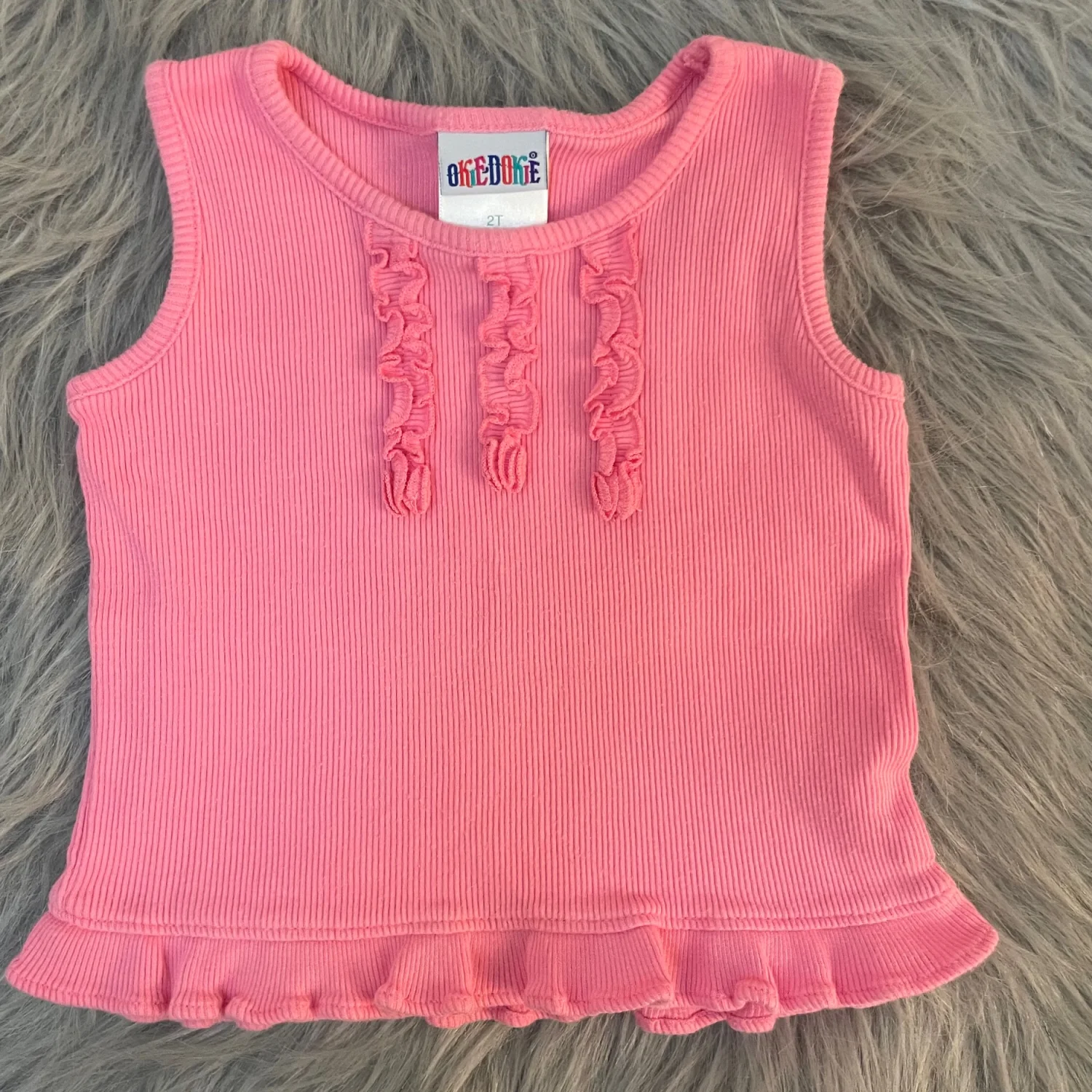 Soft ribbed knit tank with decorative front ruffle trim. Sleeveless design with a flared ruffle hem. Simple pull-on style for easy wear.