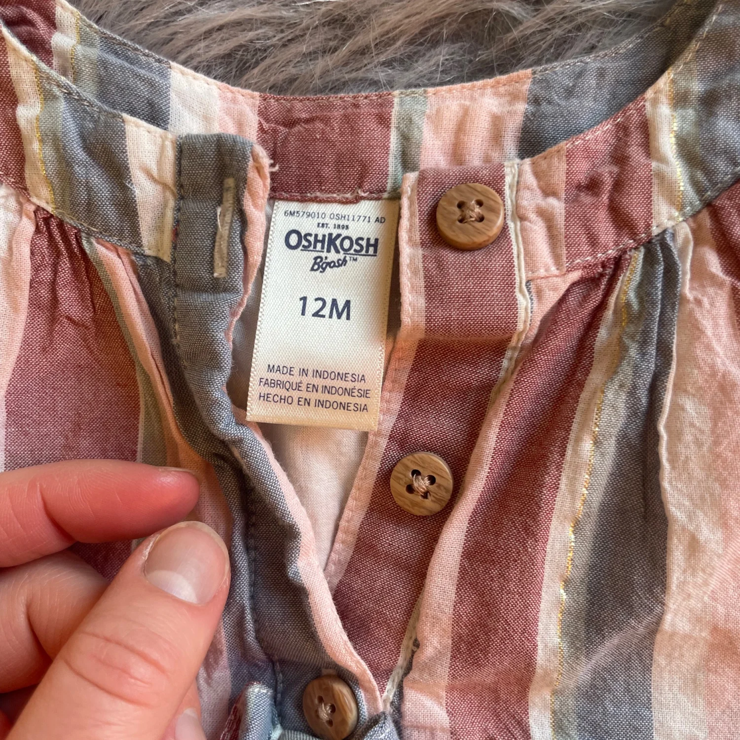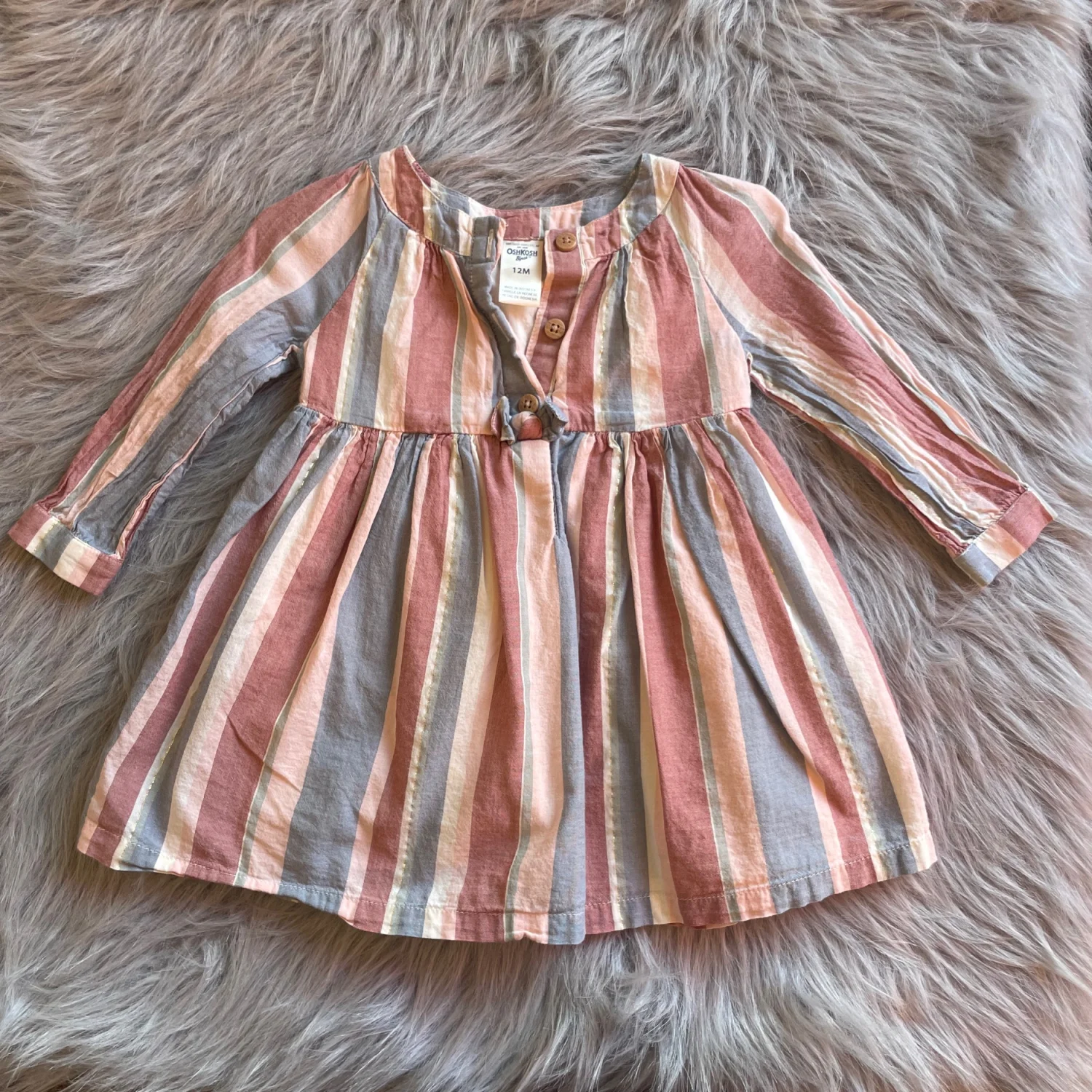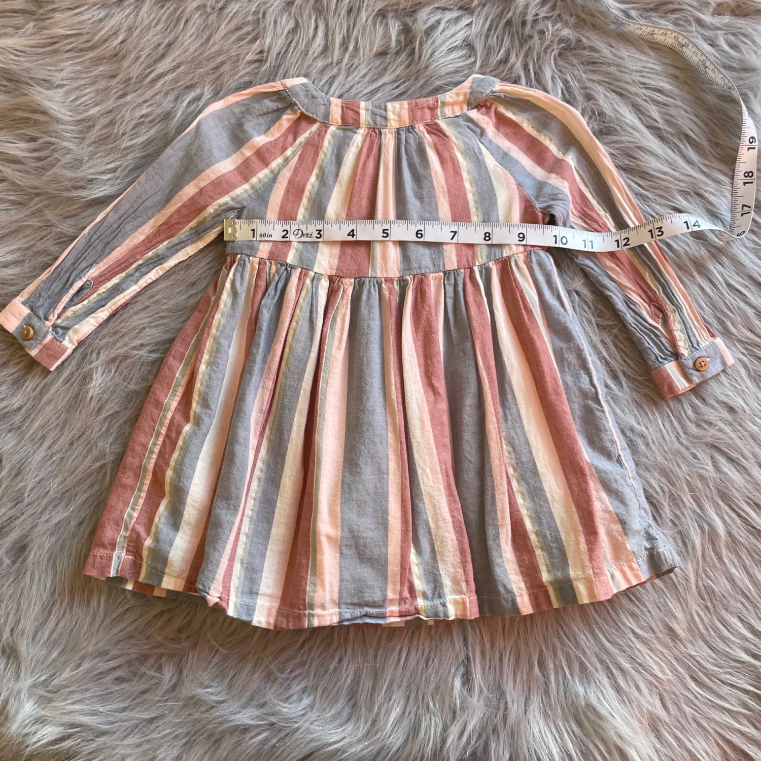 Lightweight cotton dress with long sleeves. Soft vertical stripes in pink, gray and cream. Button-front detail at the chest. Gathered skirt for easy movement. Casual and sweet everyday style.