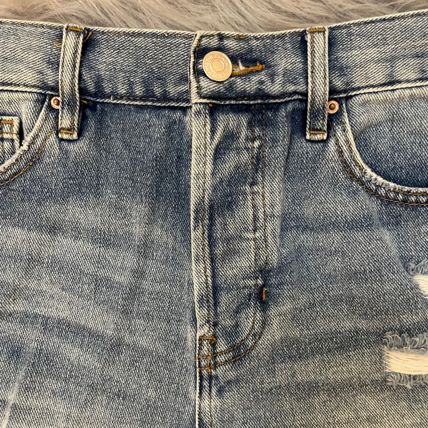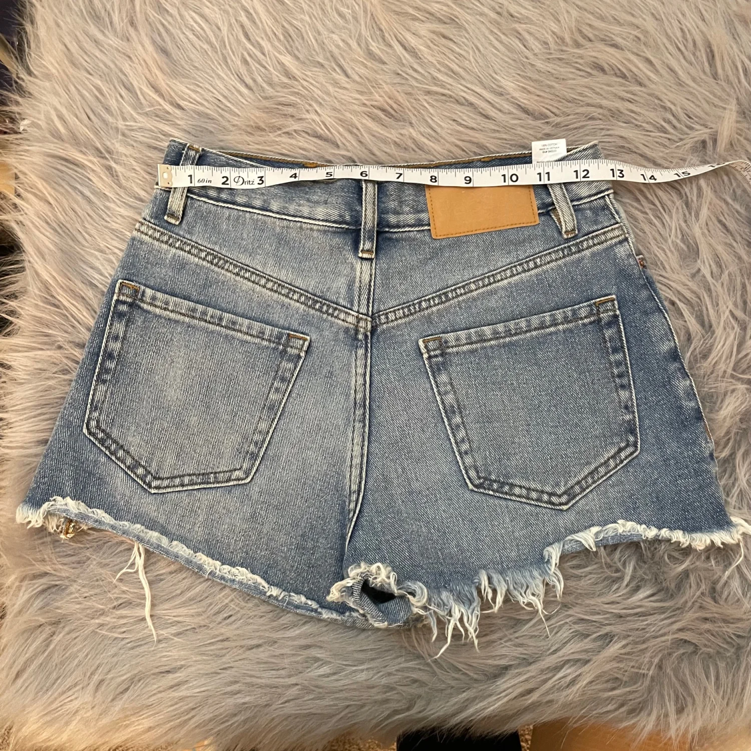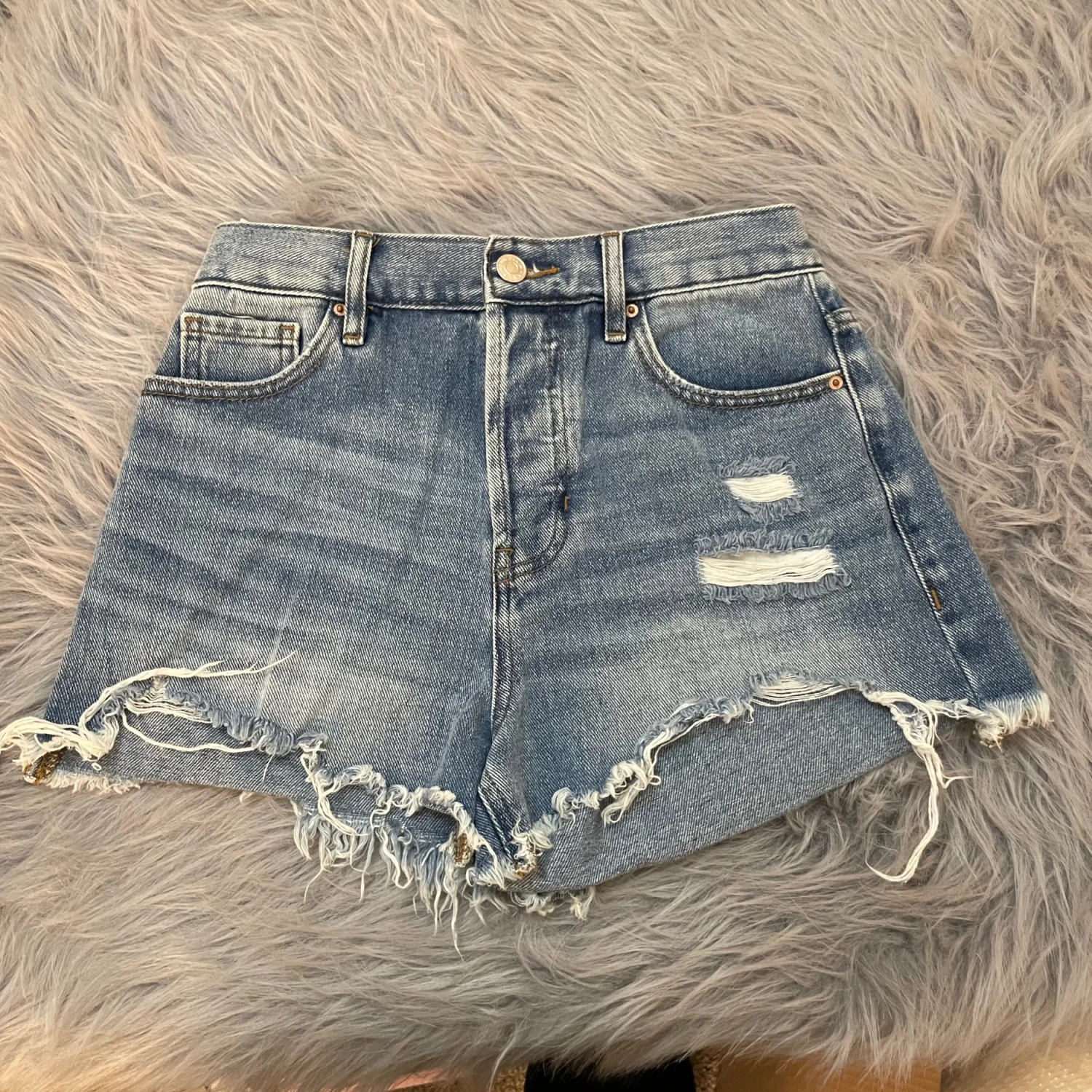 High-rise jean shorts with frayed hem and ripped front detailing. Classic five-pocket design and belt loops. Soft faded wash for a worn-in look. Easy summer staple for casual outfits. Size 25.