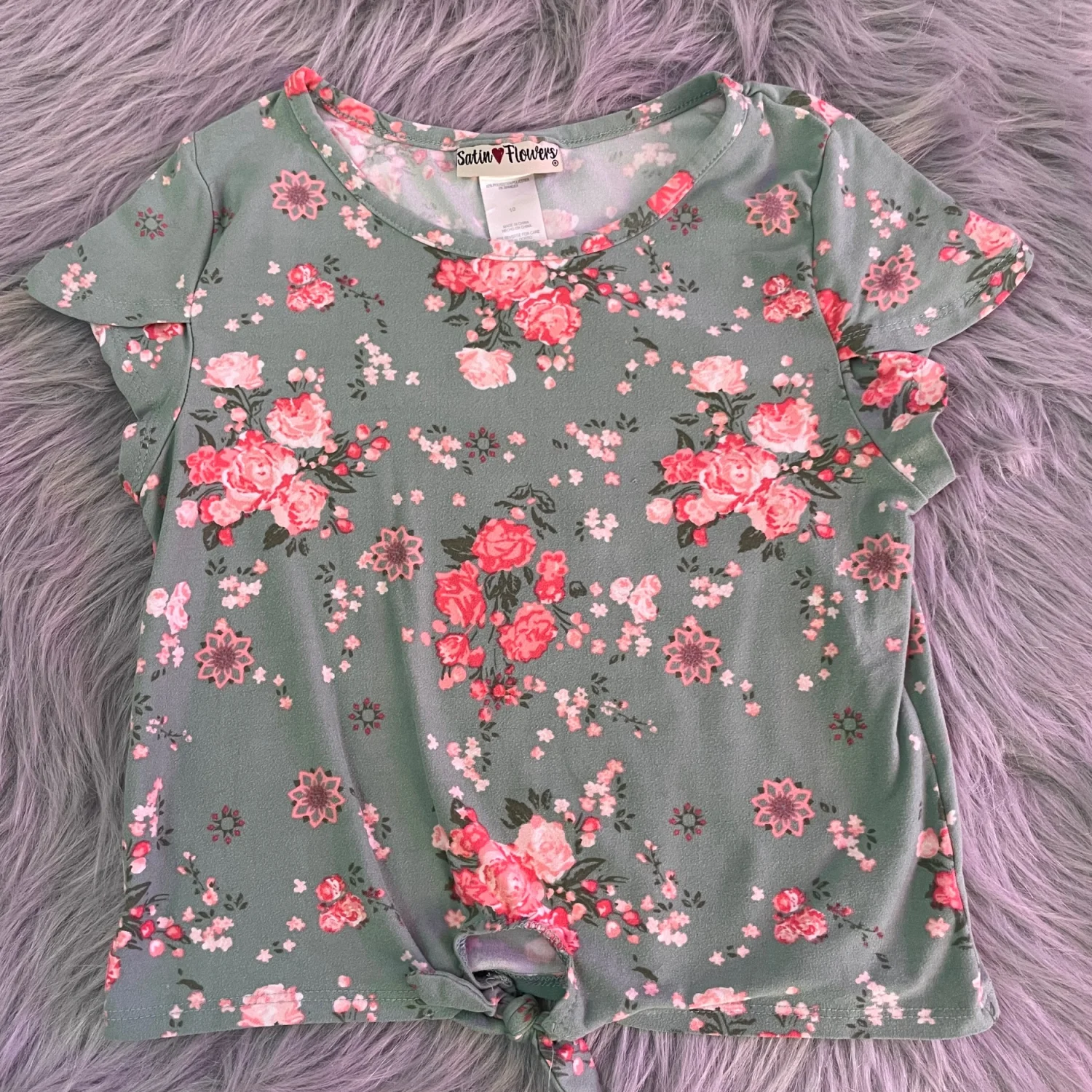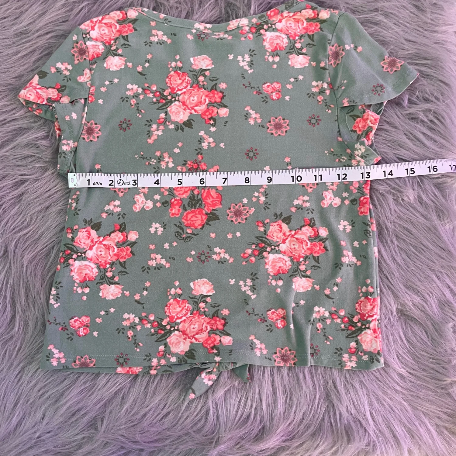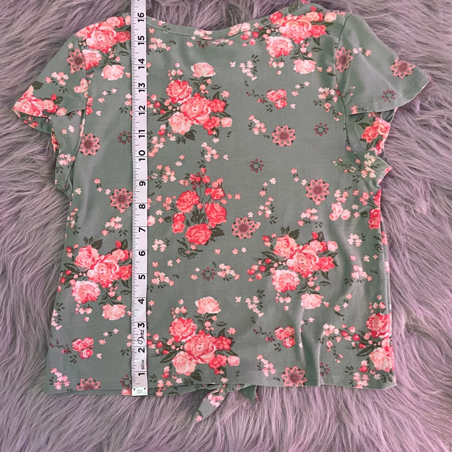 Lightweight floral tee with a front tie detail. Sage green base with pink and coral rose print. Short flutter sleeves. Soft, casual style perfect for everyday wear. Pilling throughout