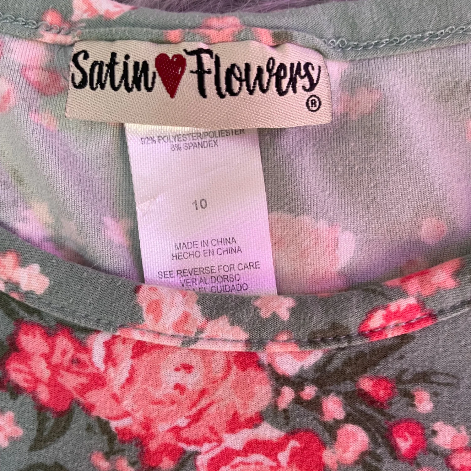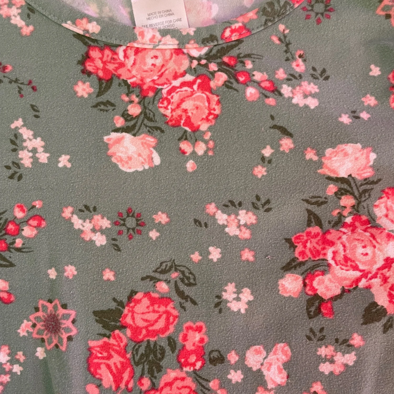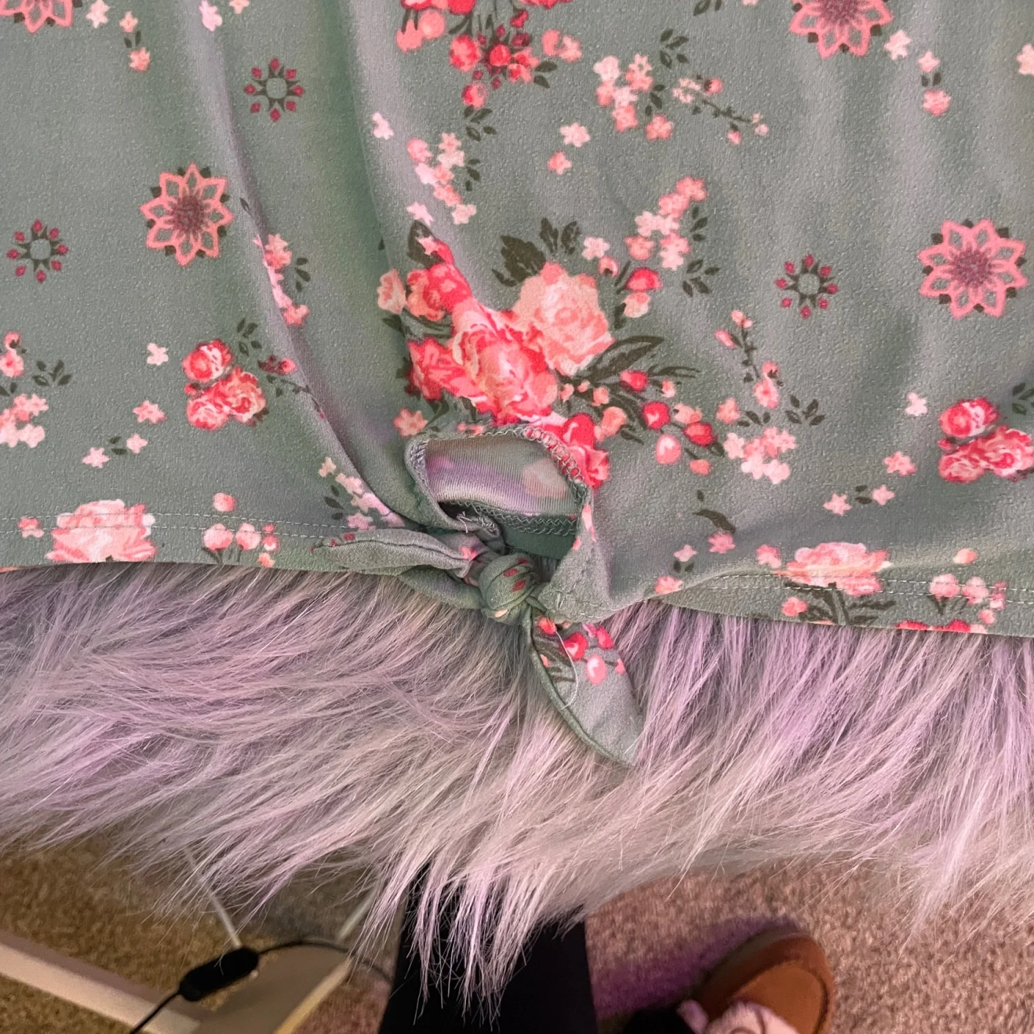 Lightweight floral tee with a front tie detail. Sage green base with pink and coral rose print. Short flutter sleeves. Soft, casual style perfect for everyday wear. Pilling throughout
