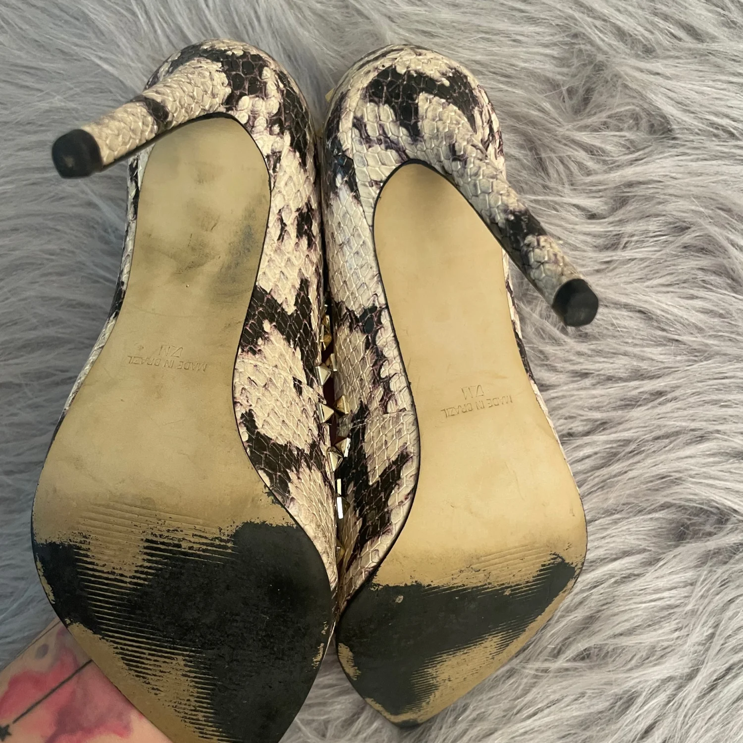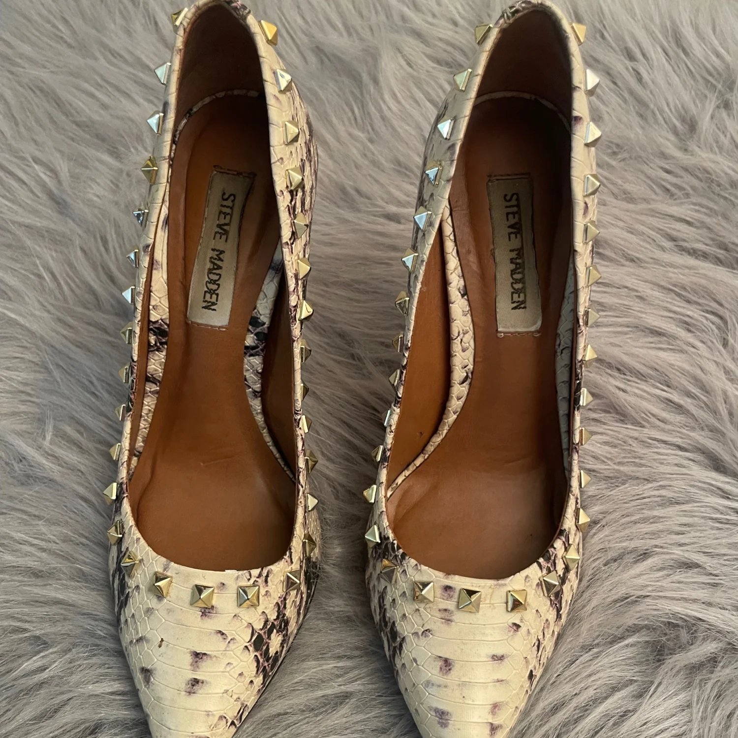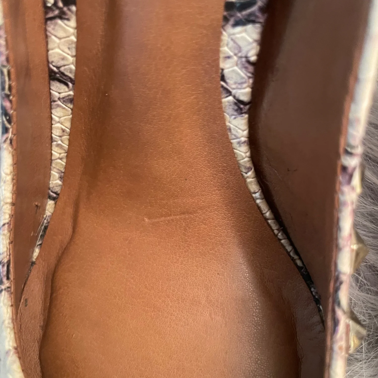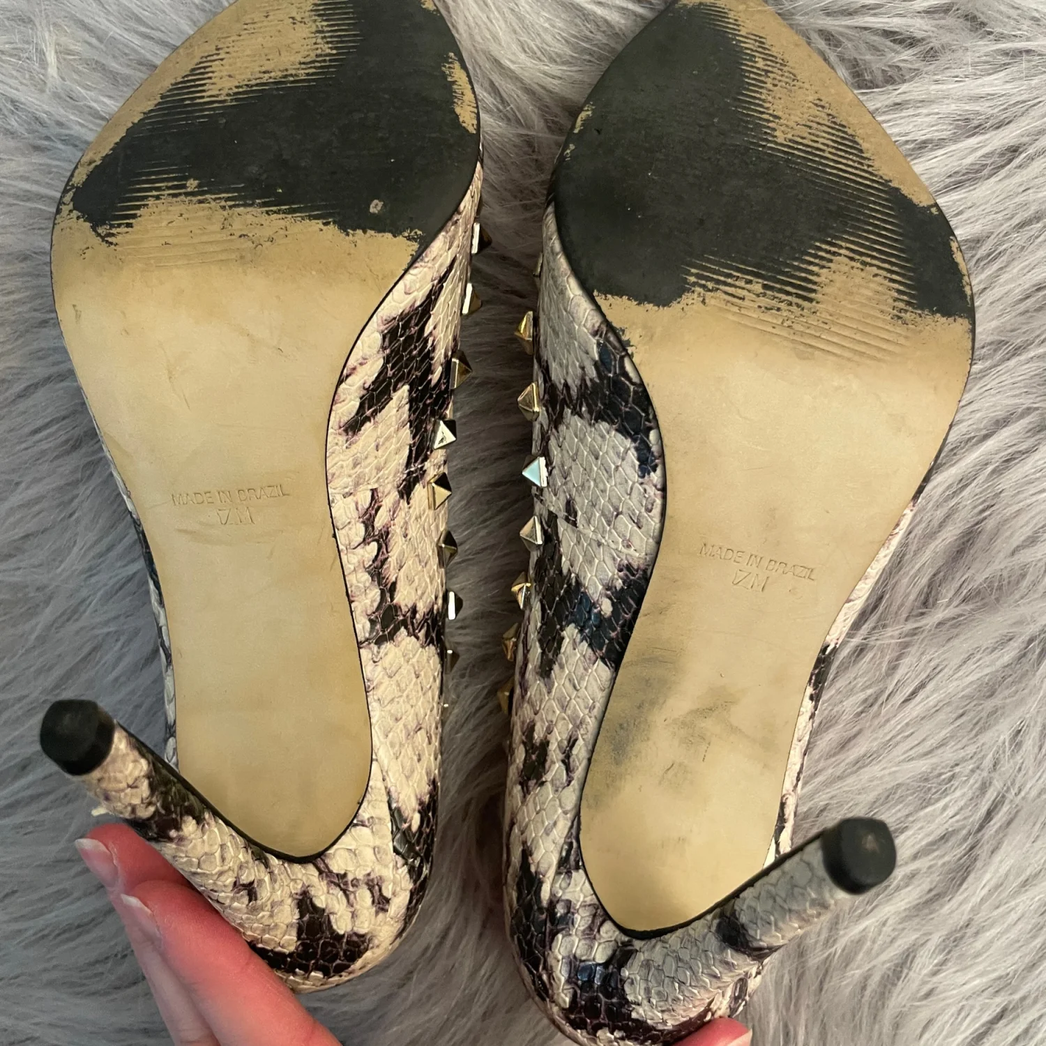Stylish snakeskin pattern with bold studs. Perfect for a night out. Minor cracking inside shoes. Some of gold wearing off in ends of studs. Forgot to take photo of. Please ask if you’d like a photo to see.