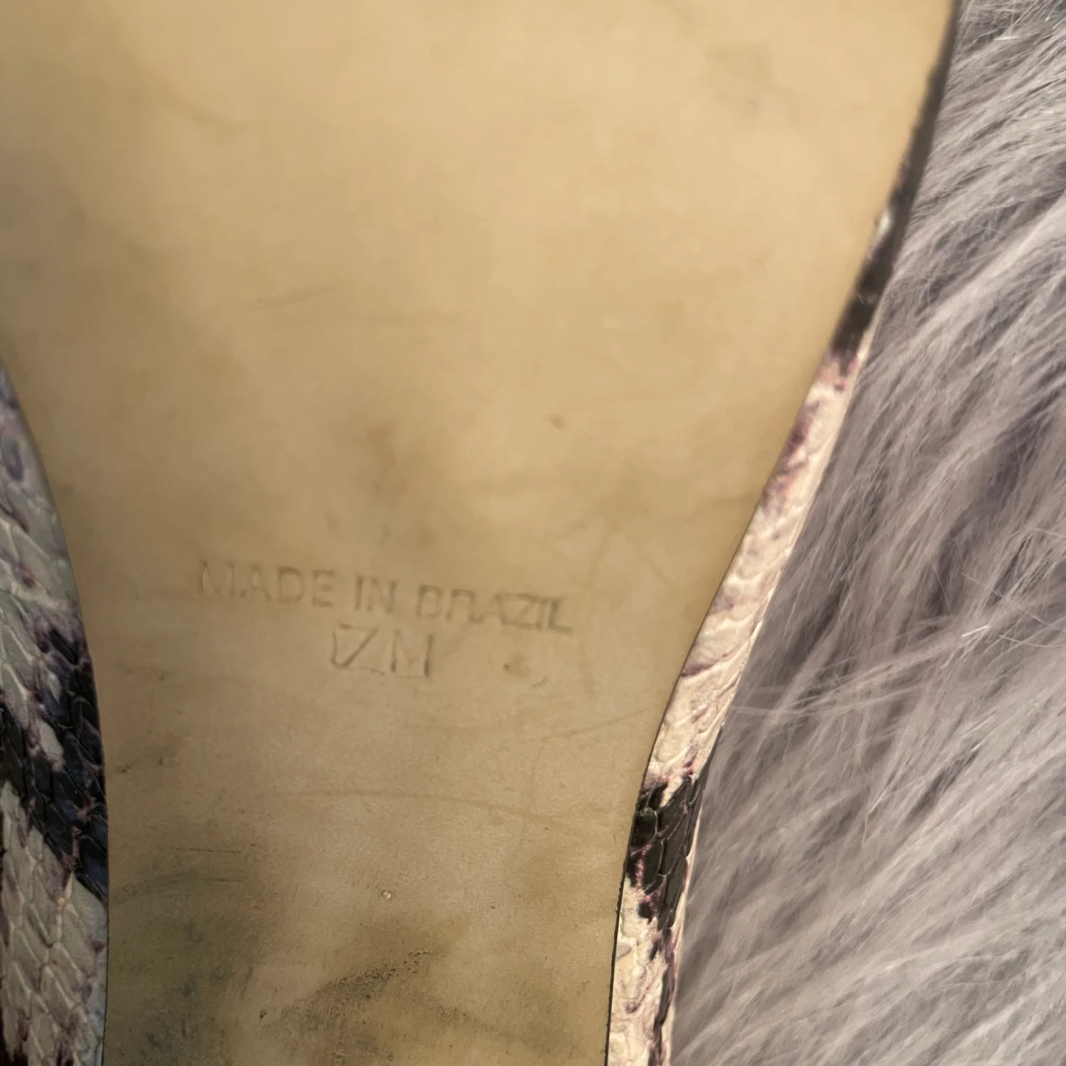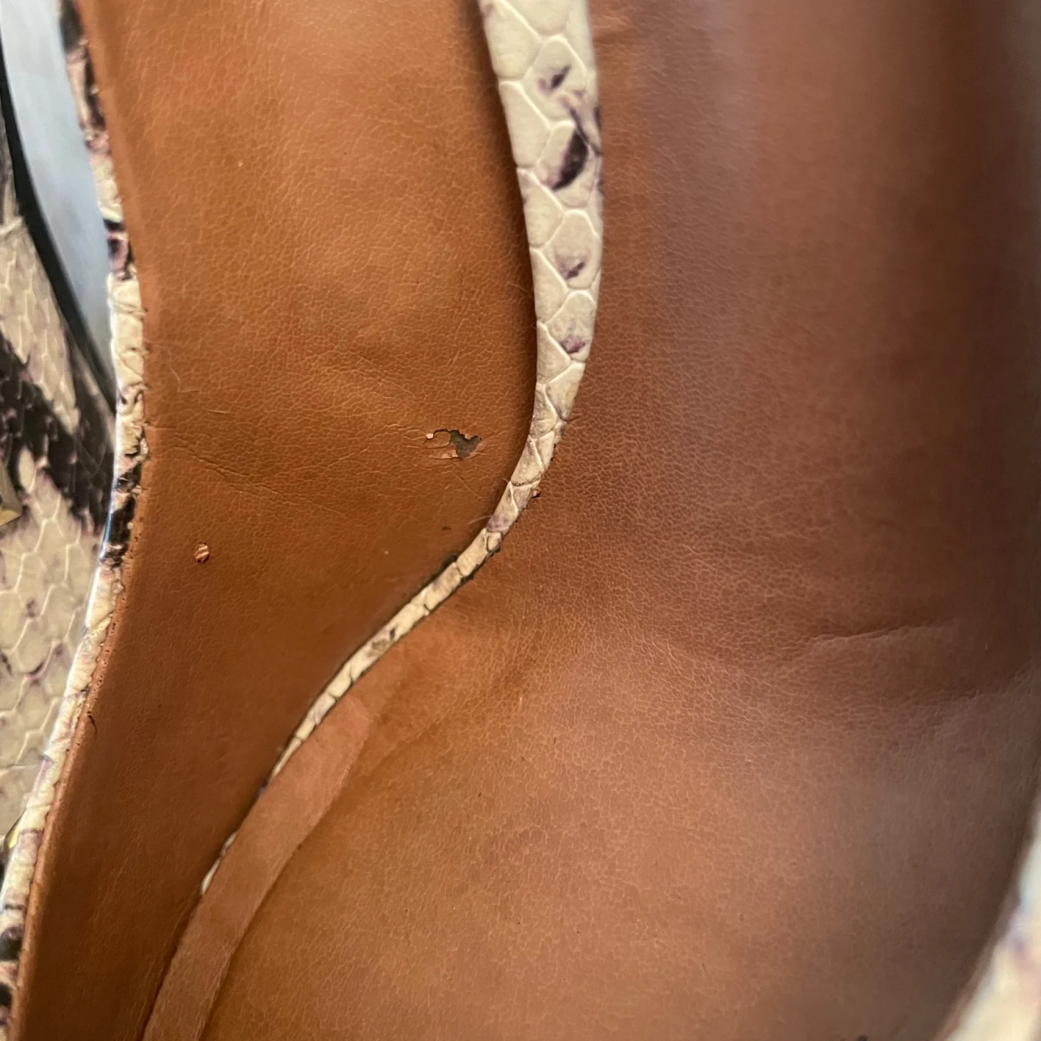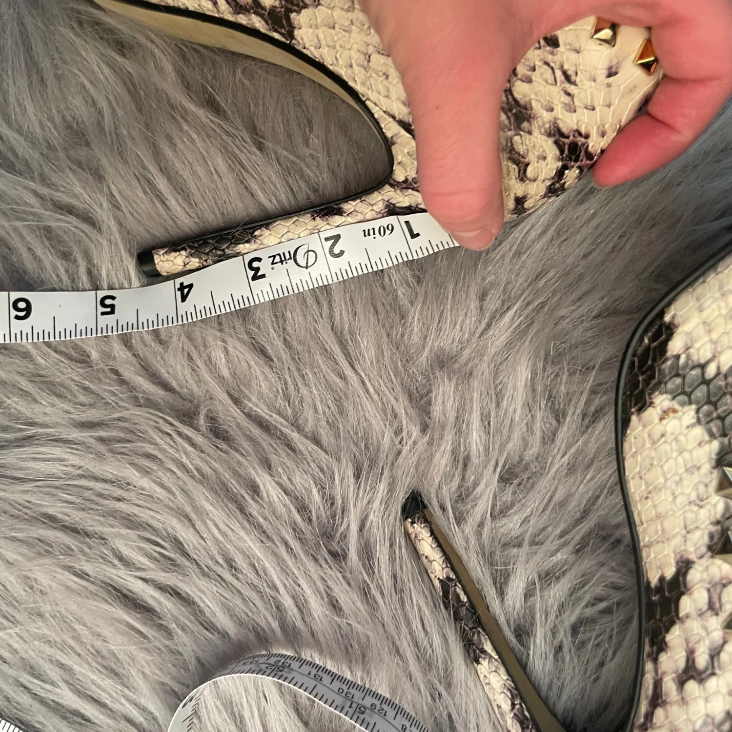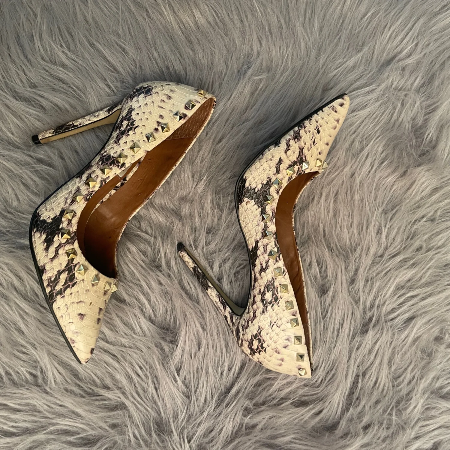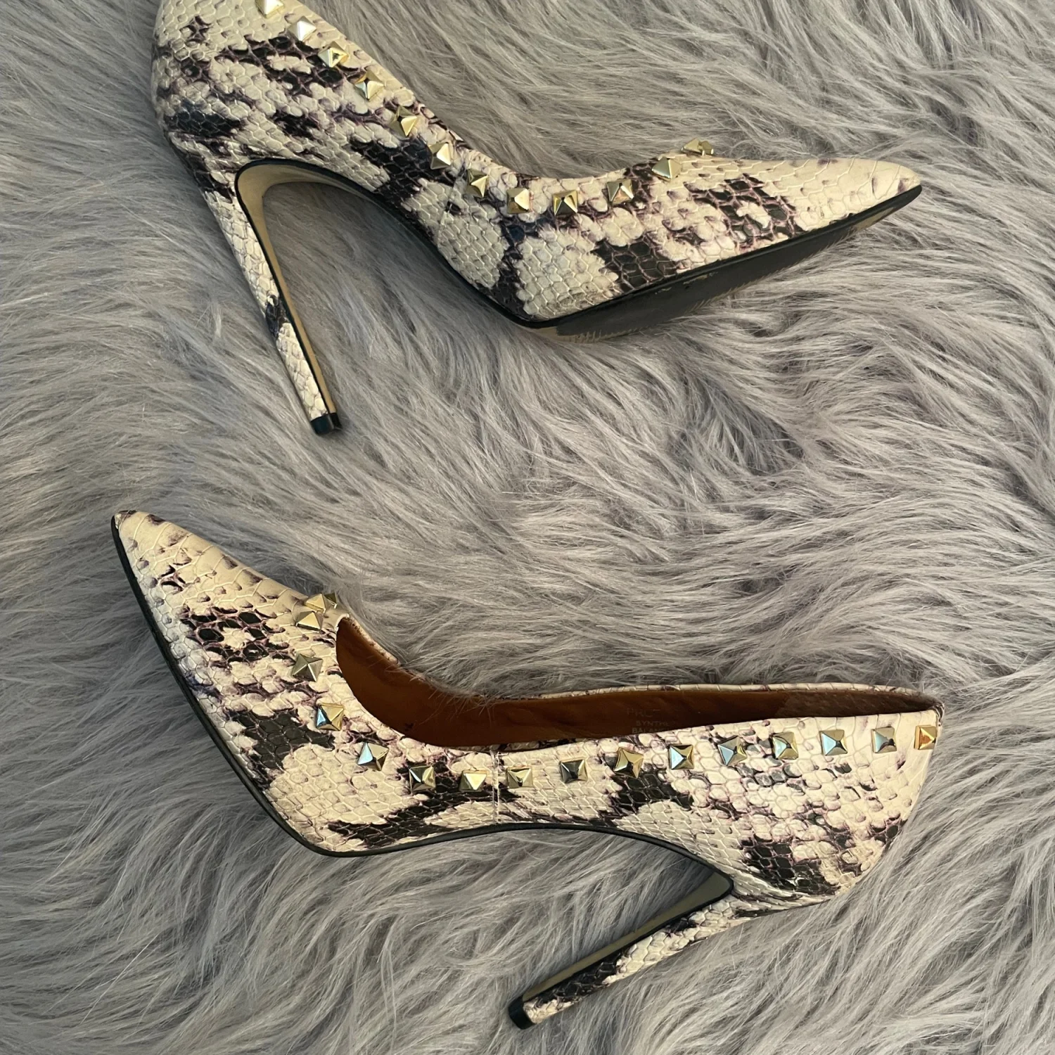 Stylish snakeskin pattern with bold studs. Perfect for a night out. Minor cracking inside shoes. Some of gold wearing off in ends of studs. Forgot to take photo of. Please ask if you’d like a photo to see.