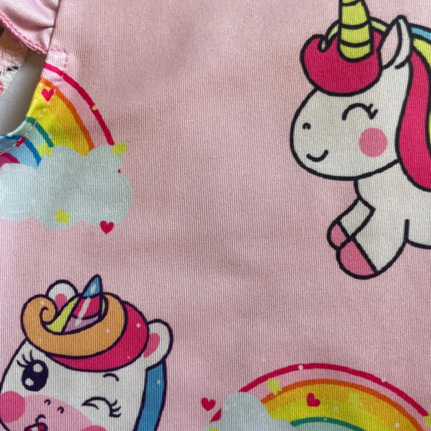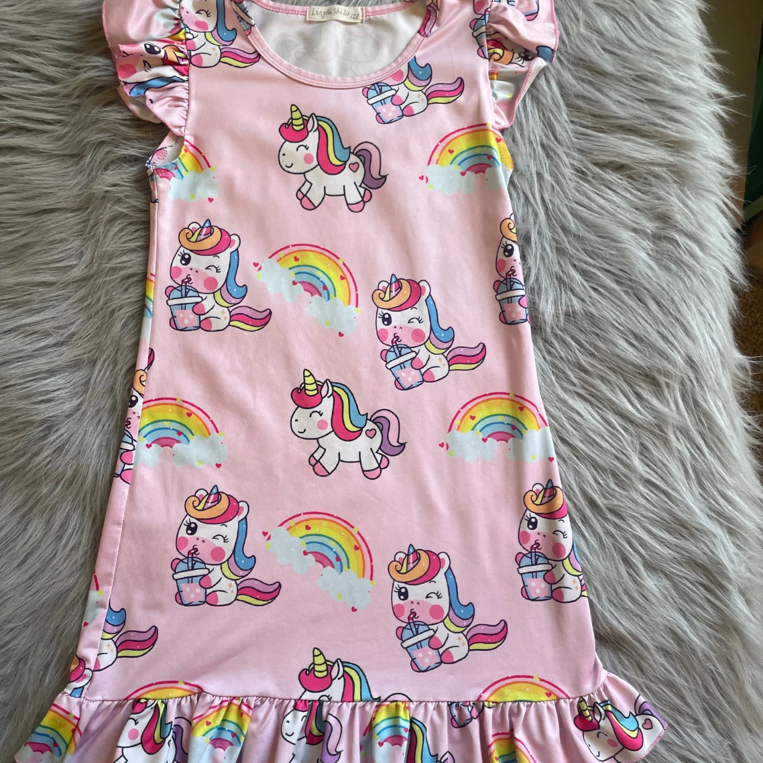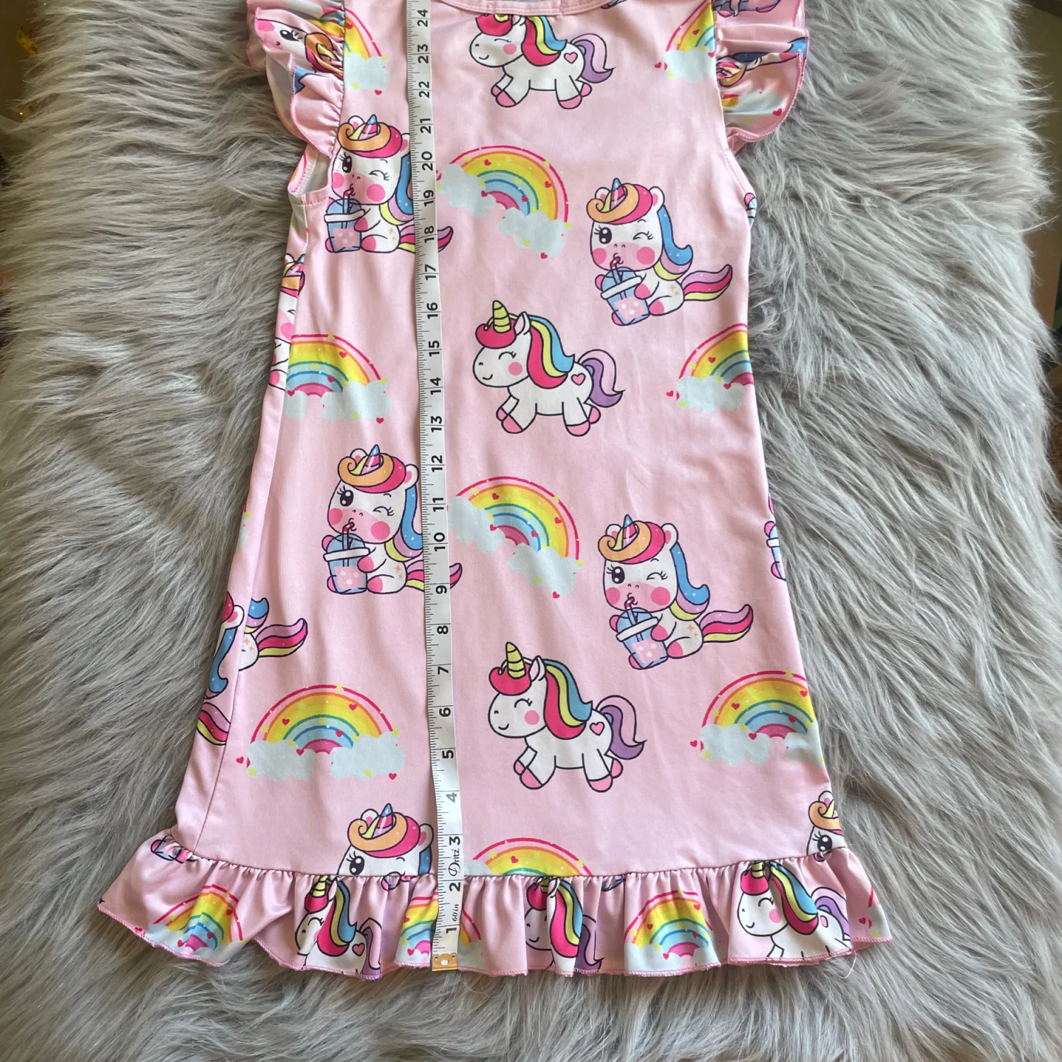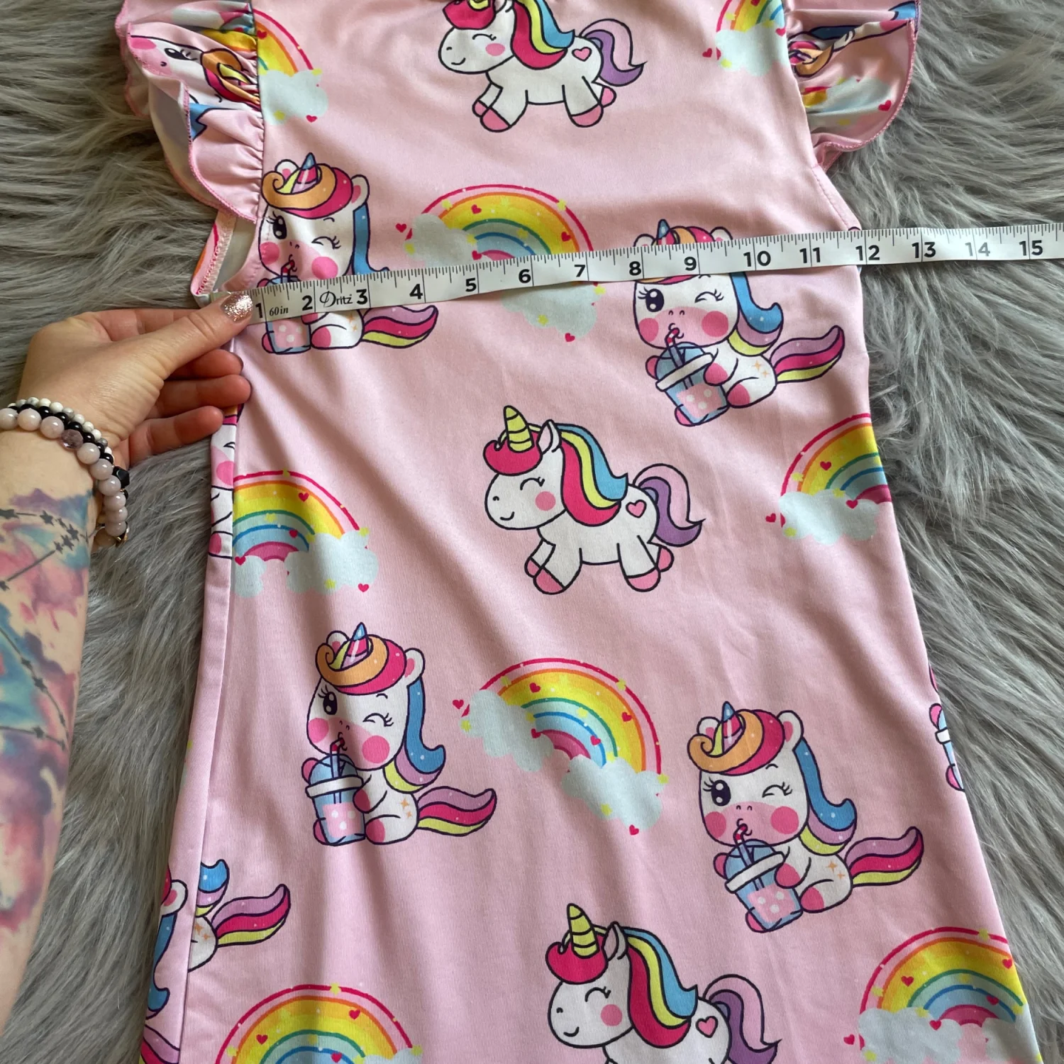 Soft pink nightgown with all-over unicorn and rainbow print. Flutter sleeves and ruffle hem. Cute, playful pattern perfect for bedtime. Very minor pilling in several spots 120cm is 7-8yrs