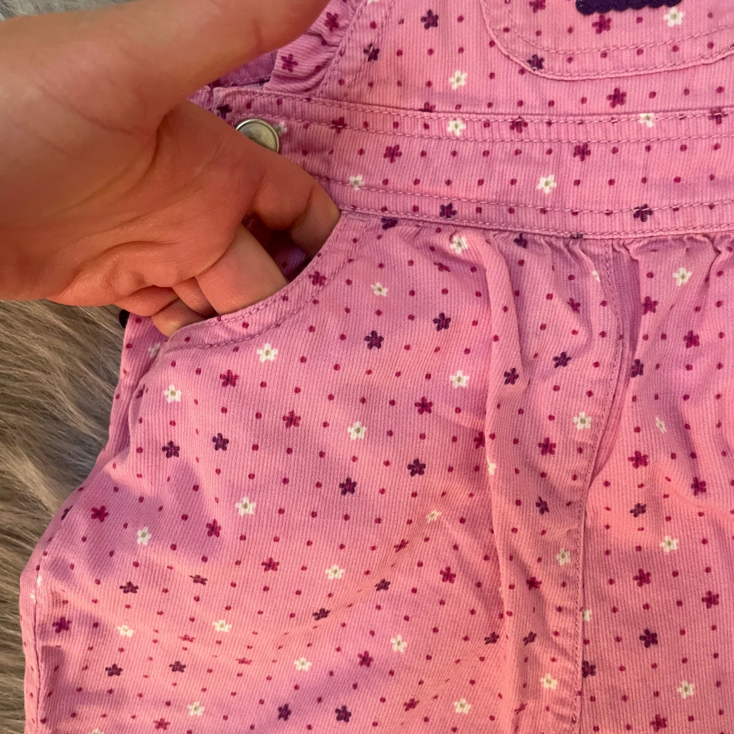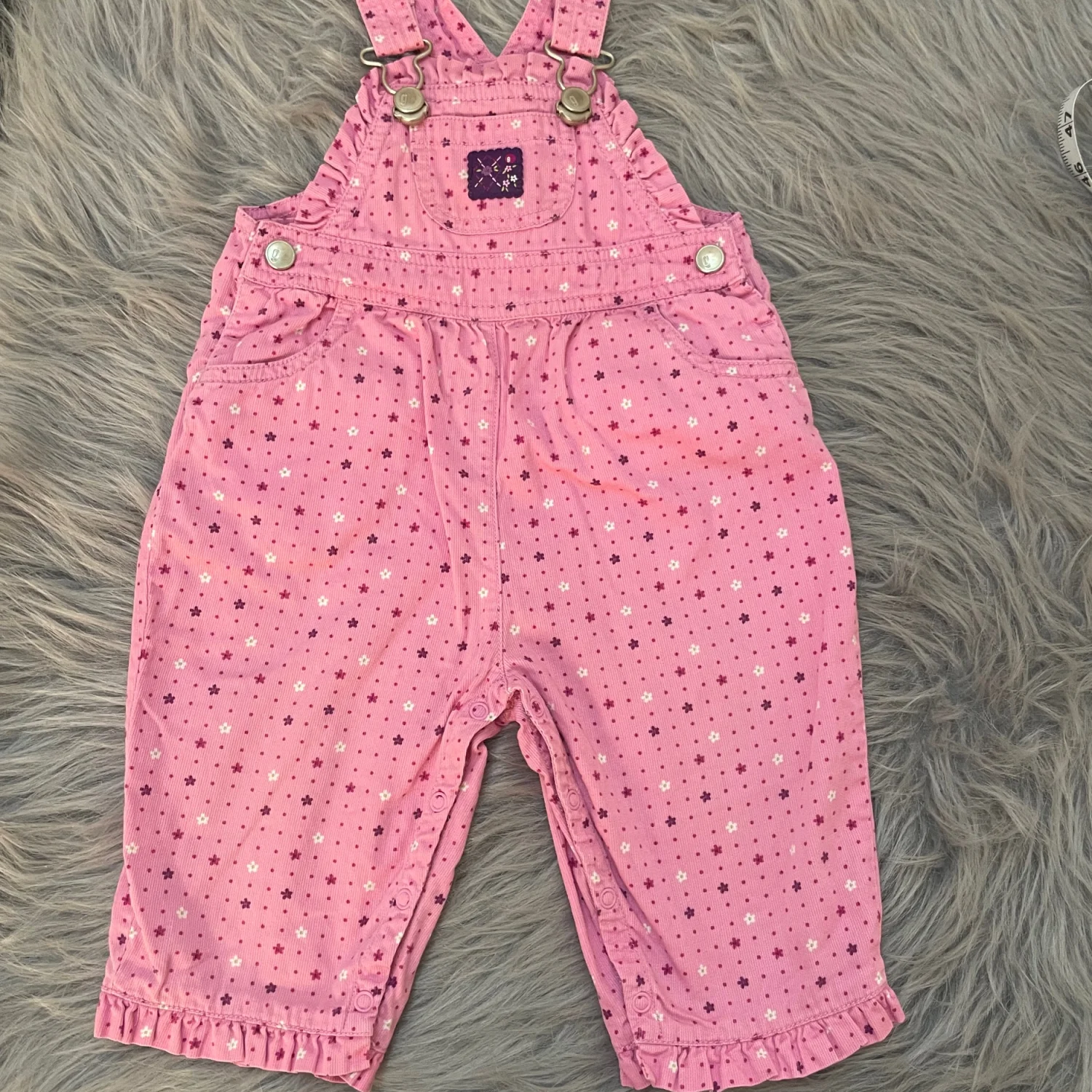 Soft pink overalls with all-over star print. Adjustable shoulder straps with metal hardware. Front chest pocket and side snap closures. Ruffled leg hems add sweet detail. In perfect condition, wrinkled strap, some wrinkles 6-12M