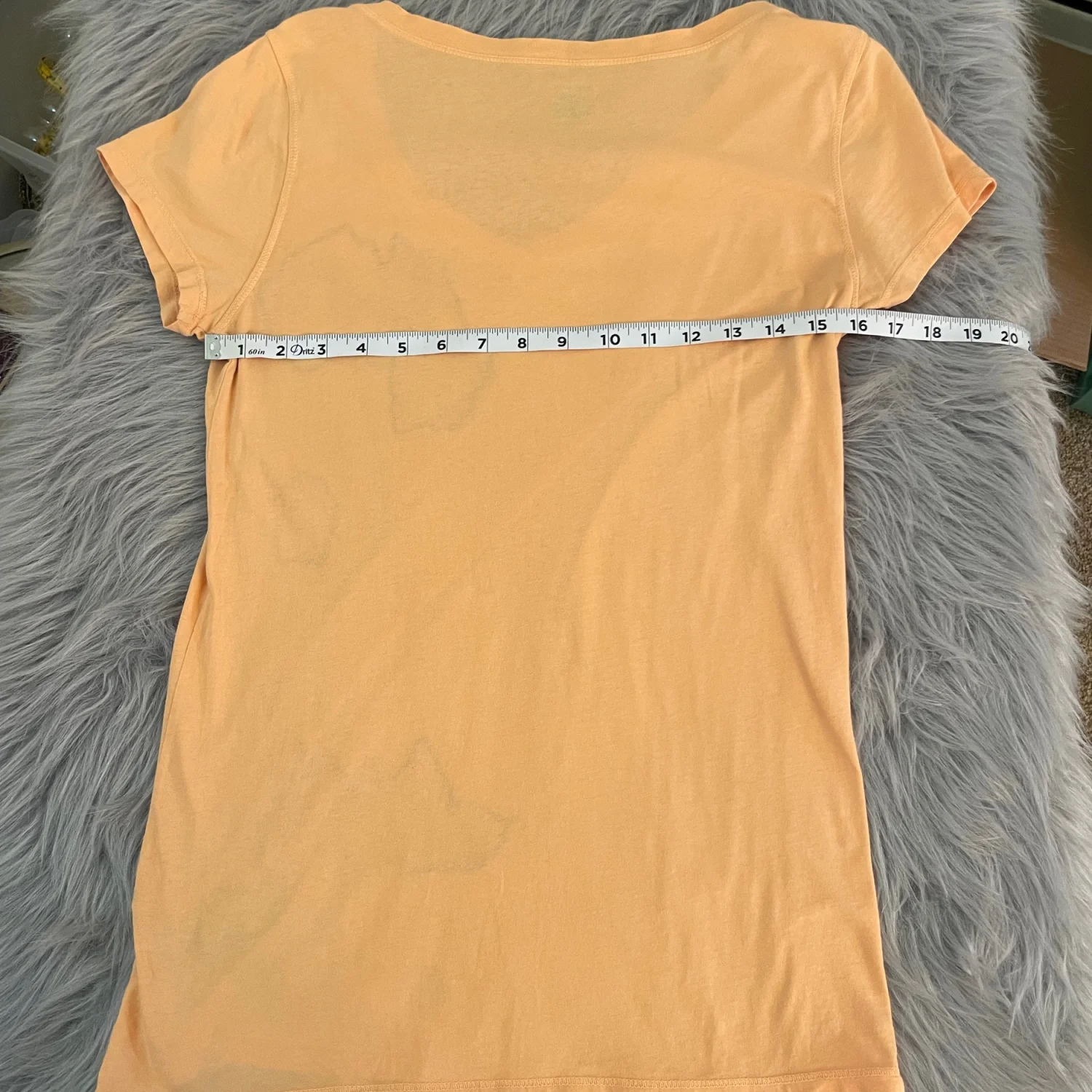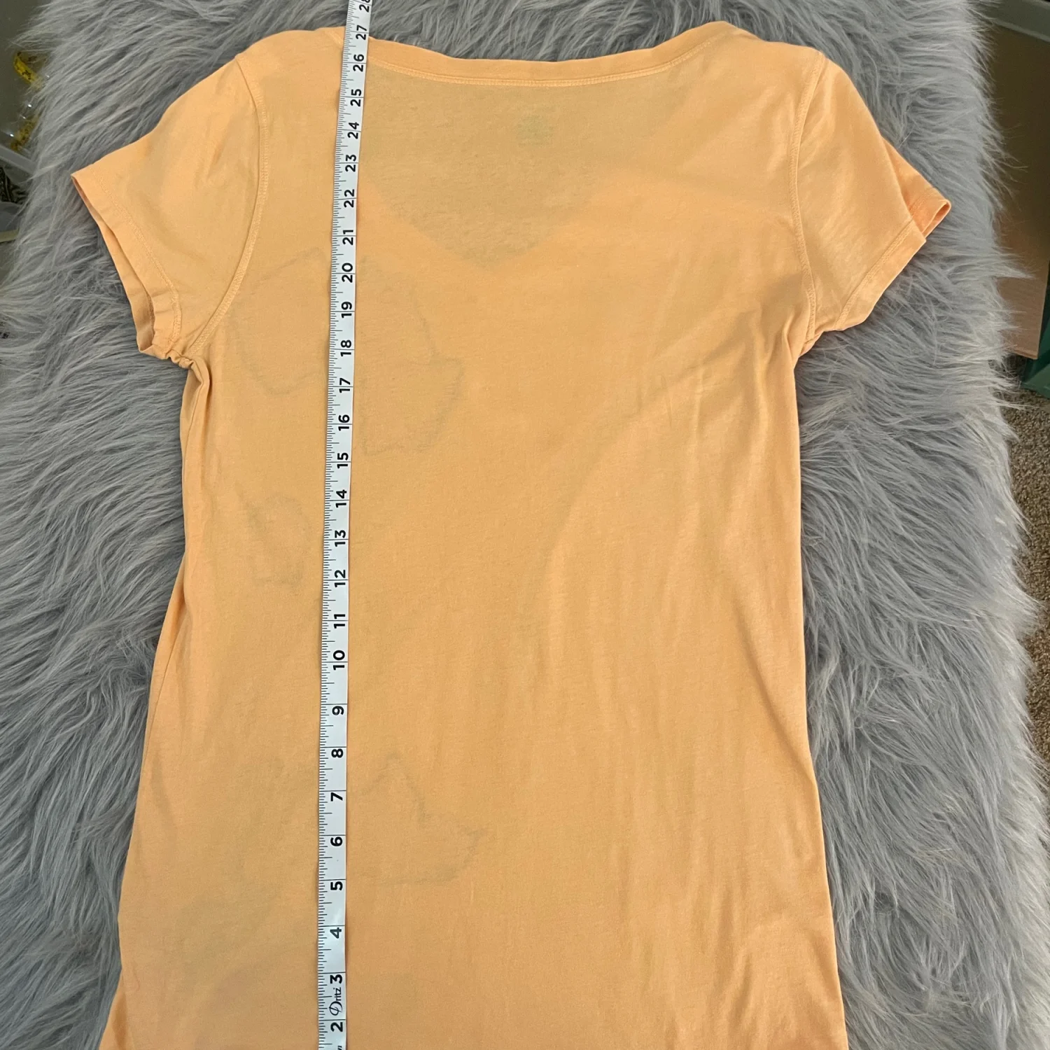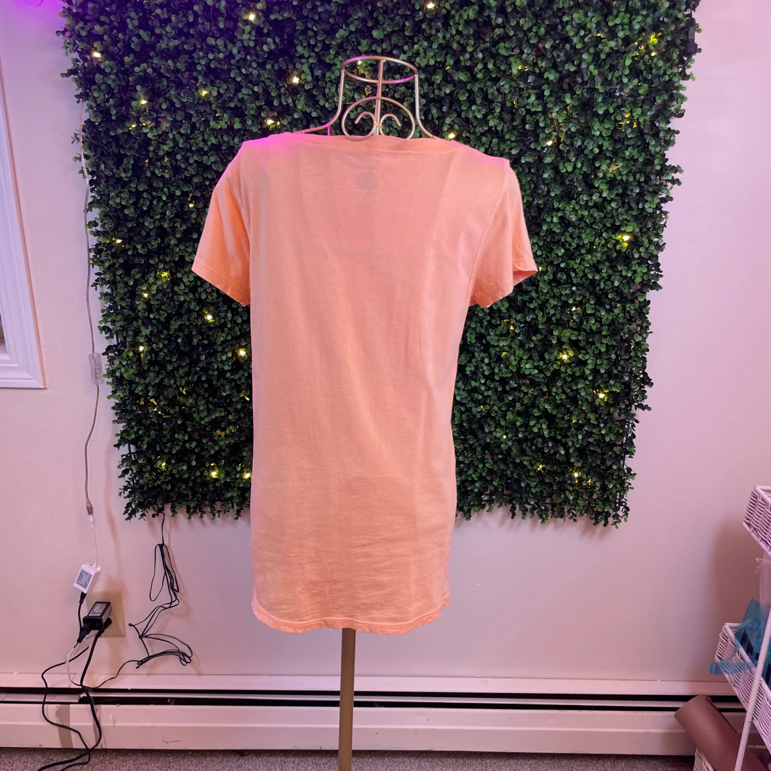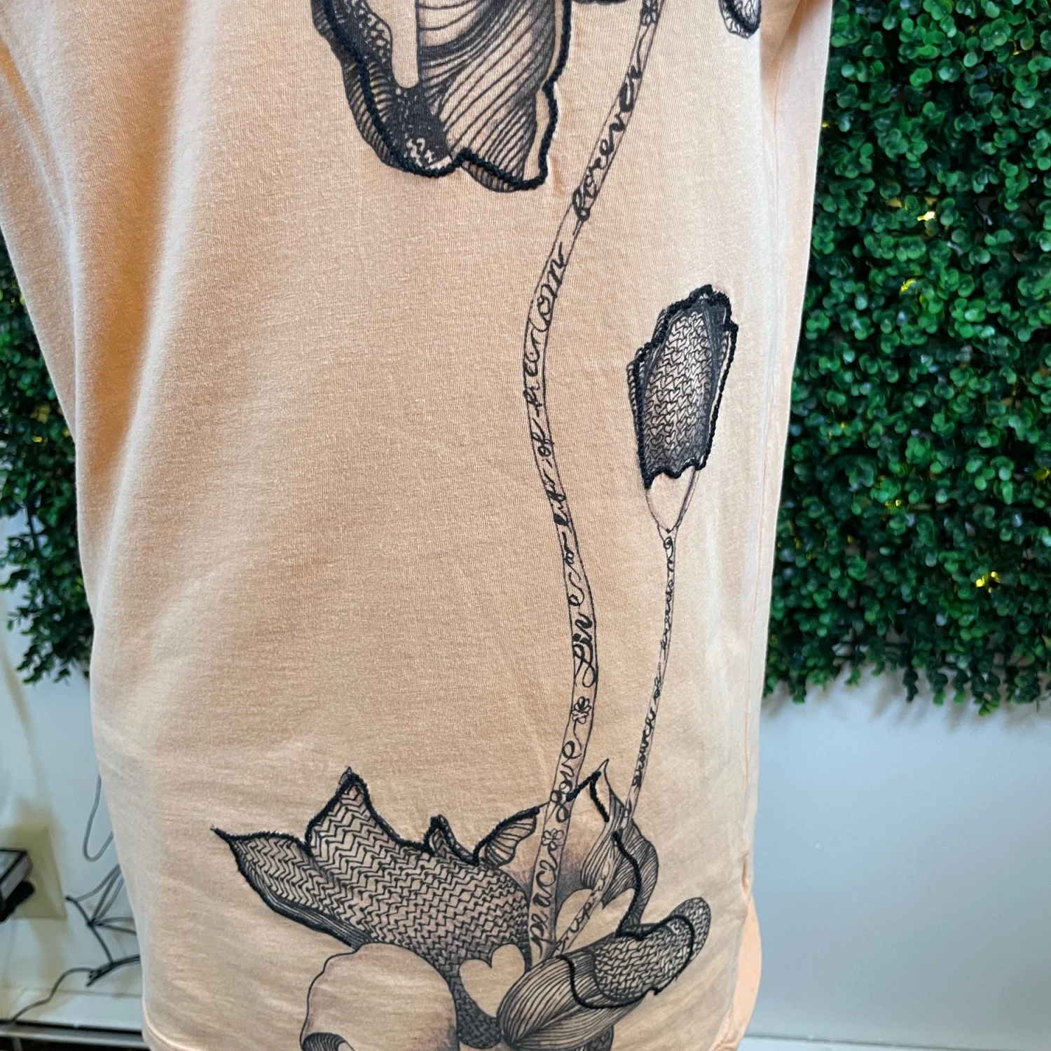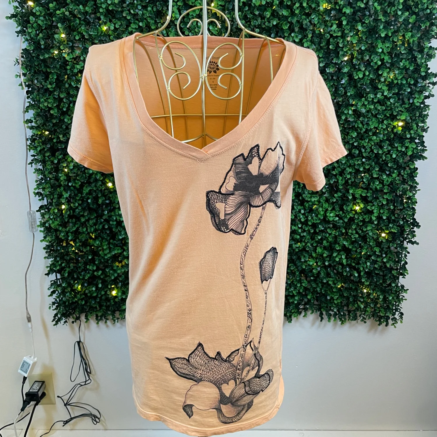V-neck short sleeve top in a peach hue. Black floral graphic runs down the front. Relaxed, feminine silhouette. Easy to style for casual wear. First picture best reflects the peachish/orangish color of the tee.