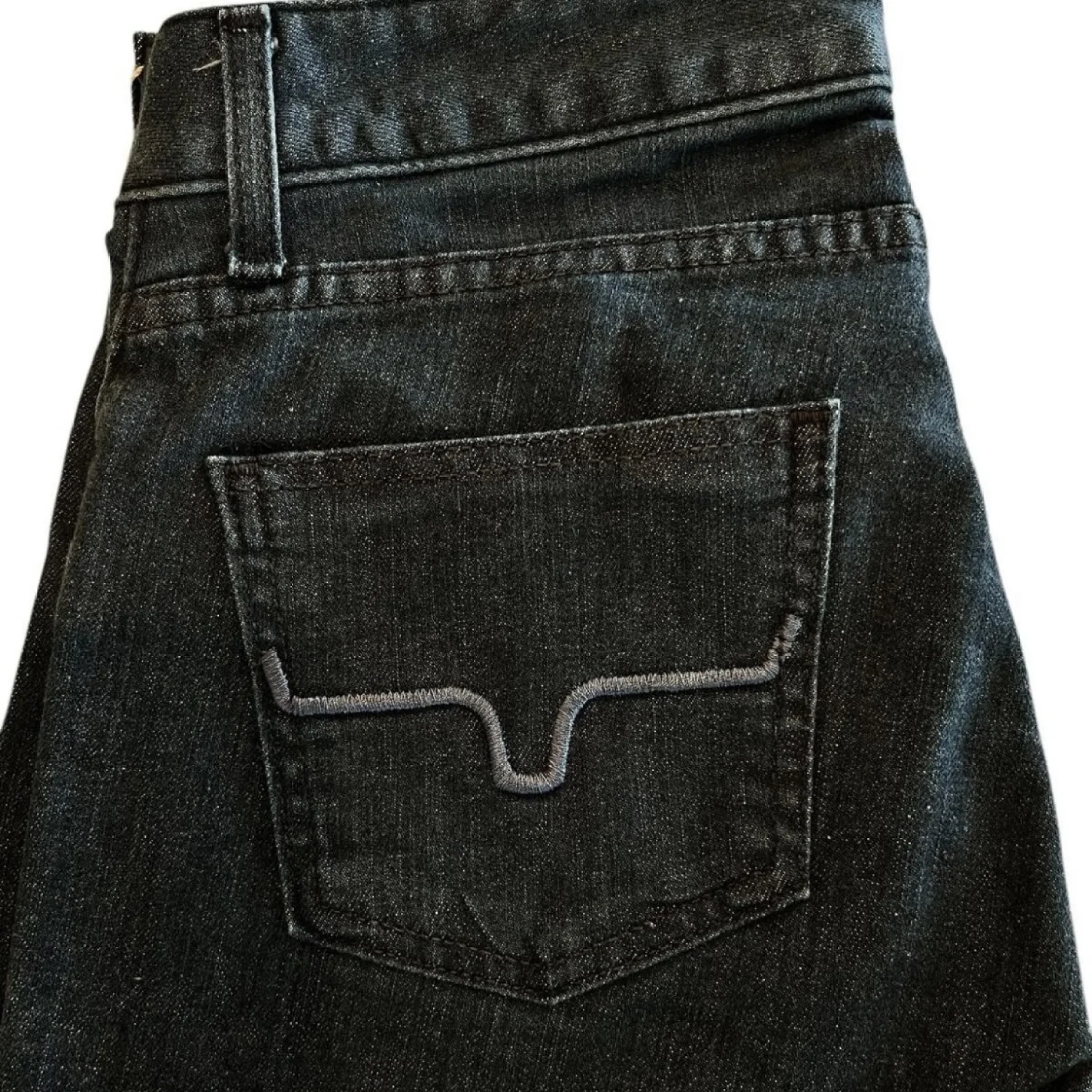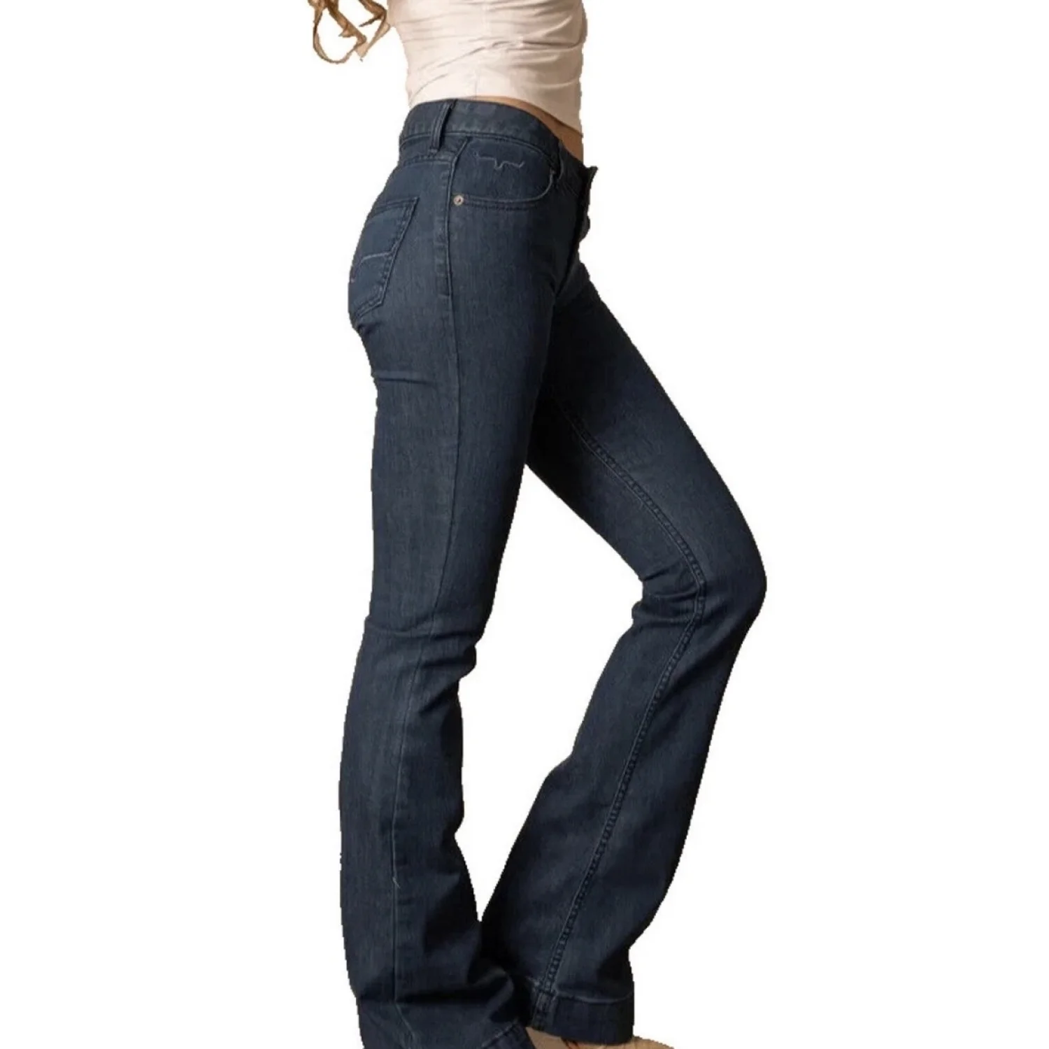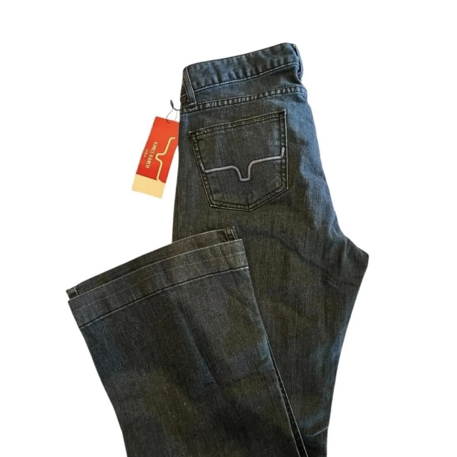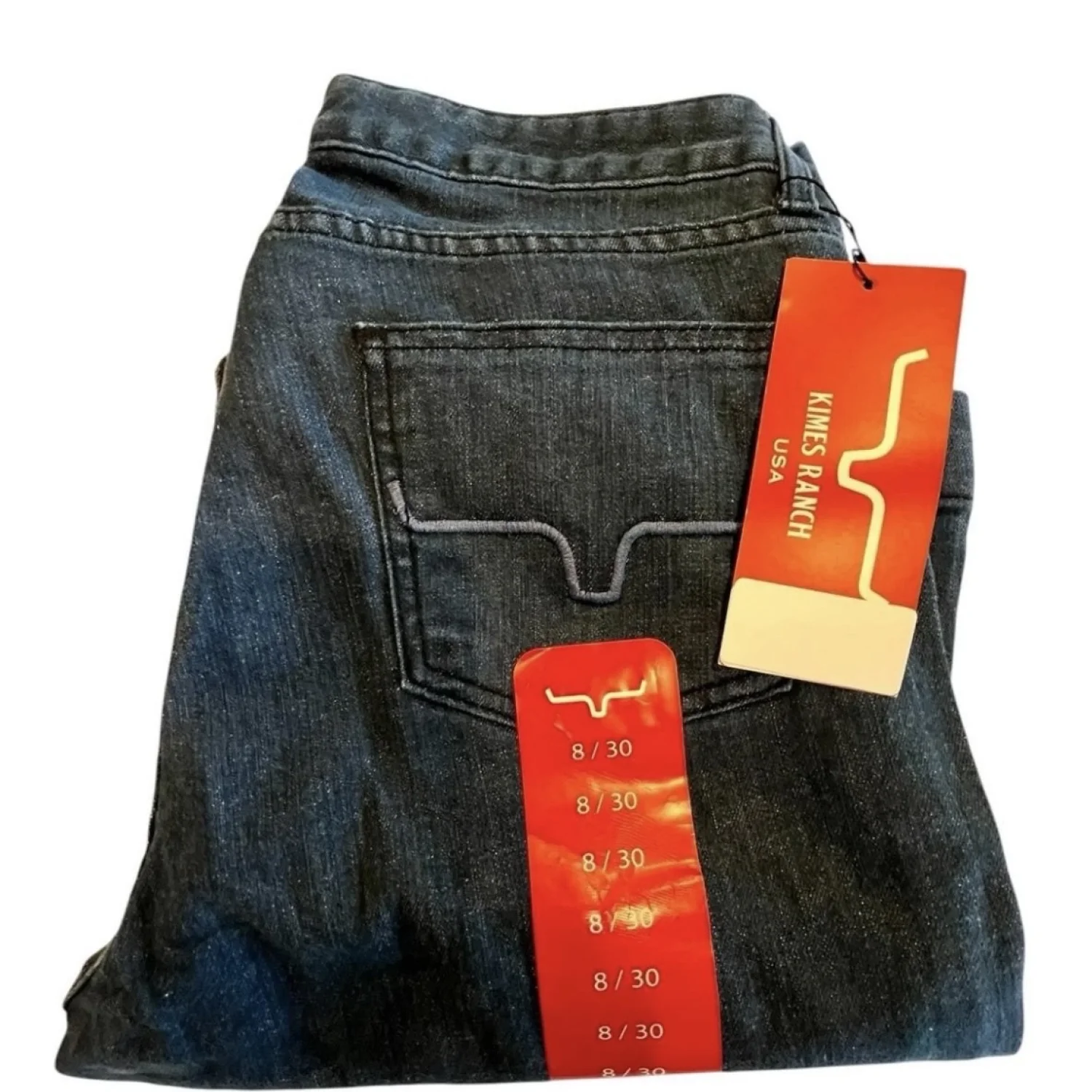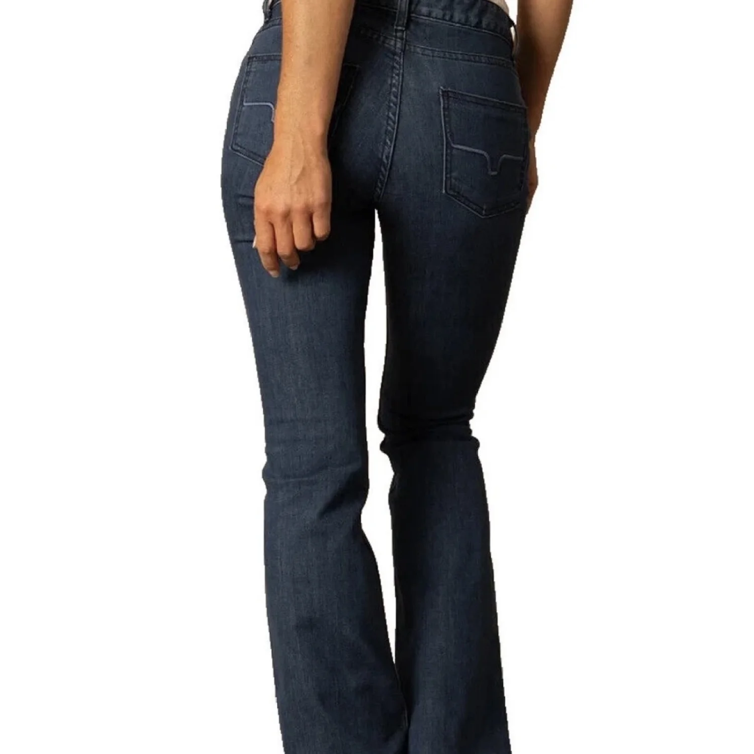 Kimes Ranch Lola jeans in a dark denim wash. Kimes Ranch Jeans Womens Lola NEW With TAGS SZ 8X30 Dark Blue Indigo Flared Cut Trouser Cuff Mid Rise 2598.2 Flare leg/Boot cut- Mid rise/trouser fit, Flare. Fitted through thigh 93% cotton, 6% Polyester, 1% Elastine Approximate measurements Waist 30" Inseam 30" Rise 8 1/2"