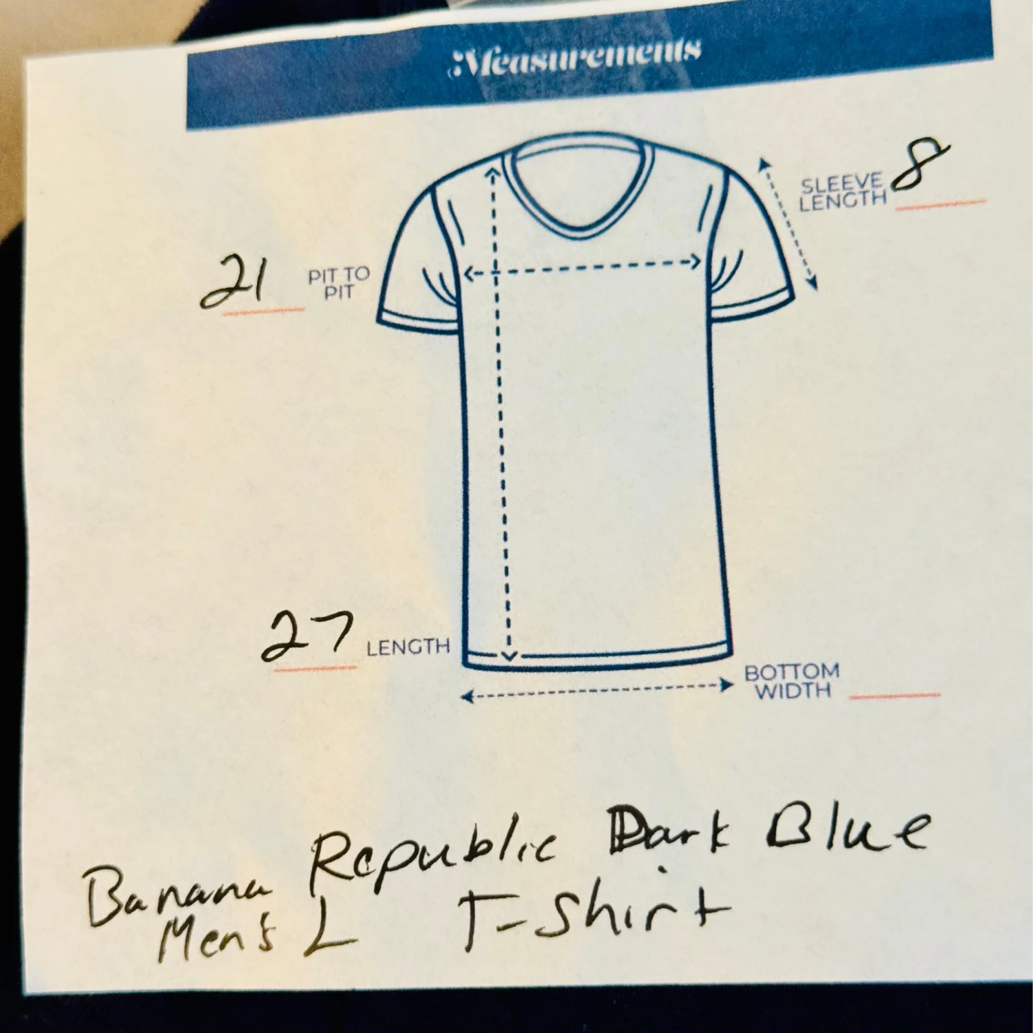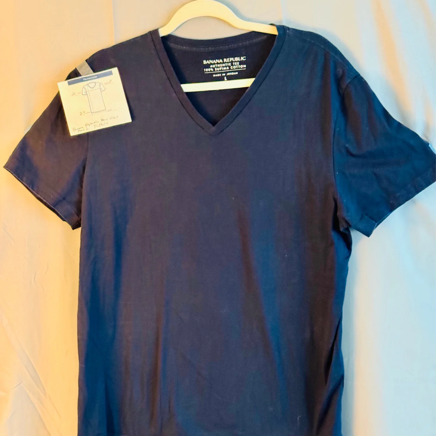 Banana Republic Authentic Tee made from 100% Supima Cotton. This men's t-shirt features a classic v-neck design in a dark blue color. Size L, with measurements of 21 inches pit to pit and 27 inches in length. Perfect for casual wear. #BananaRepublic #Supima #CasualWear