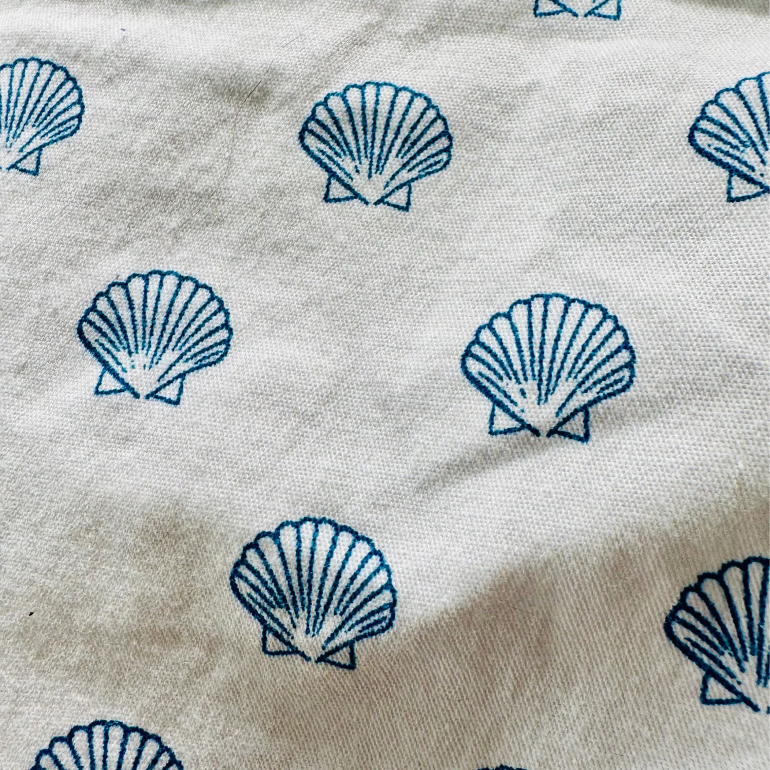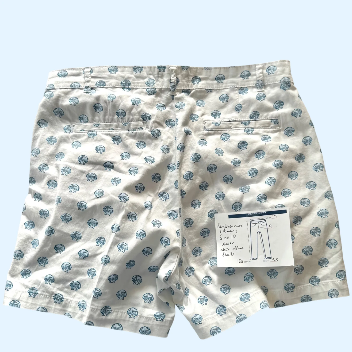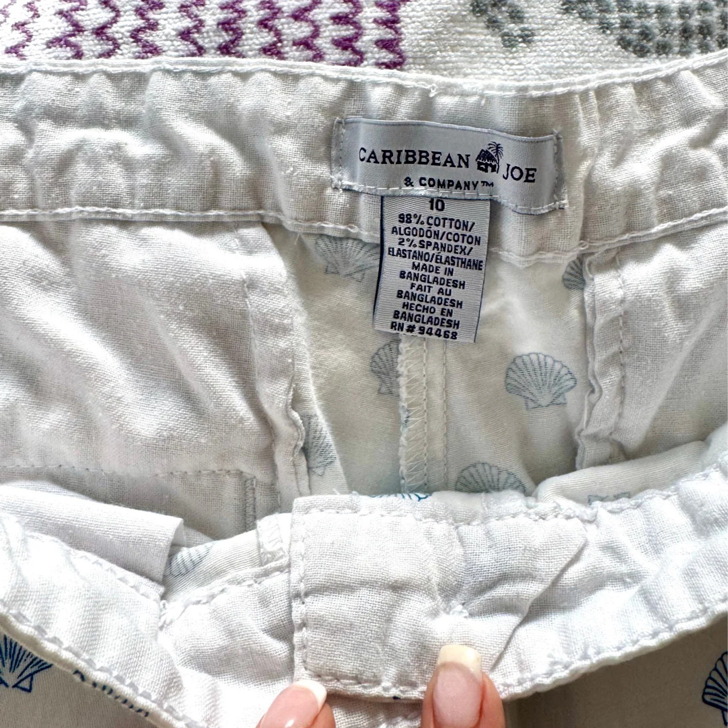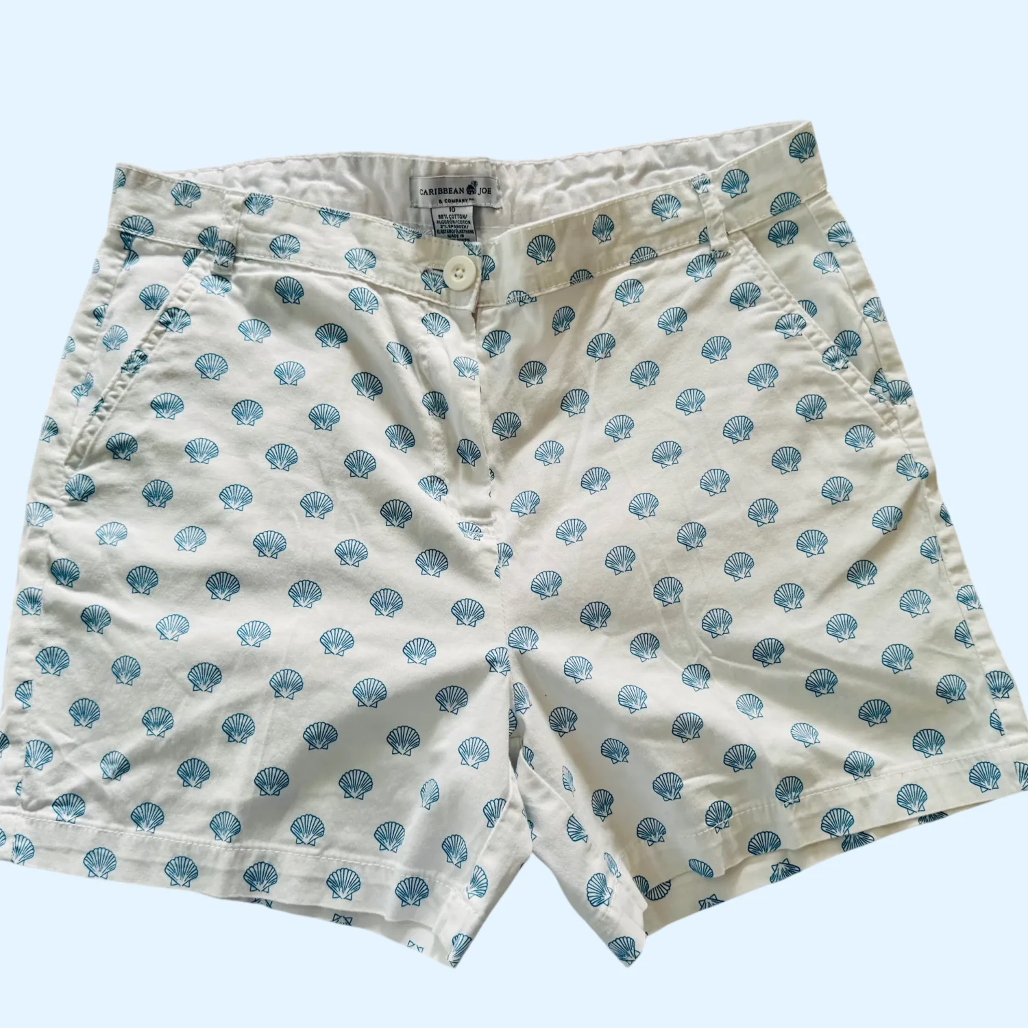 White shorts with a playful blue seashell print by Caribbean Joe. Made from 98% cotton and 2% spandex for added comfort and slight stretch. Features two front pockets and two back pockets. Perfect for a casual summer day at the beach or a stroll in the park. Size 10 with inseam of 5.5 inches. #Casual #Beachwear #SummerStyle