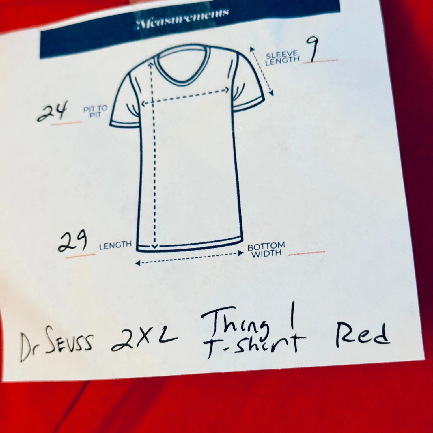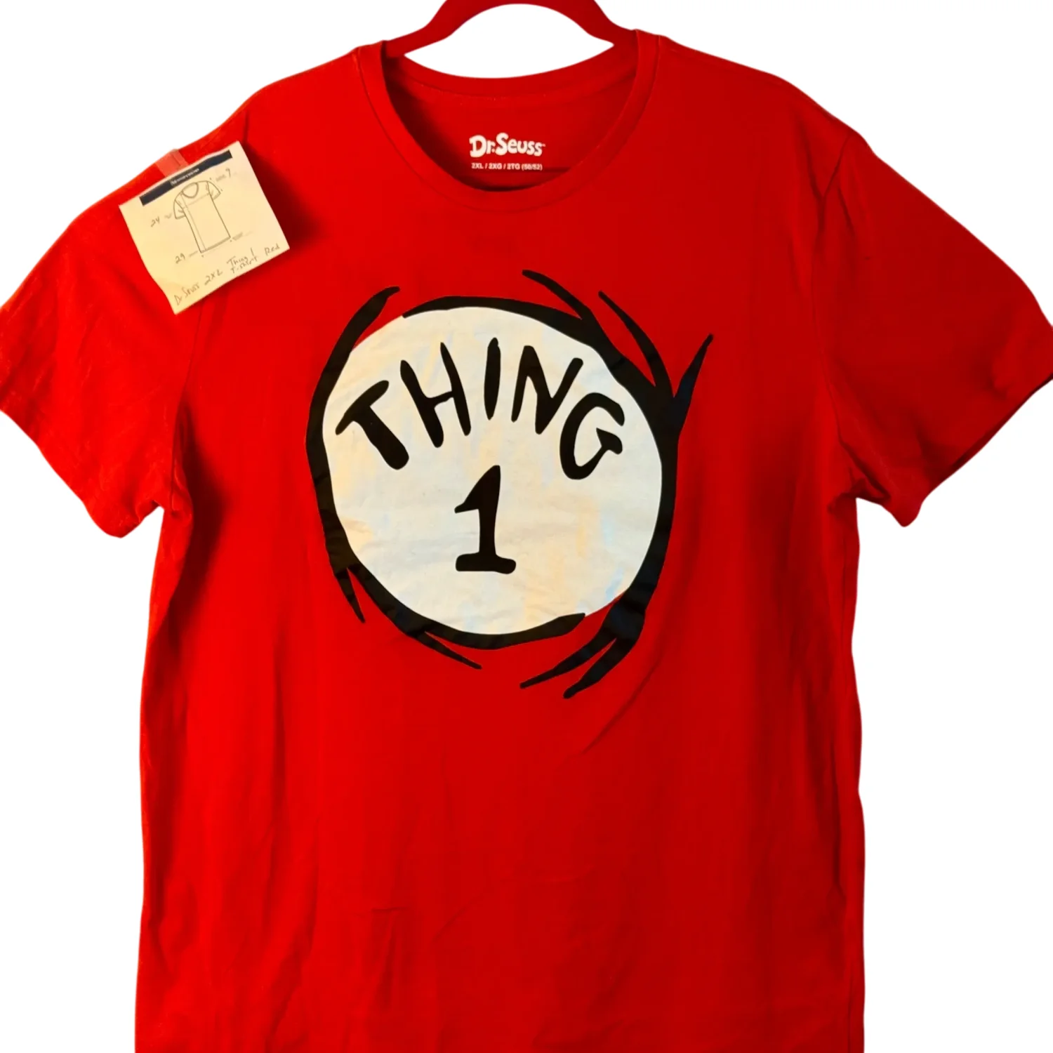 Red Dr. Seuss 'Thing 1' T-shirt featuring a bold graphic on the front. Made from comfortable cotton fabric. Perfect for fans of the classic character. Size 2XL as per measurements on tag. #DrSeuss #GraphicTee
