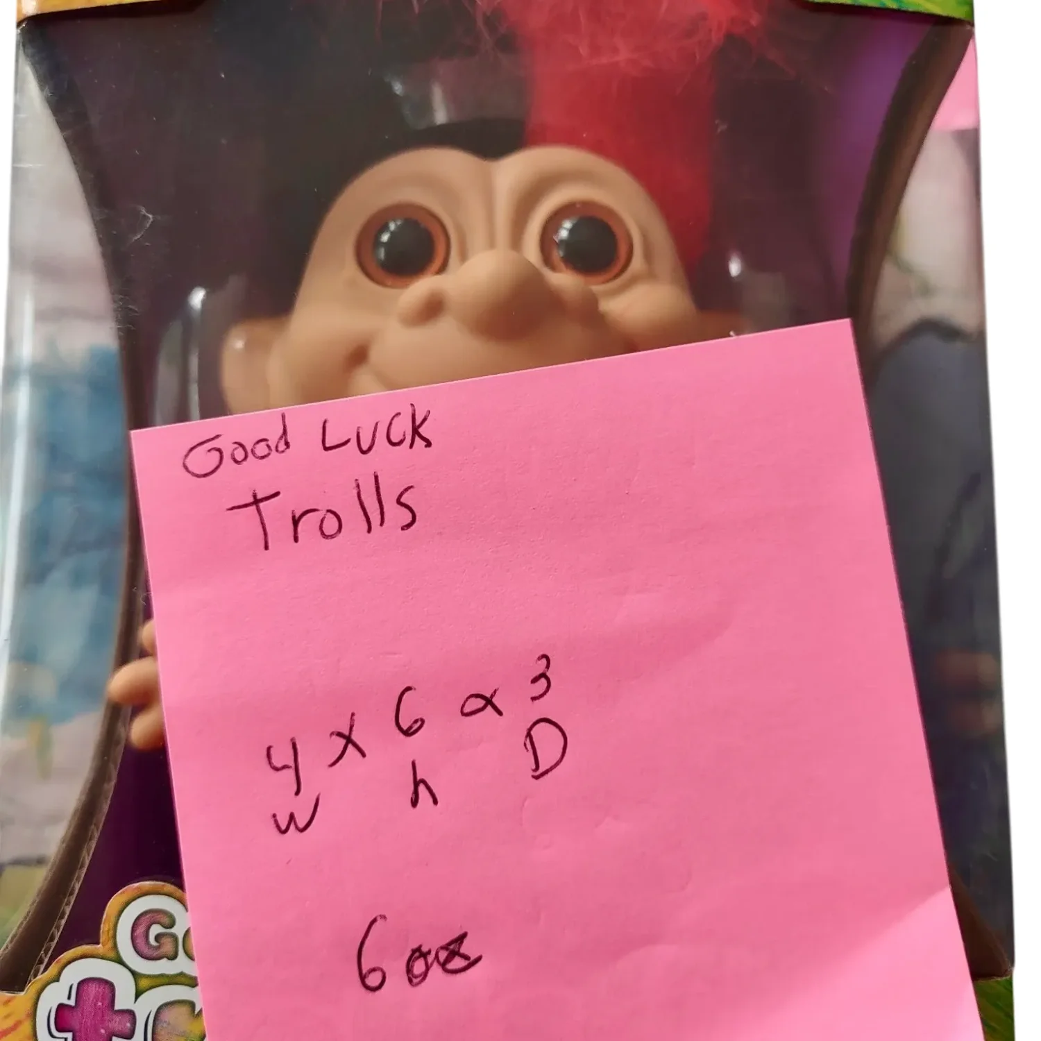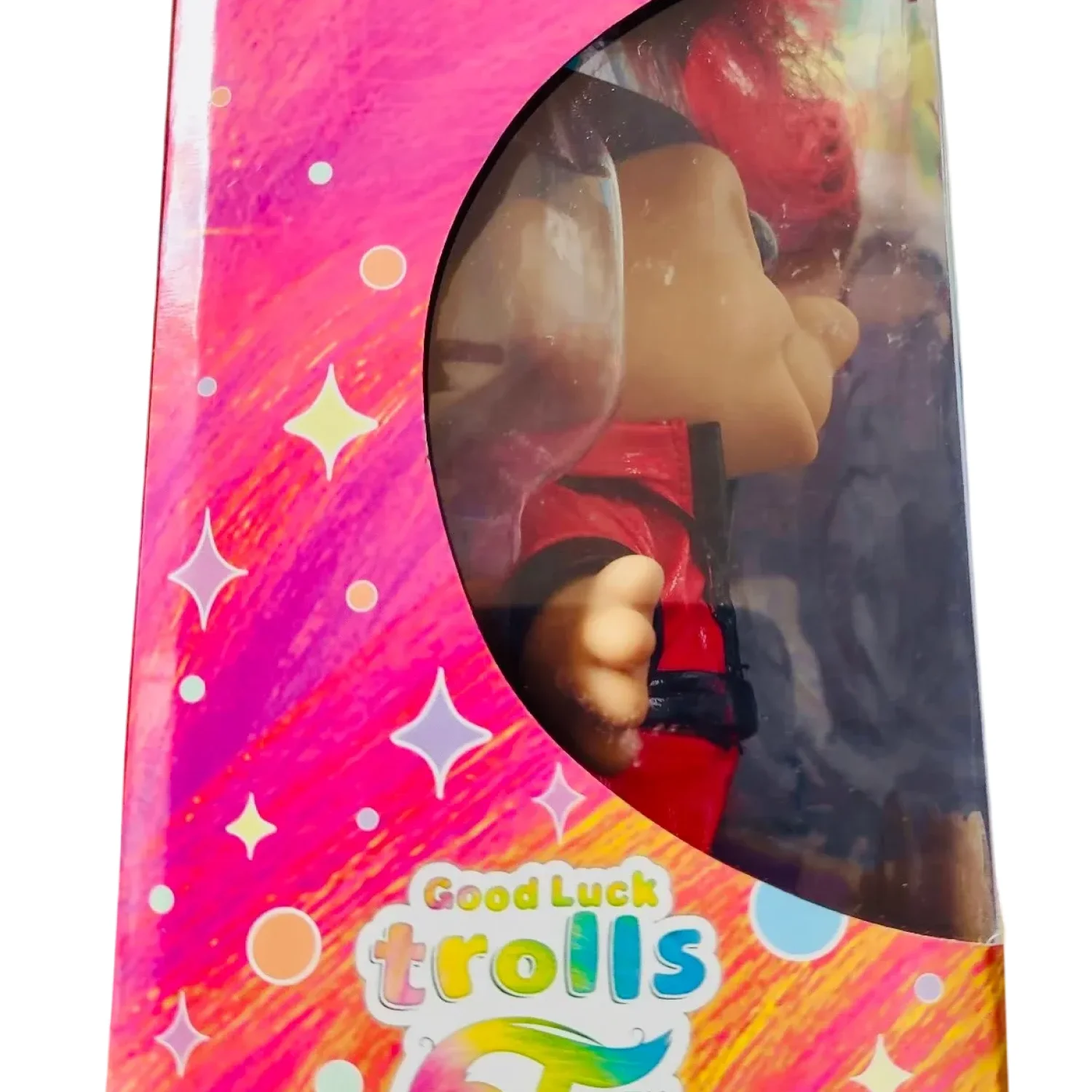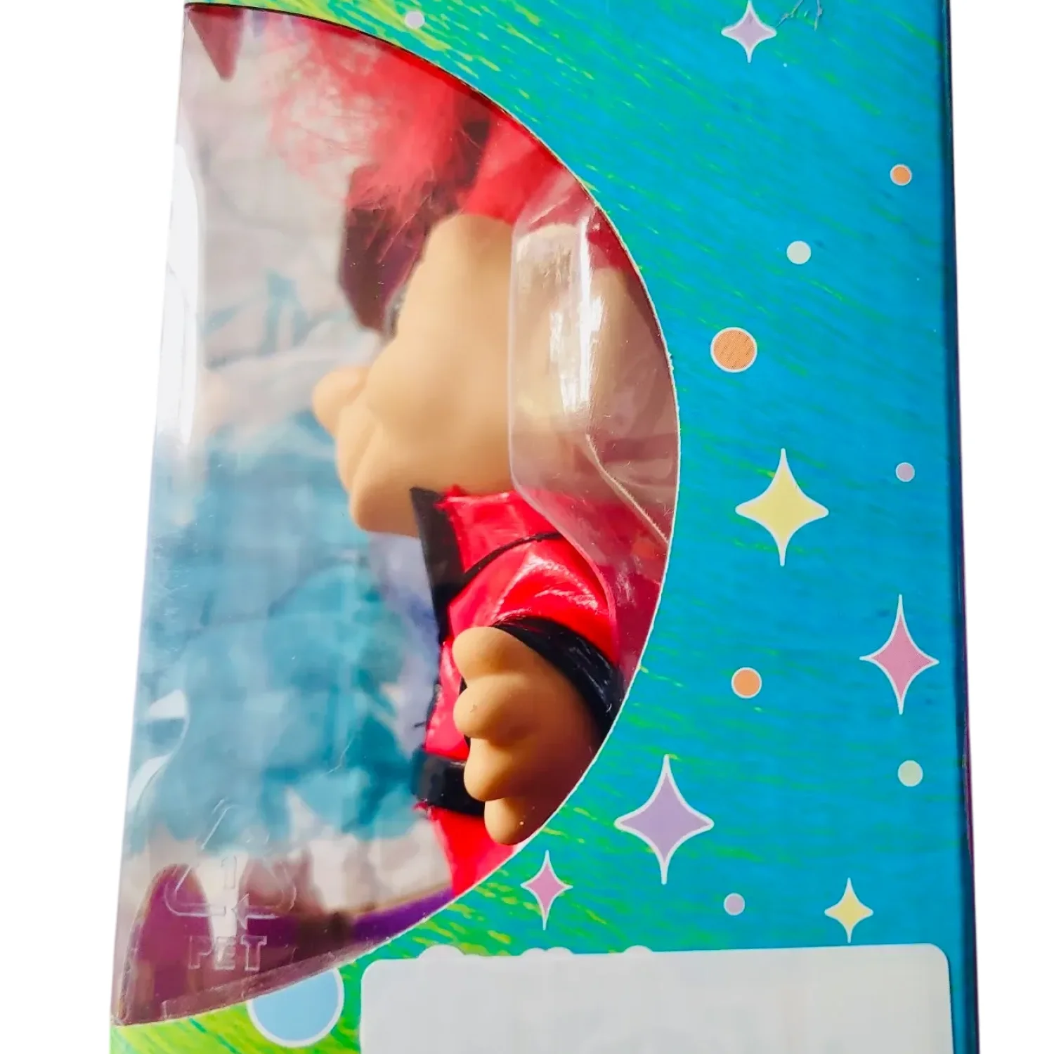 Celebrate the 65th Anniversary of Good Luck Trolls with this special edition Red Leather Troll. The troll features vibrant red and black hair and is dressed in a striking red leather outfit. Comes in original packaging with a 'Rub My Belly Gem for Good Luck!' feature. Perfect for collectors and fans of the classic troll dolls. Made by Headstart International, officially licensed by DreamWorks. #collectible #trolls #anniversaryedition