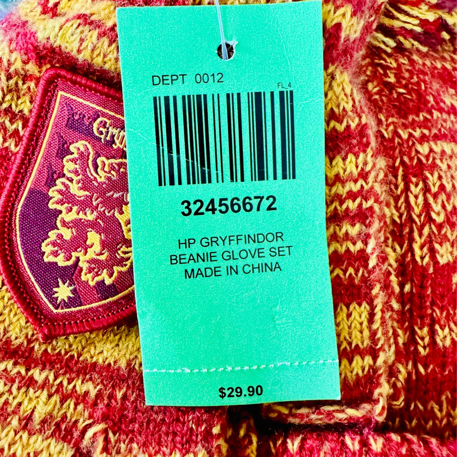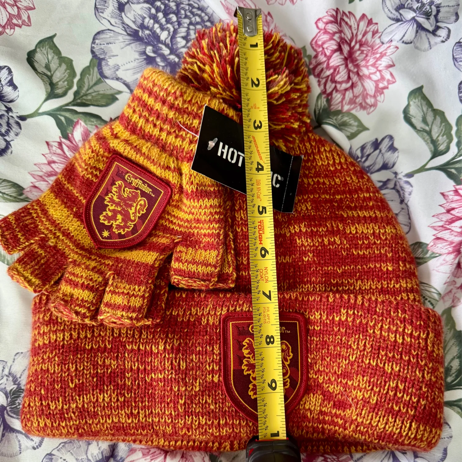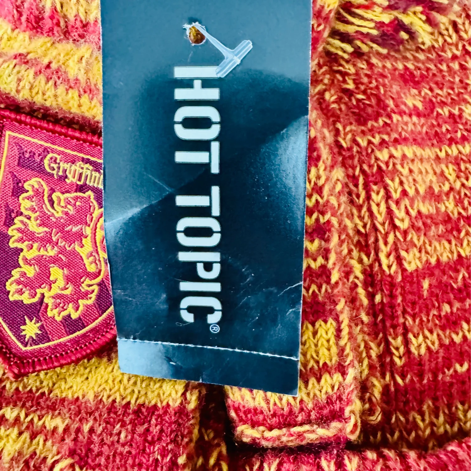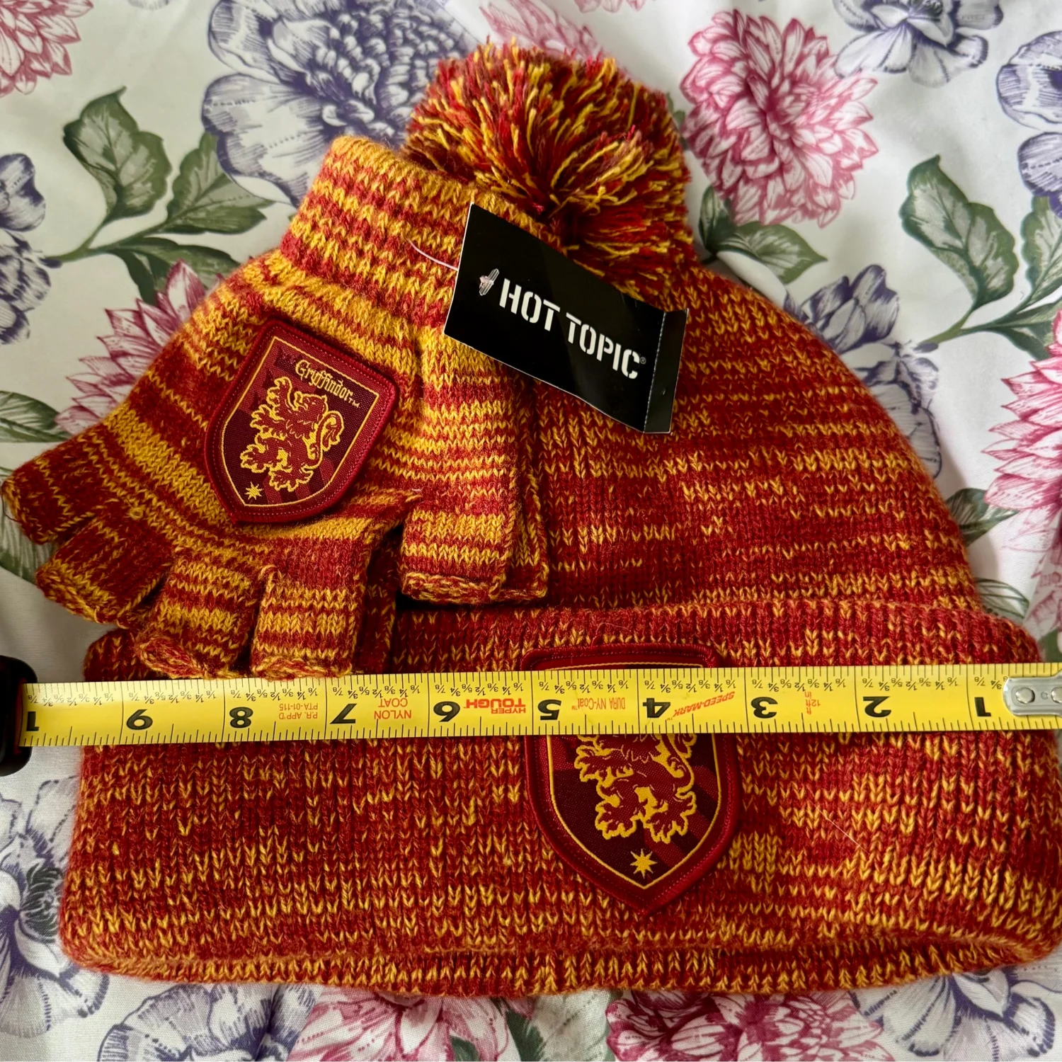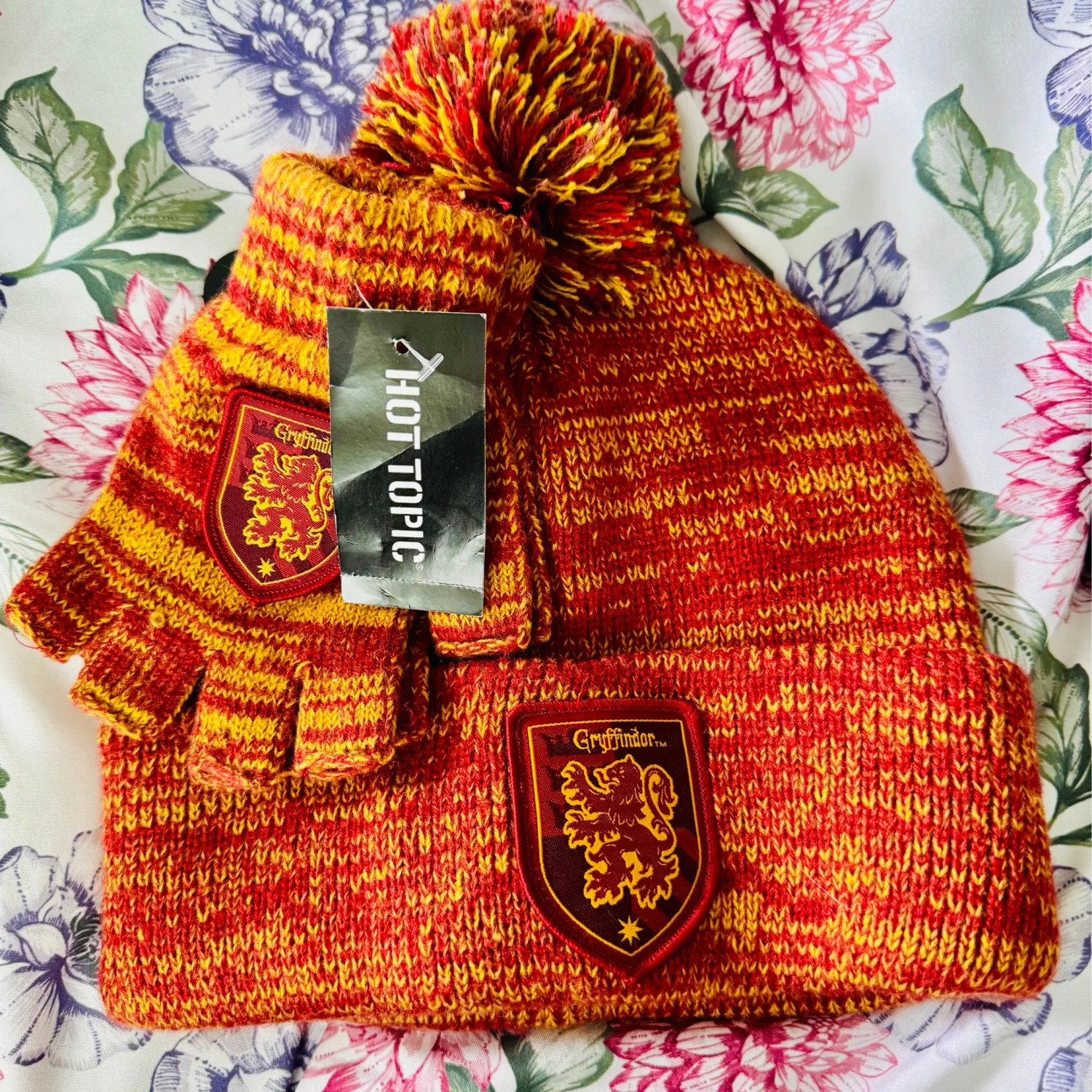This Harry Potter Gryffindor Glove & Beanie Set from Hot Topic is brand new and features a striped pattern. Perfect for both boys and girls, this one-size set includes a multicolor hat and scarf with Gryffindor theme, making it a must-have for any Harry Potter fan. Made of lightweight and stretchy knit fabric, this set is comfortable to wear and adds a touch of magic to any outfit. Ideal for movie enthusiasts and fans of the Harry Potter franchise, this hat and scarf set is a stylish and cozy accessory for any young Potterhead. Brand: Hot Topic. #Gryffindor #HarryPotter #Beanie #Gloves