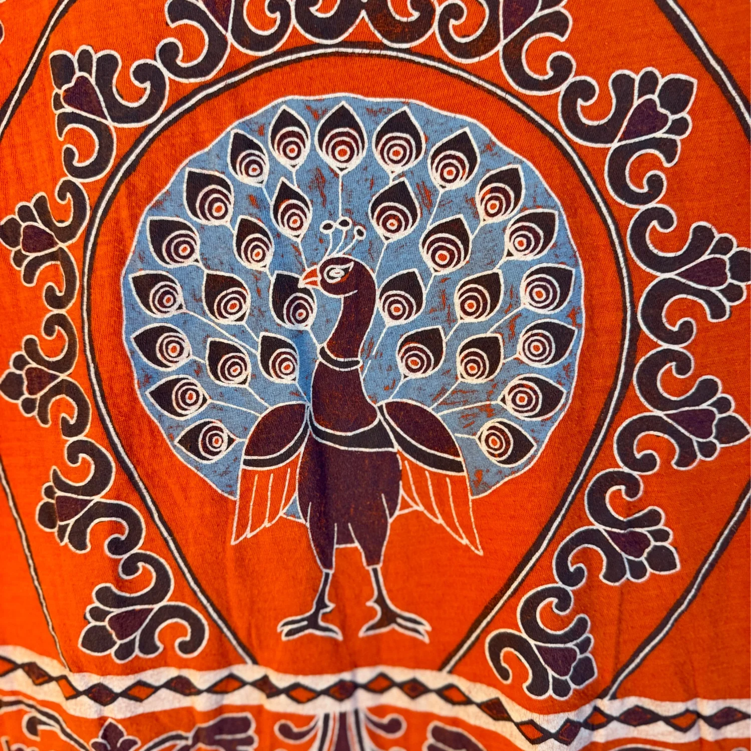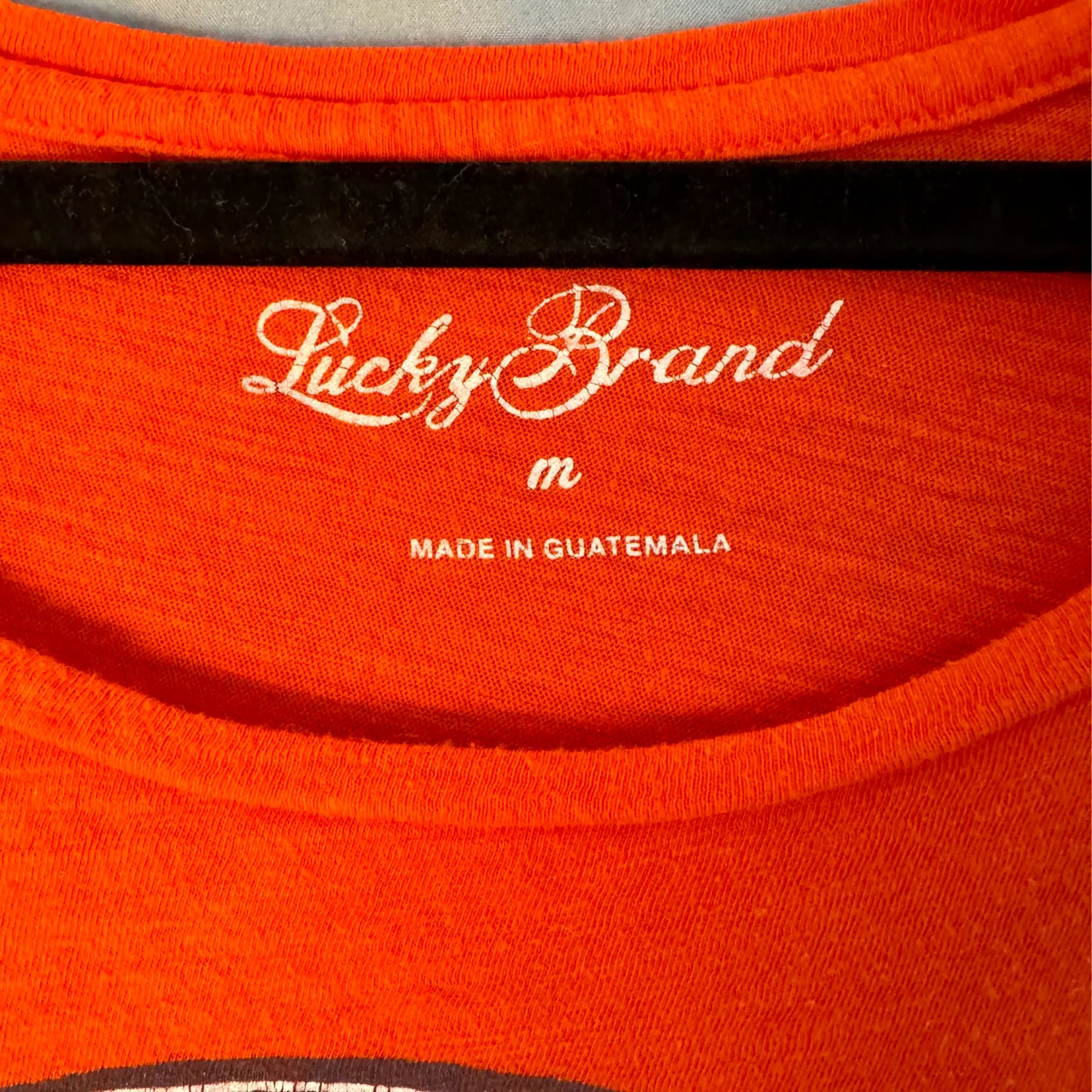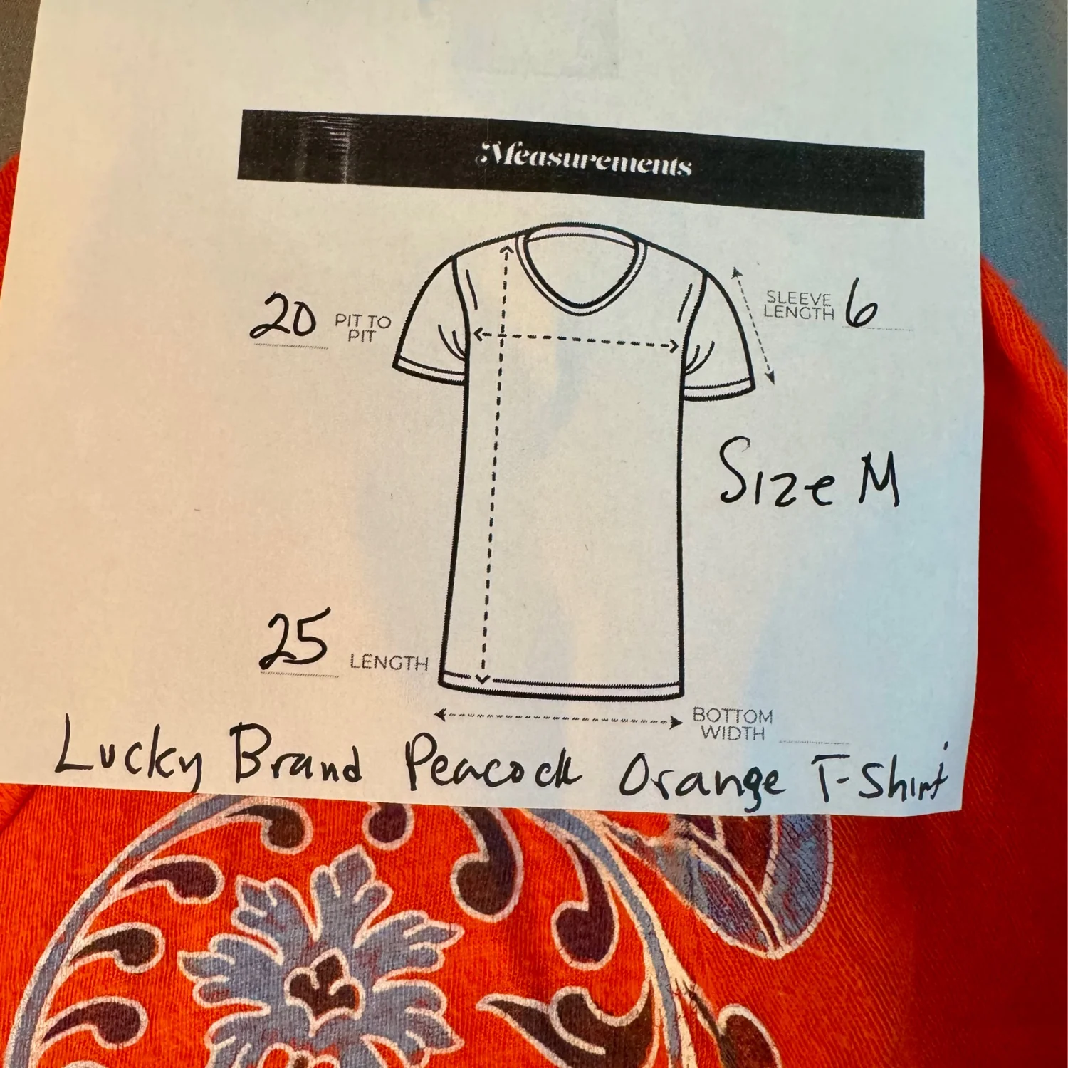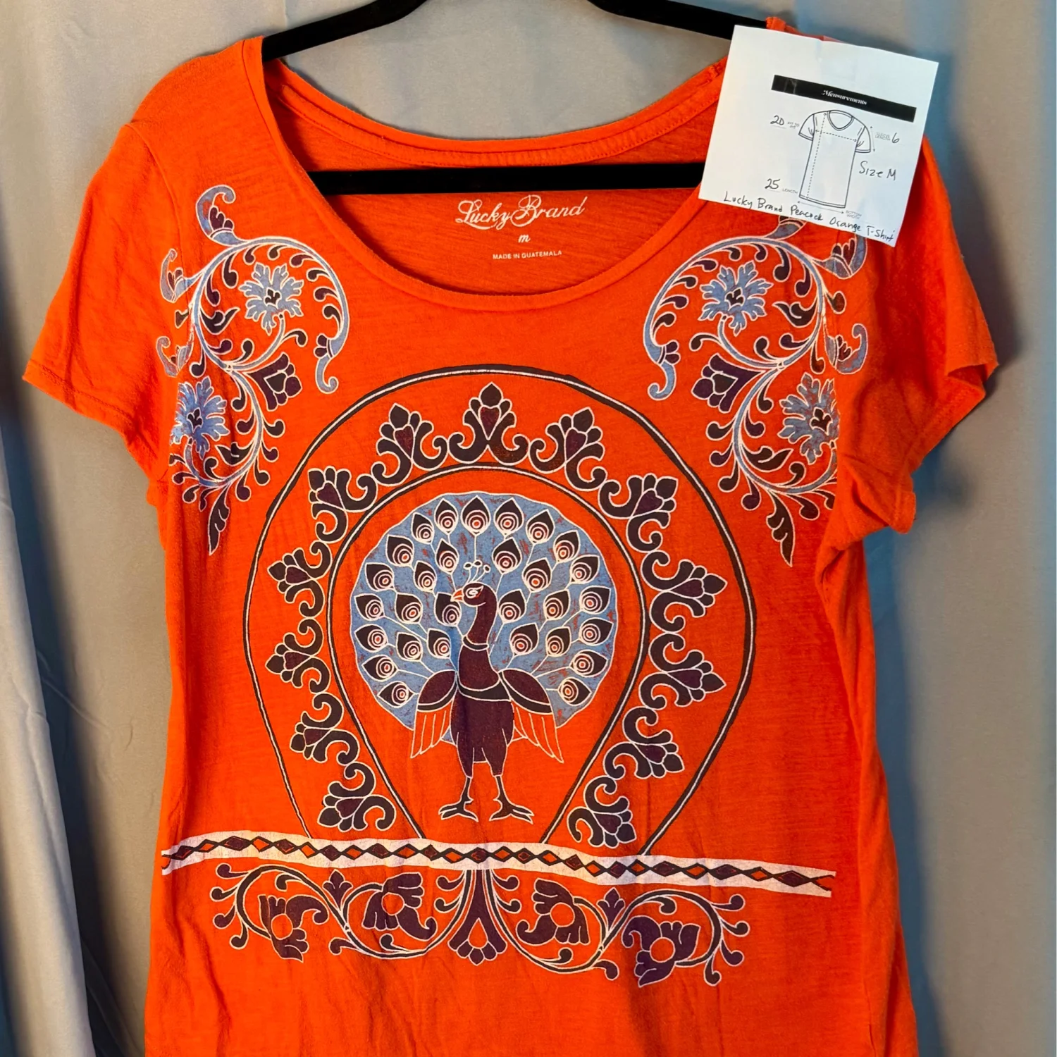 This vibrant orange t-shirt by Lucky Brand features a bold peacock design in blues and purples. Made from soft, breathable fabric, it is perfect for casual wear. The shirt is in excellent condition with no noticeable flaws, and is a size medium. Measurements include 20 inches pit to pit, 25 inches in length, and a 6-inch sleeve. #LuckyBrand #PeacockDesign #CasualWear