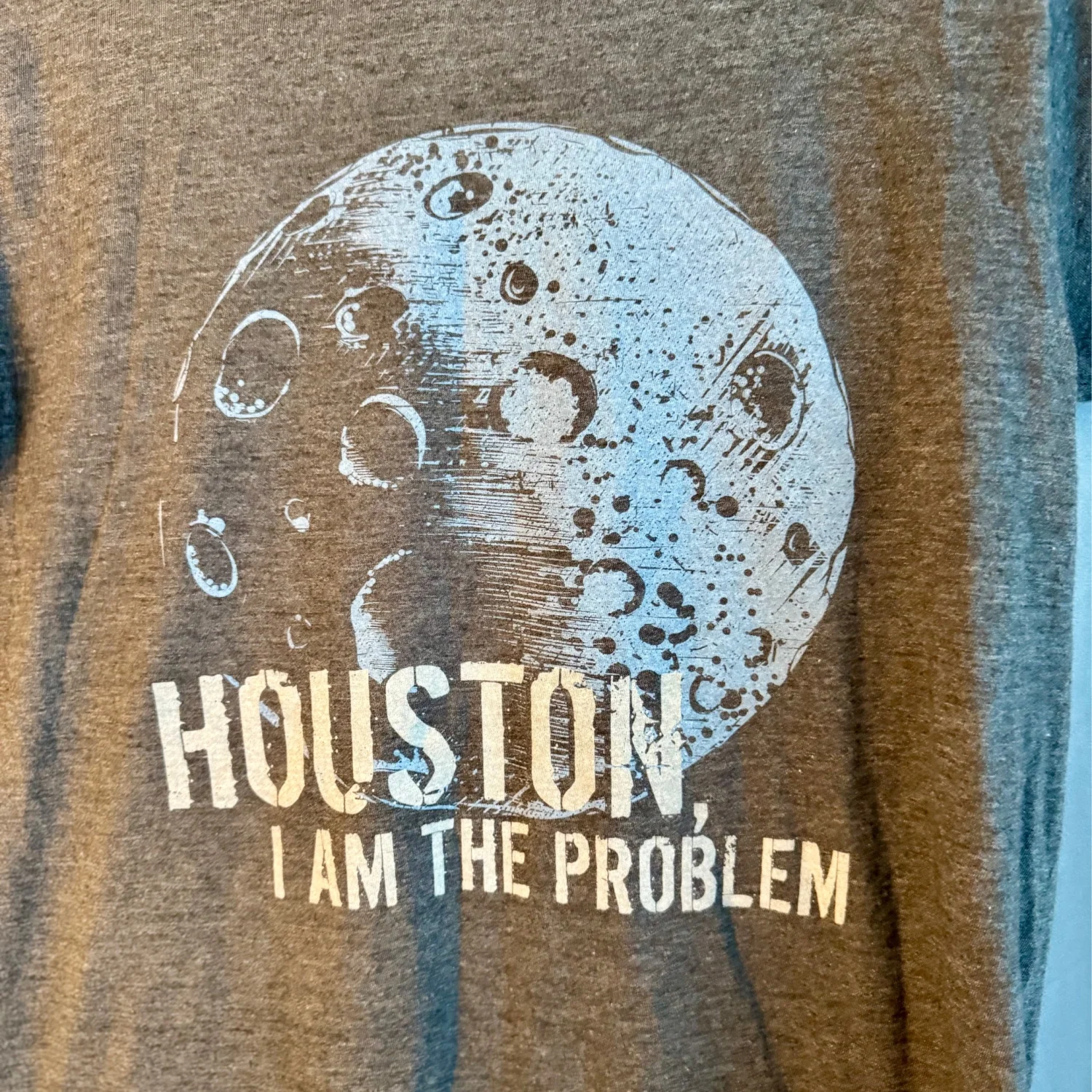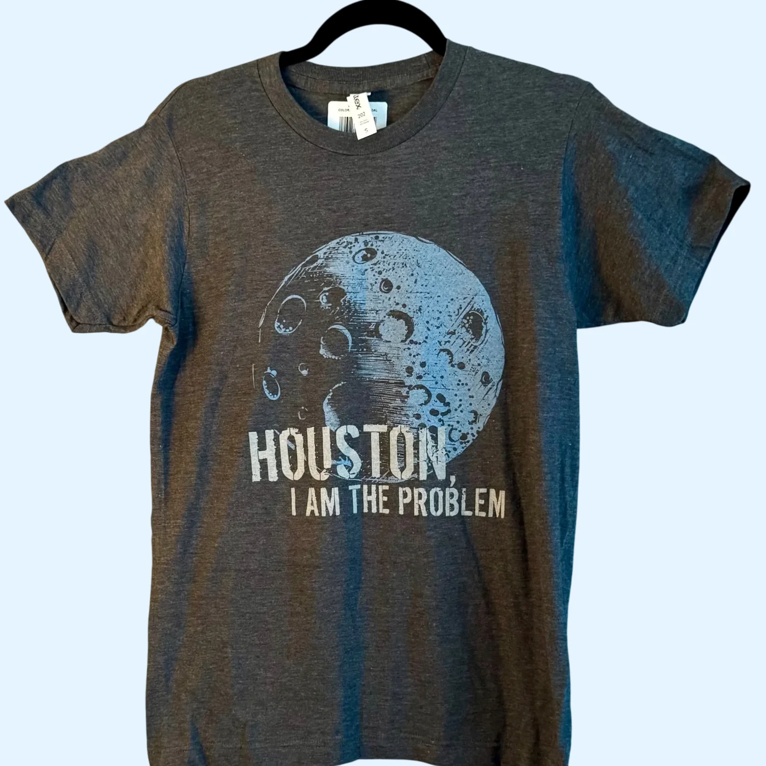 This Tultex t-shirt features a unique lunar print with the phrase 'Houston I Am the Problem' on a heather charcoal background. Made from a soft cotton blend, it includes a comfortable crew neck and short sleeves. Size Small with measurements: Pit to Pit - 18 inches, Length - 26 inches, Sleeve Length - 6.5 inches. Perfect for casual wear. #graphictee #humor #casualwear