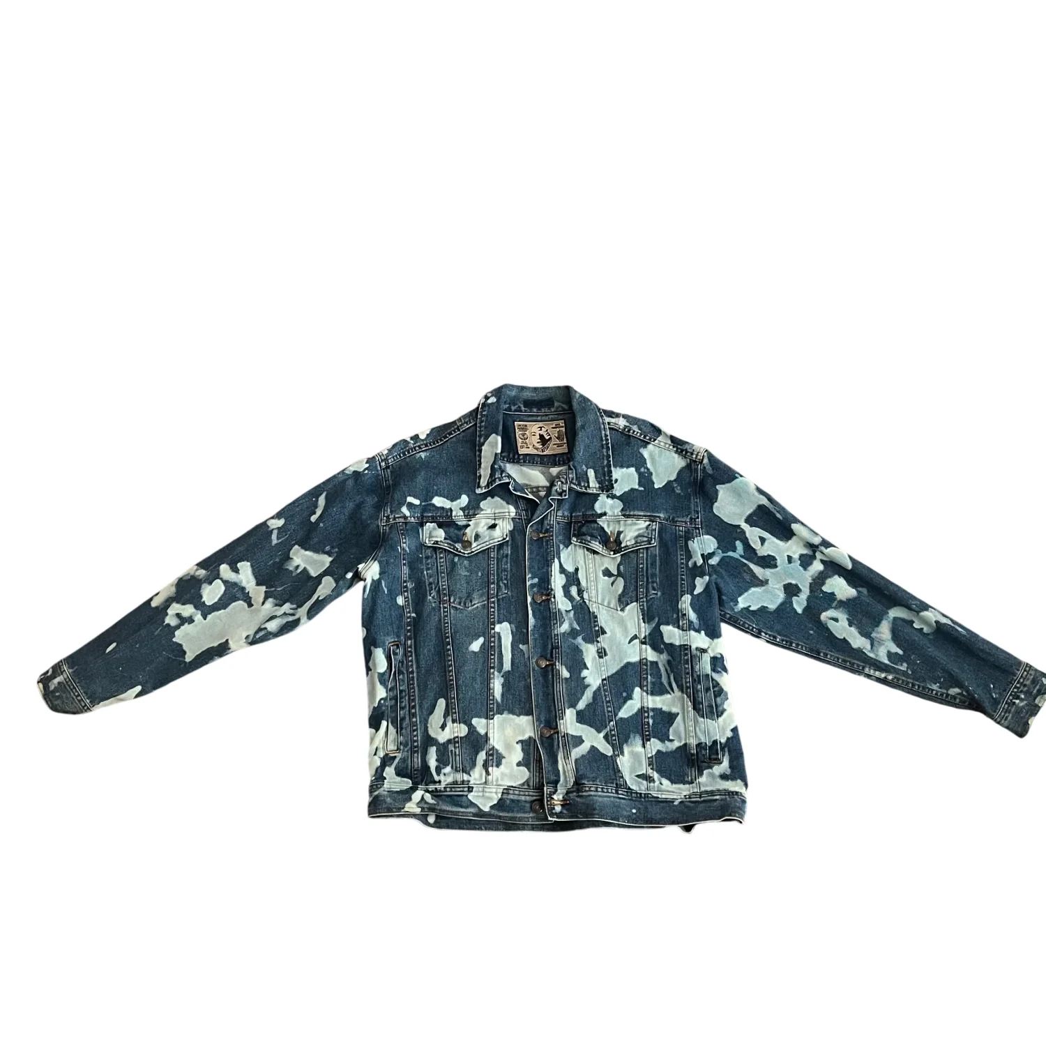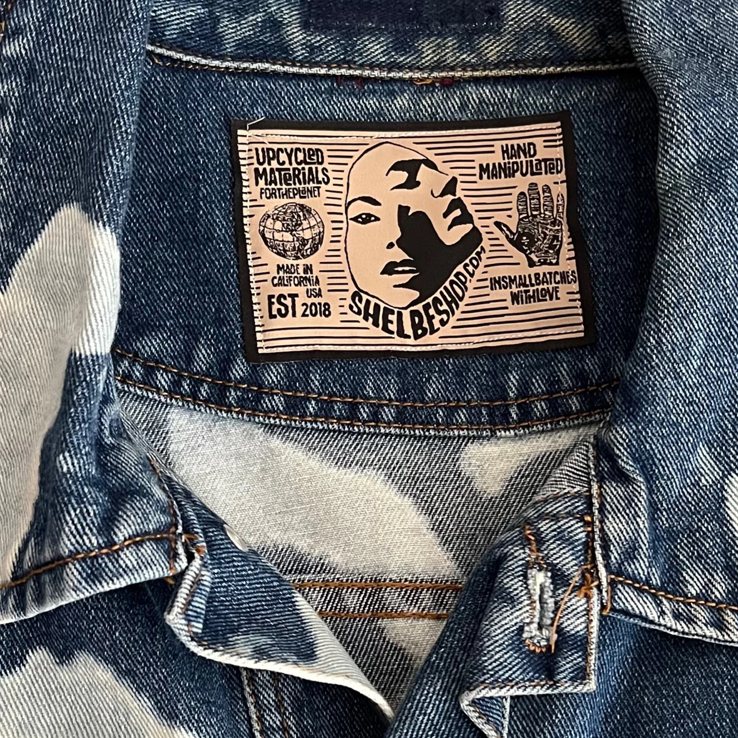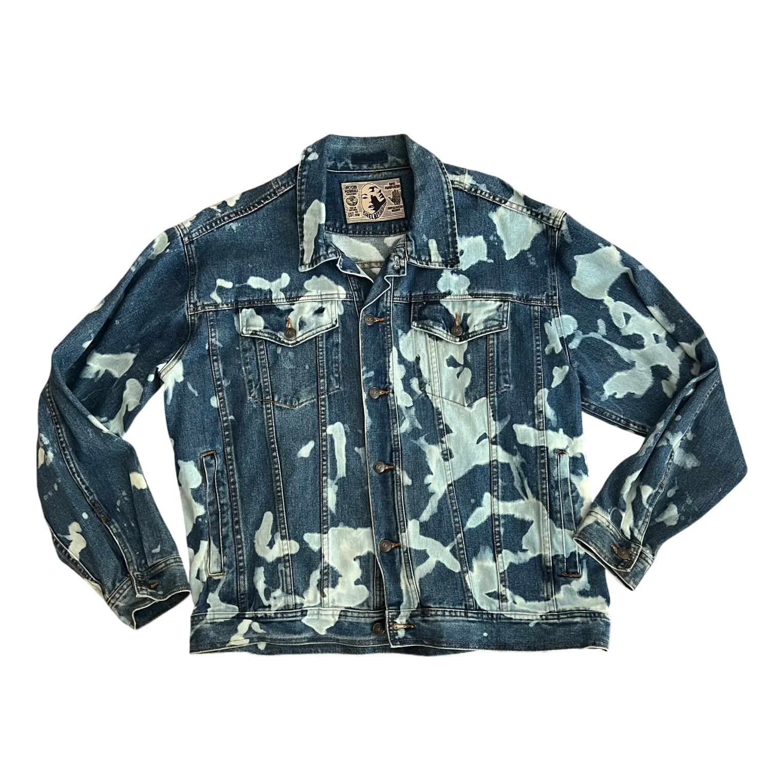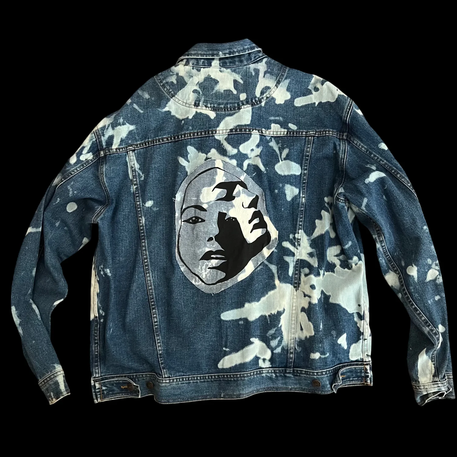 Reworked vintage denim jacket with hand washed / acid wash pattern and a face graphic on the back. Fits like a medium / large men’s, but it’s really unisex for oversized look. Great for music festival vibes. Bought it from the artisan at a market in Hayes Valley SF. I think it was over $150. One of a kind. Artisan label sewn in and her logo of a face is on the back.