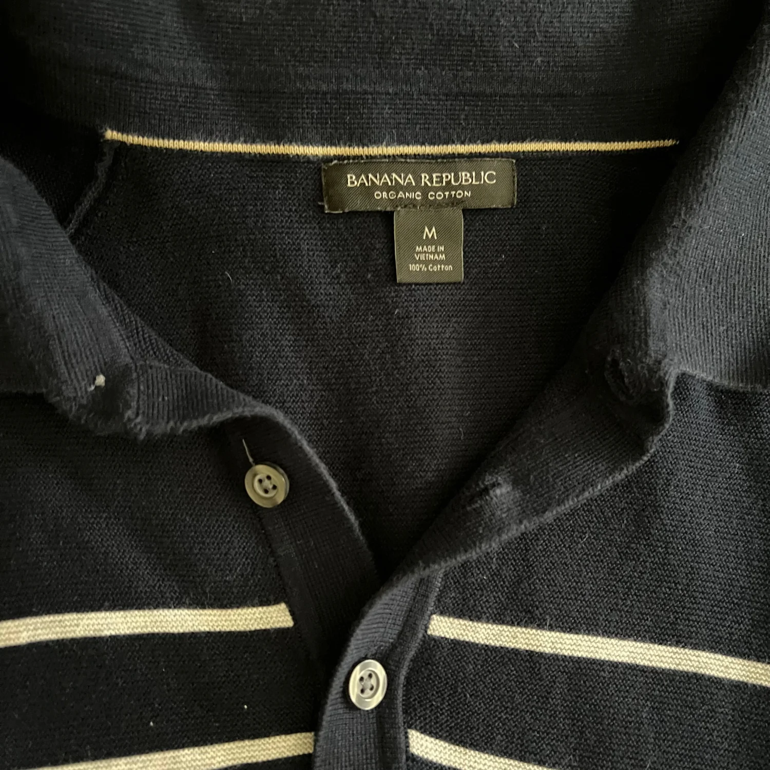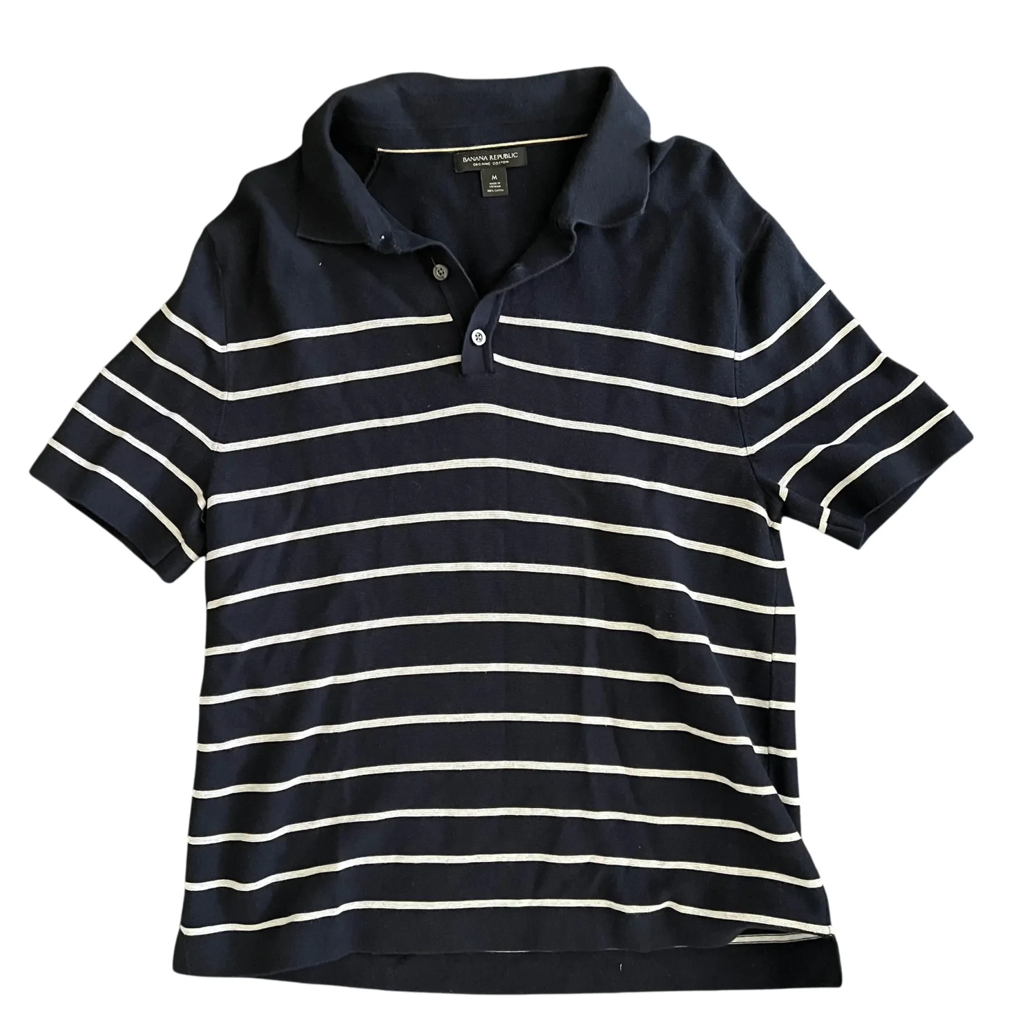 This is a Banana Republic navy polo shirt featuring classic white horizontal stripes. Made from 100% organic cotton, it offers a comfortable and breathable fit. Perfect for casual or smart-casual occasions. Size Medium. #BananaRepublic #PoloShirt #CasualWear