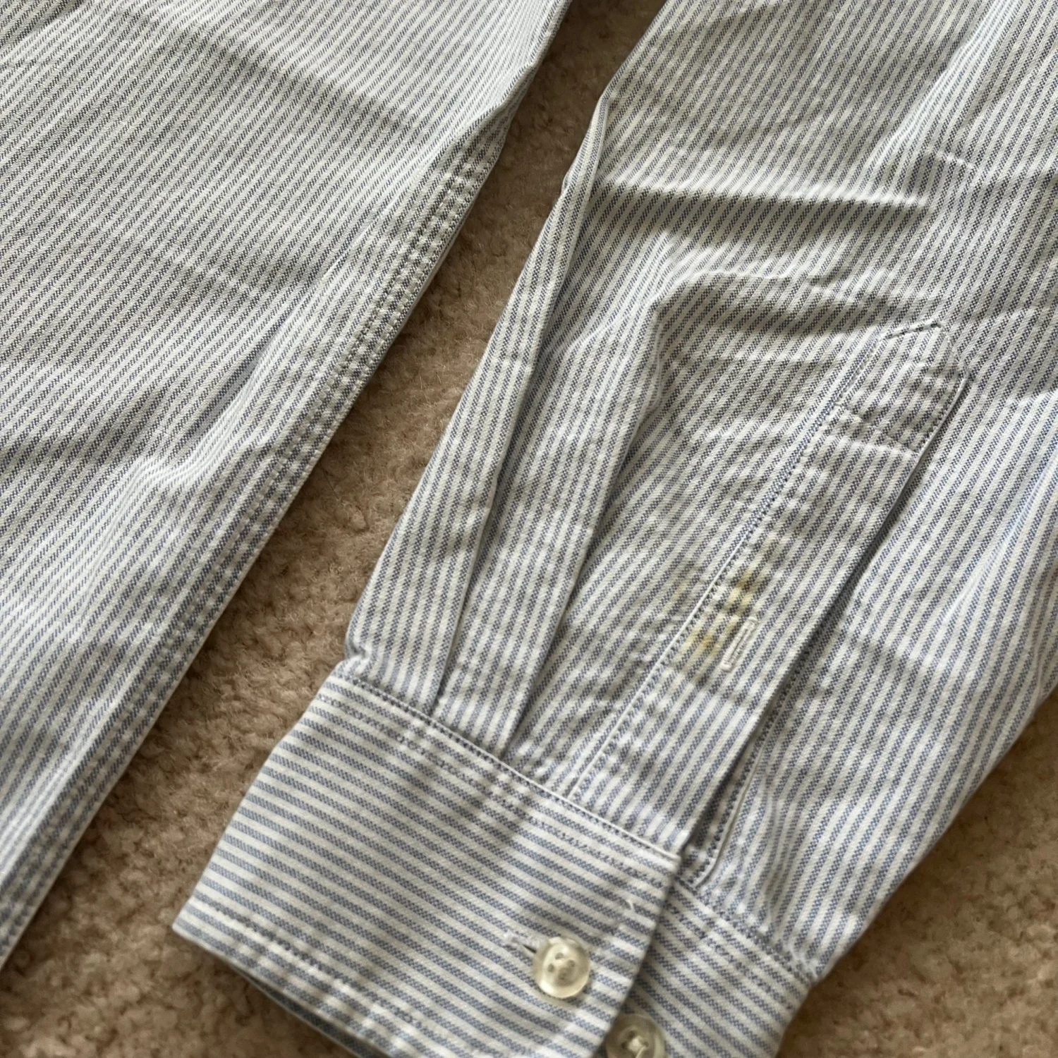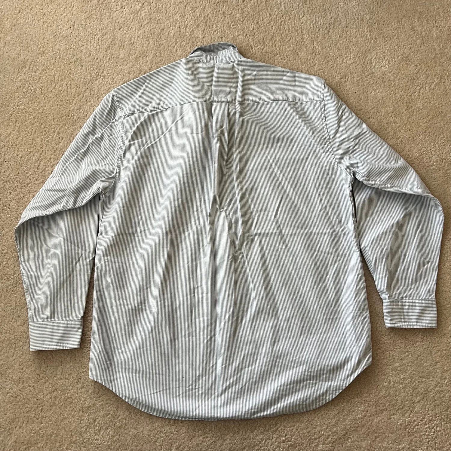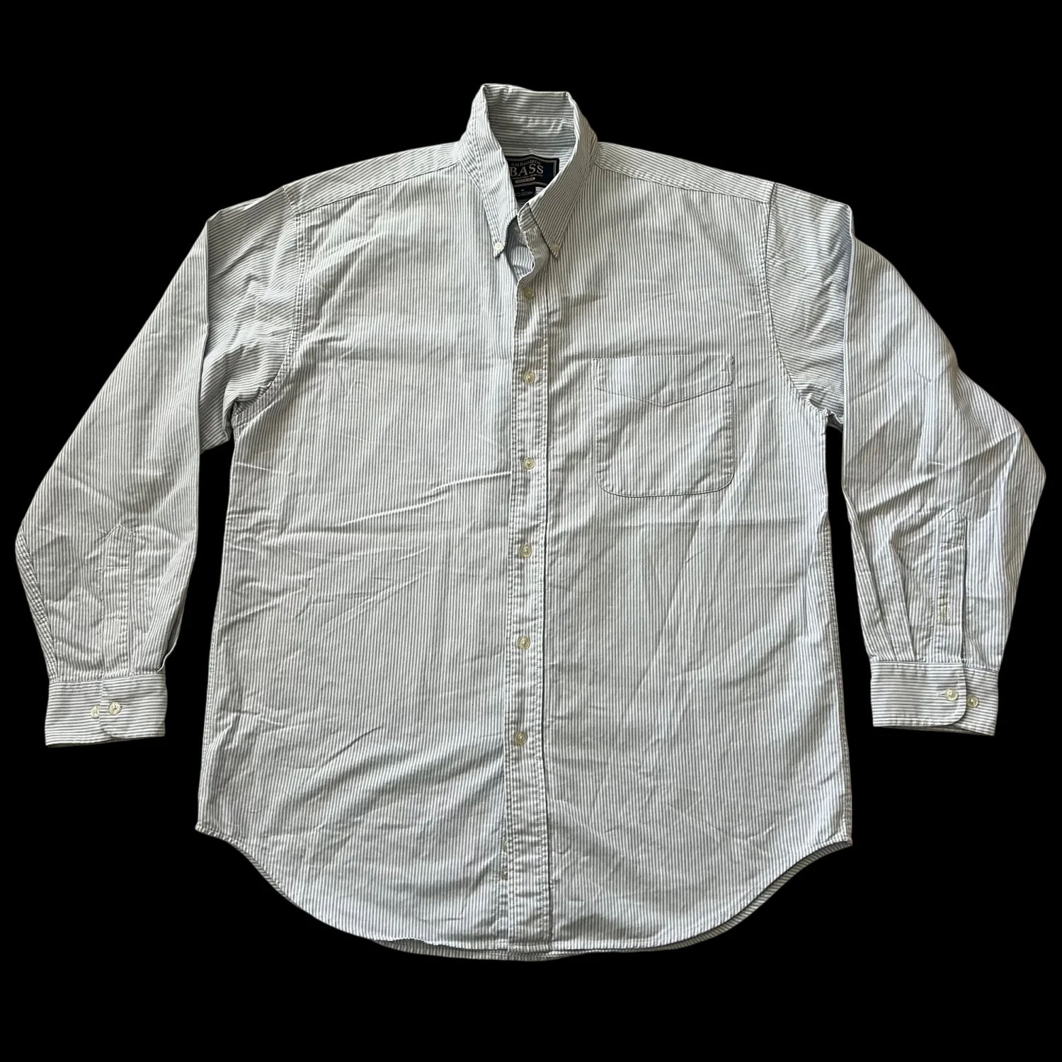 Vintage Men's G.H. Bass & Co. long-sleeve dress shirt in a subtle blue and white striped pattern (Oxford shirt). 100% cotton. Features a classic collar, button-up front, and a single chest pocket. Size: M. (I think it’s an oversized fit). NOTE THE PICTURED STAIN.