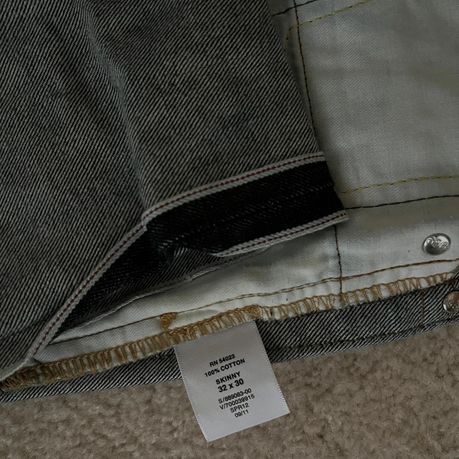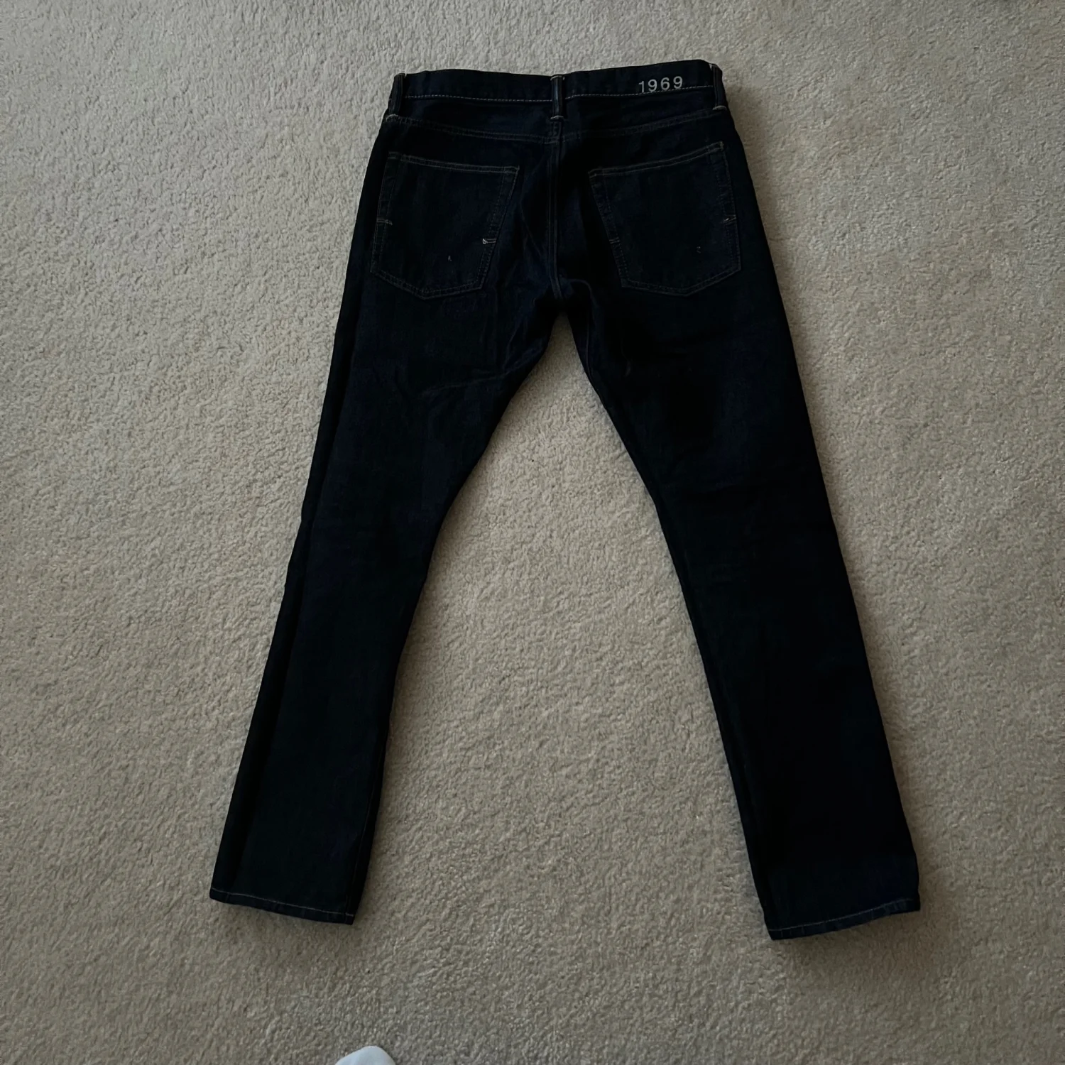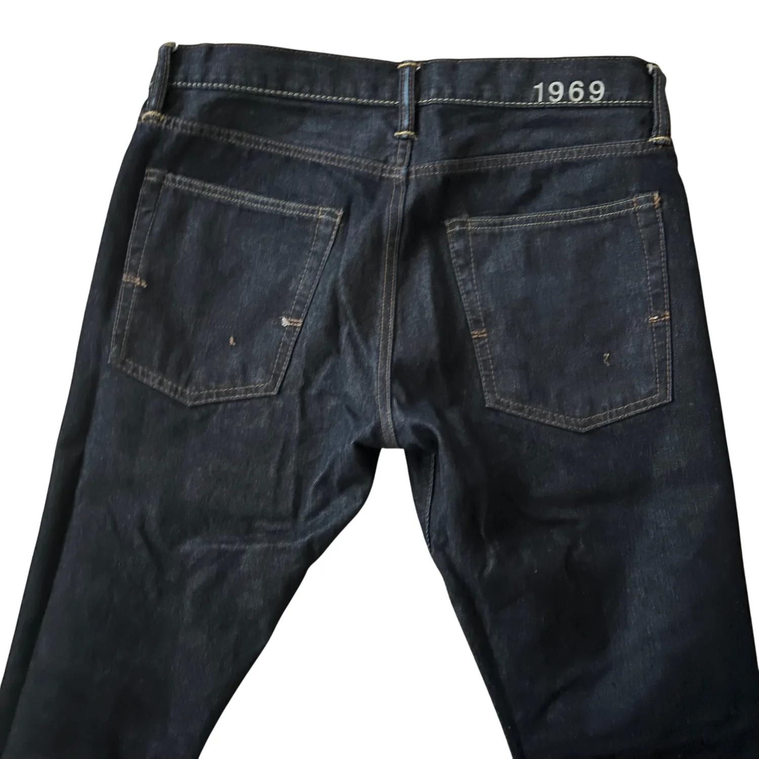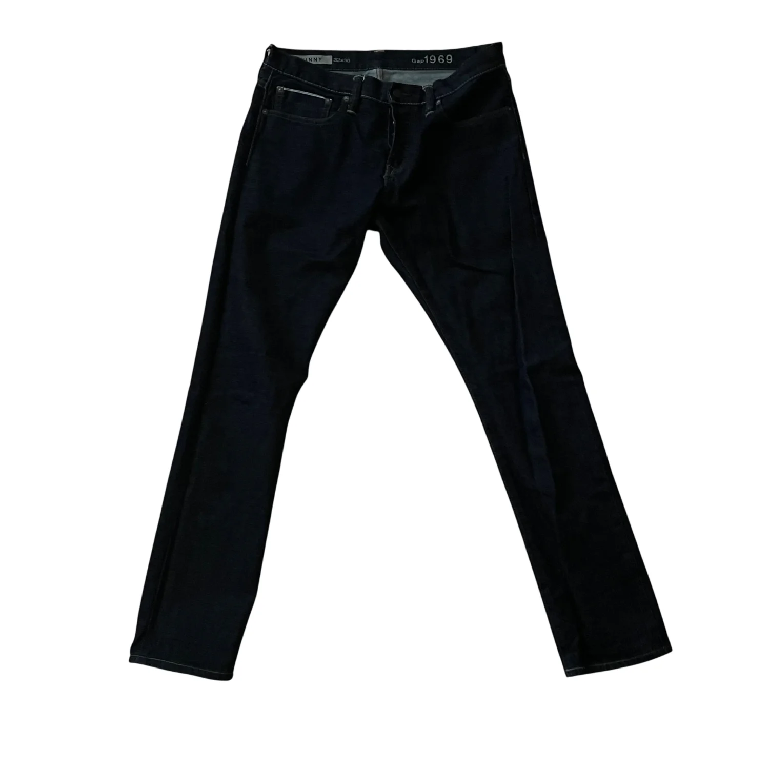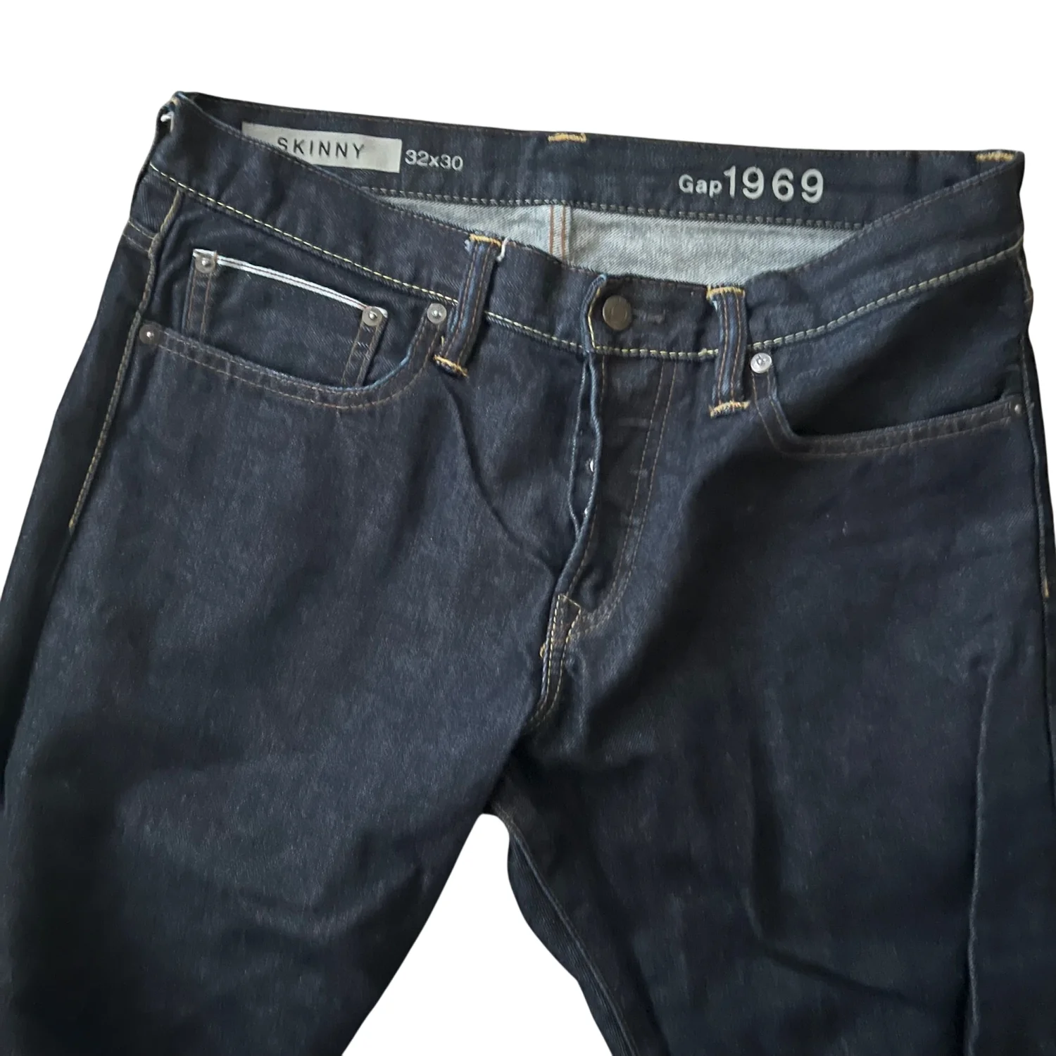 Gap 1969 Skinny Selvedge Jeans . denim feature a classic dark wash denim with a modern skinny fit. Made from 100% cotton, these jeans offer both comfort and style. They have the signature 1969 embroidery on the waistband and feature traditional five-pocket styling. Care instructions: Machine wash cold, tumble dry low.
