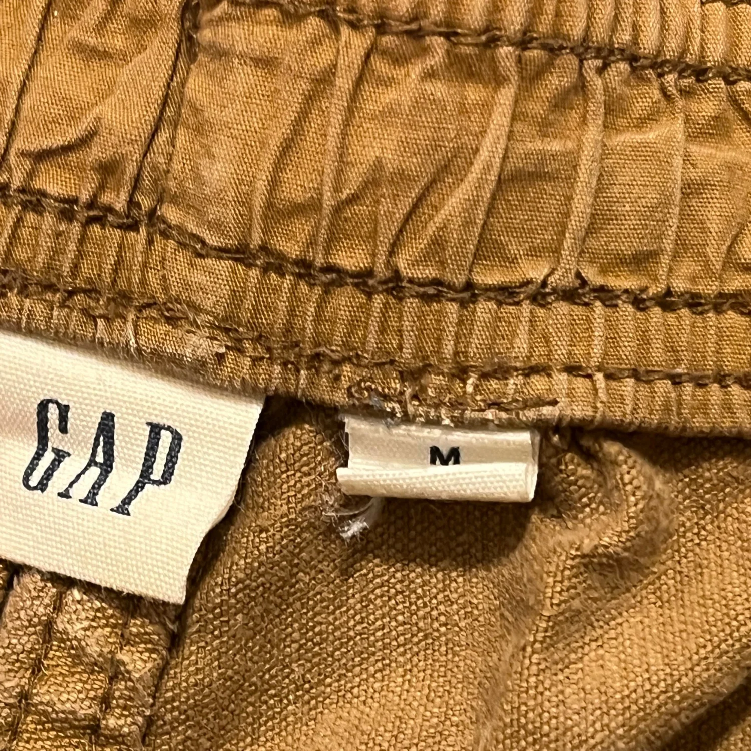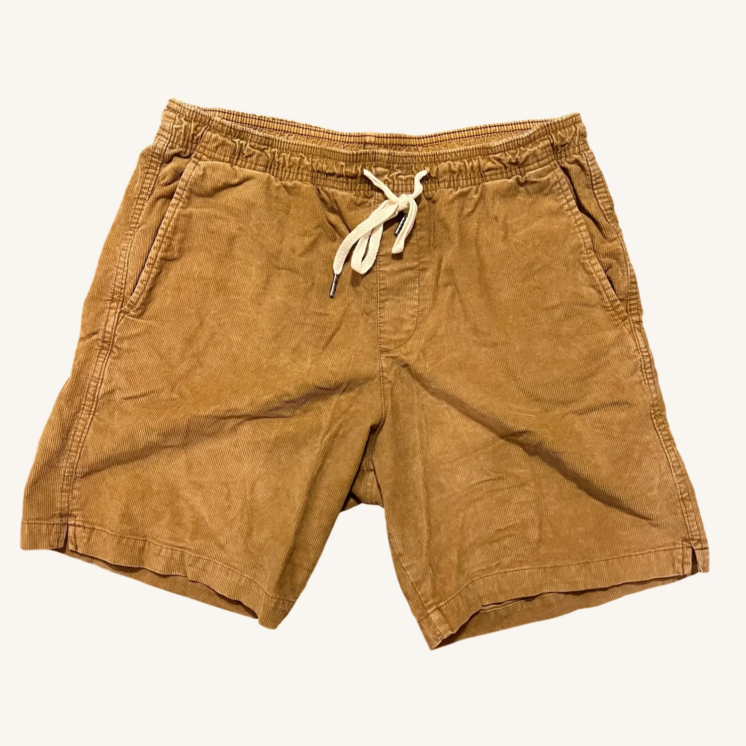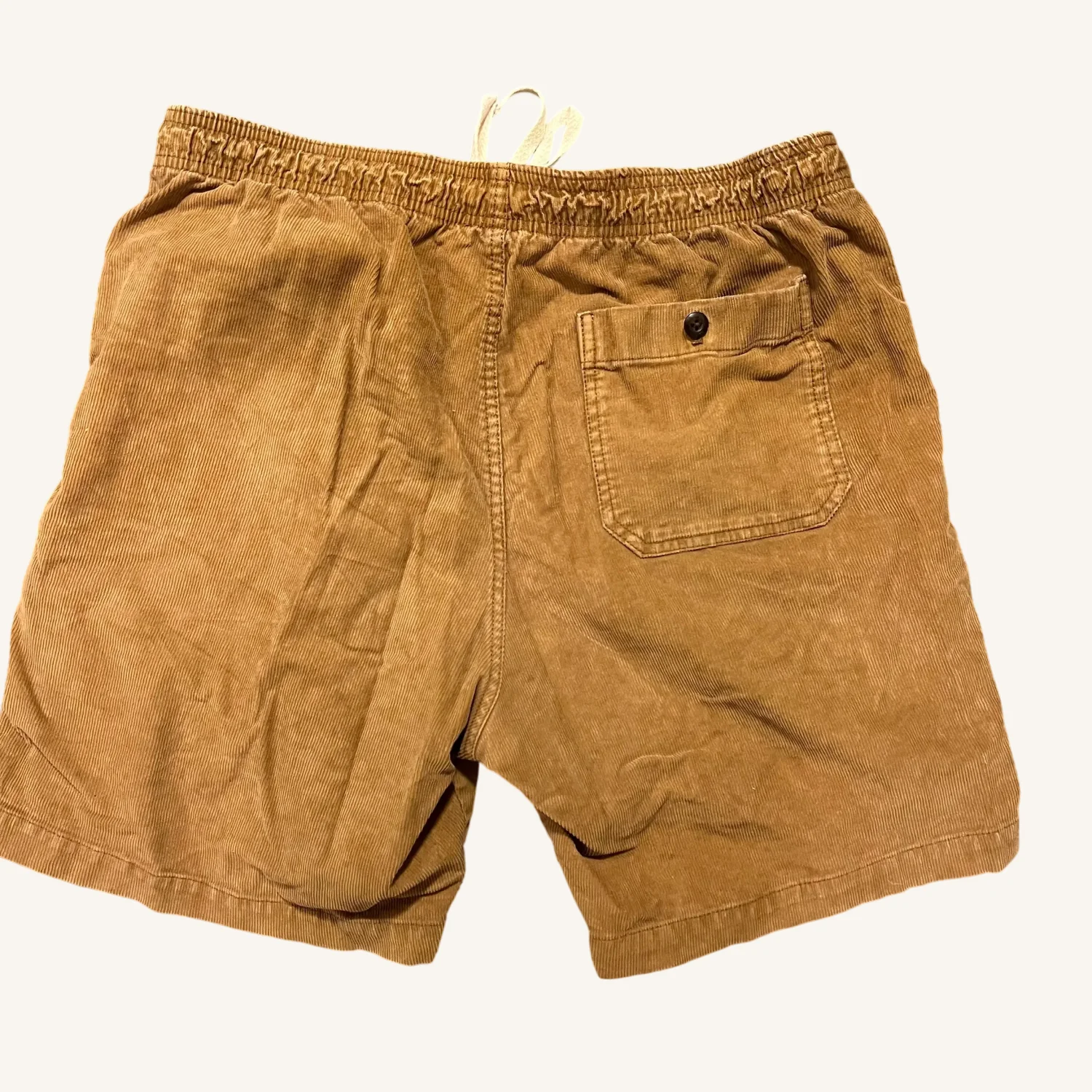 GAP corduroy brown / khaki / honey color, size medium, feature a comfortable elastic drawstring waist, side pockets, and a single back pocket with a button closure. Made from corduroy in a warm brown hue, these shorts are perfect for casual and outdoor wear. 7” inseam