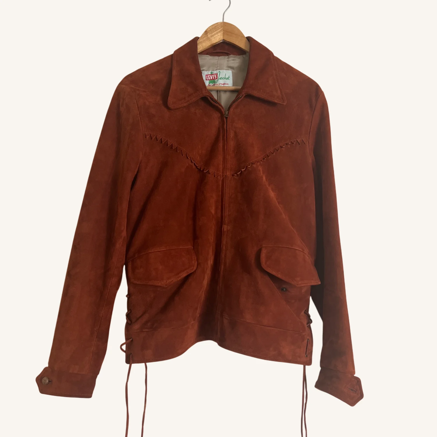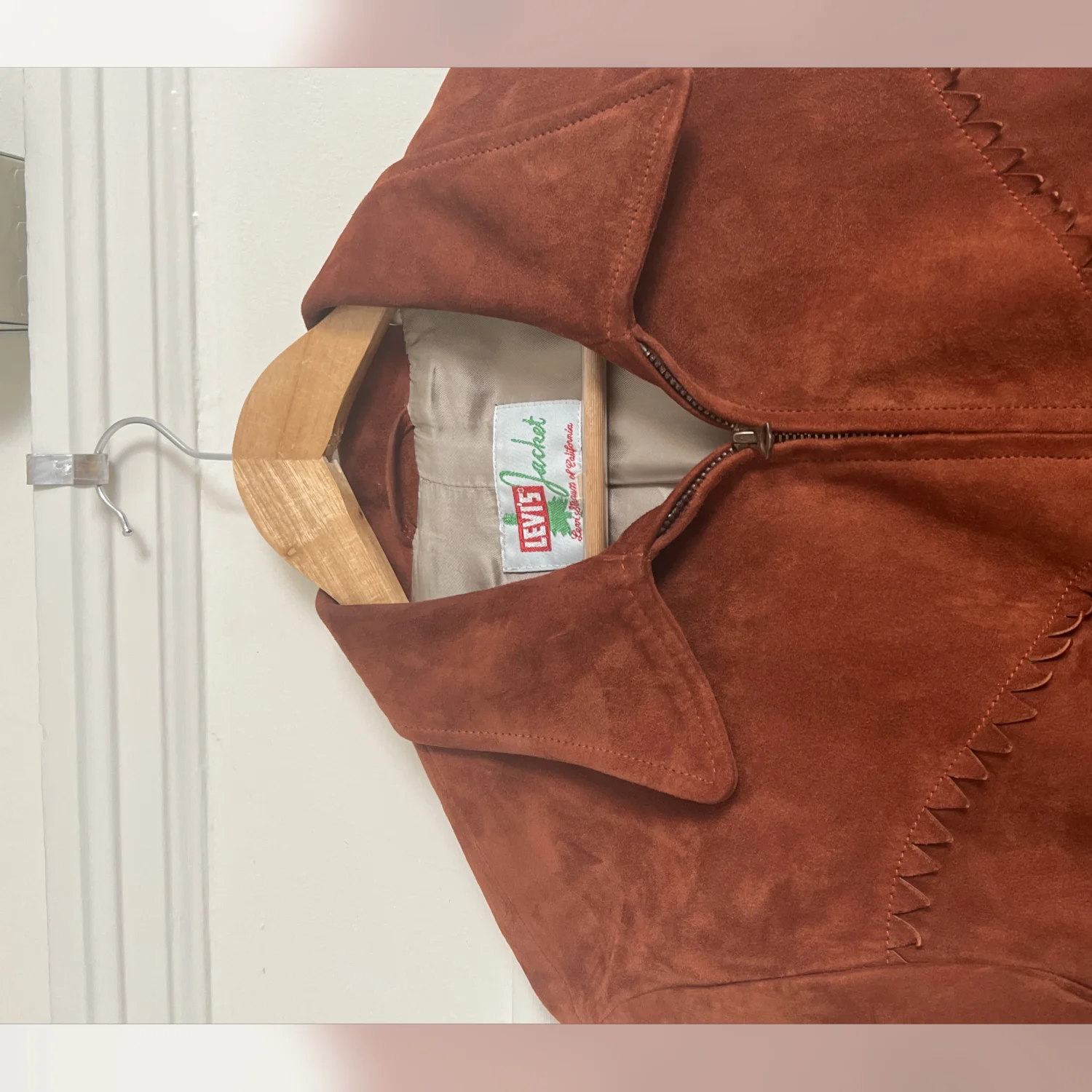 This is a rust colored suede jacket from Levi's. Vintage Suede Levi’s Made in Italy jacket has a zipper closure and two pockets on the front. The jacket is in great condition with no visible damage. It’s missing one on left cuff.