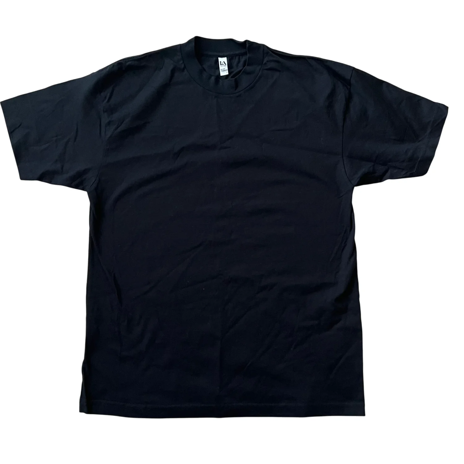 Sized as Large but I think it runs small. Los Angeles Apparel black t shirt. New, never worn, but no tags