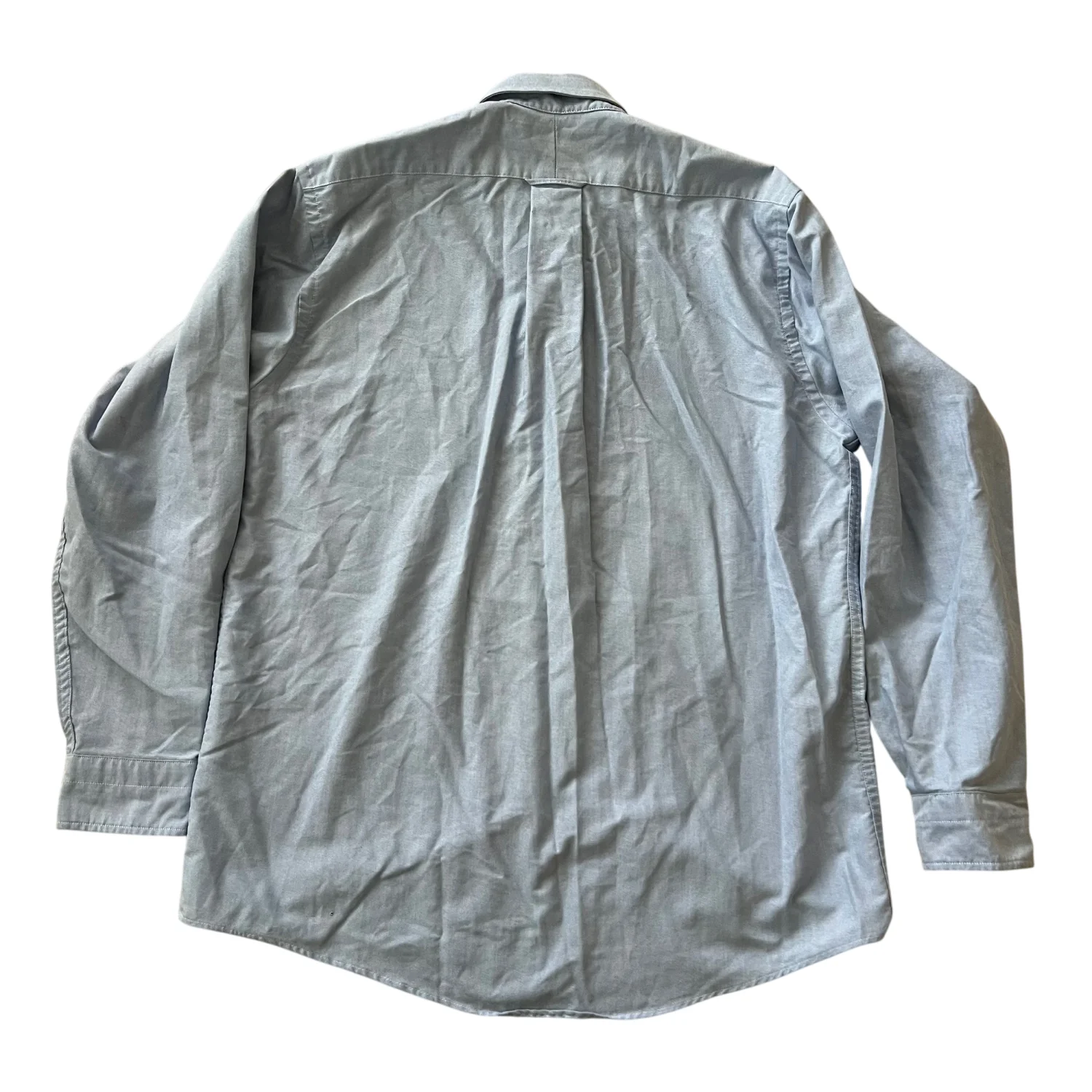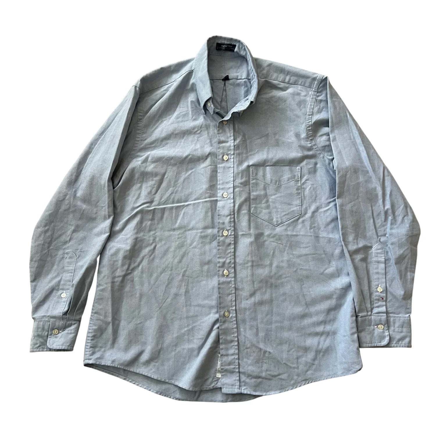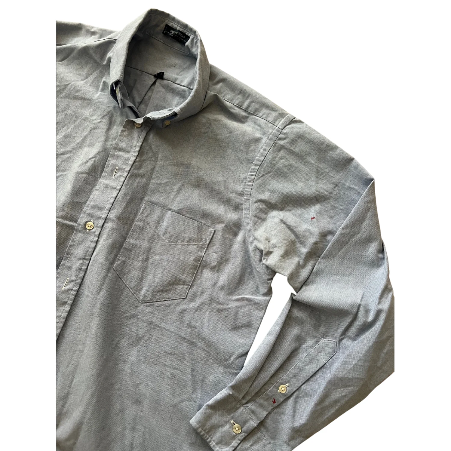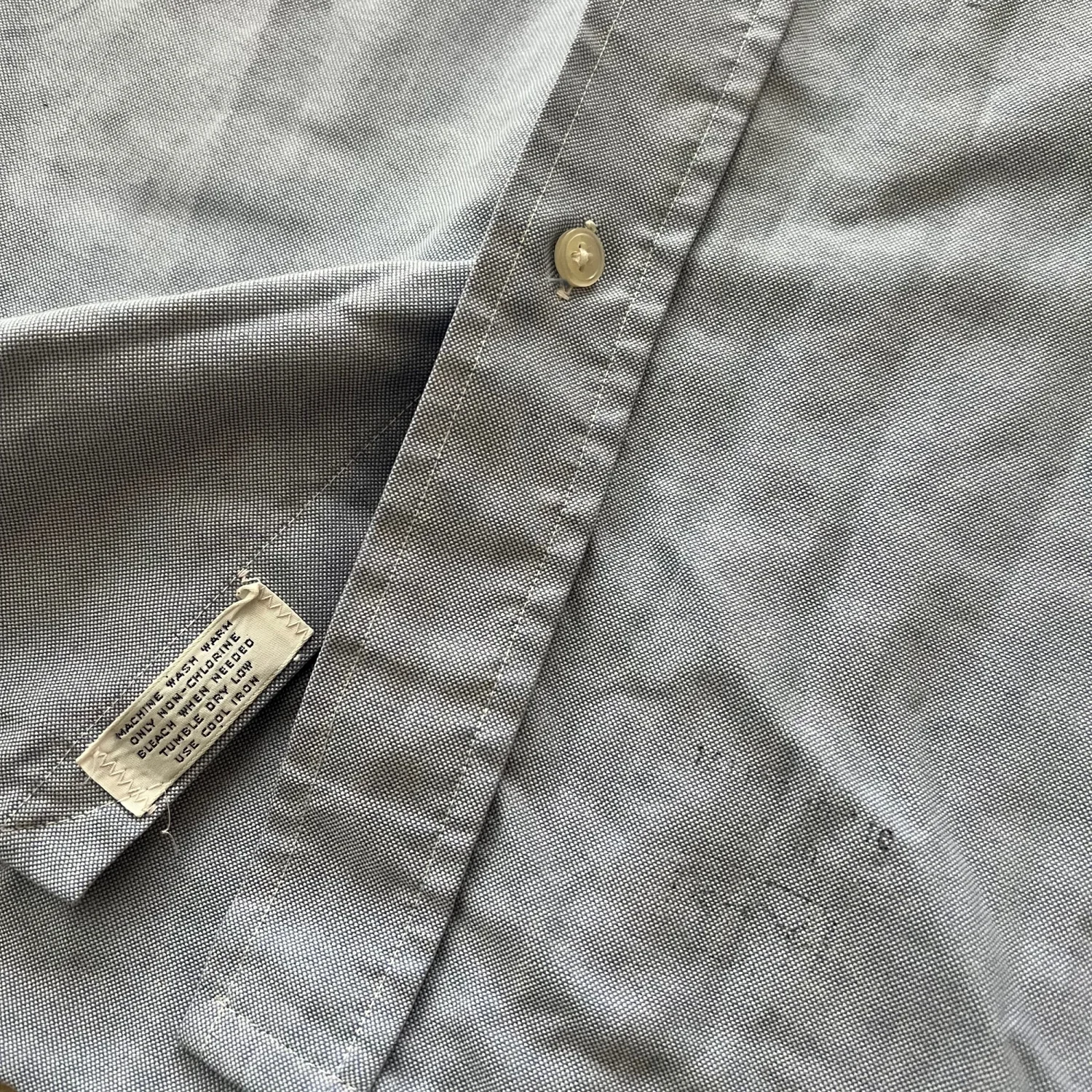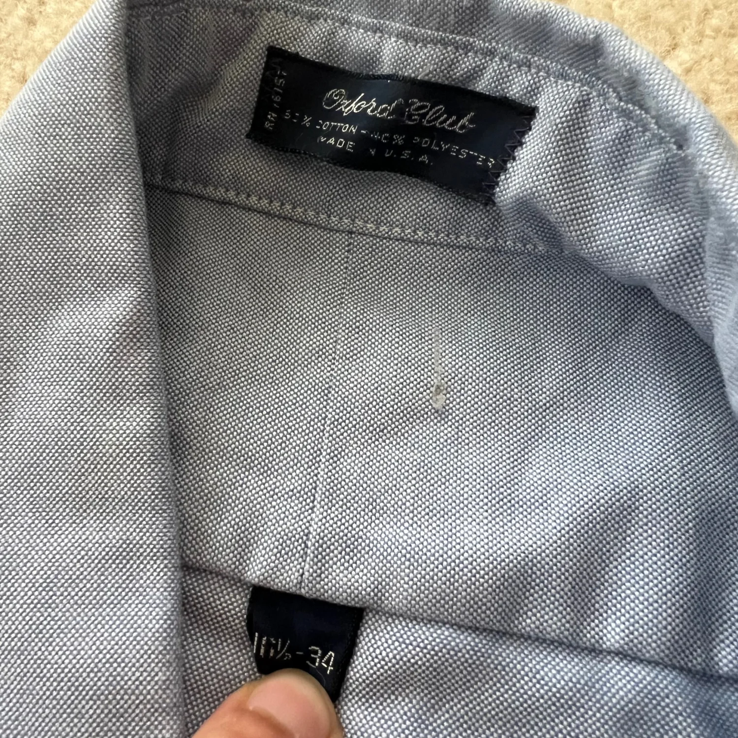Vintage Gant, Oxford Blue button-down dress shirt made from a blend of cotton and polyester. It features a classic design with a single chest pocket, button-up front, and buttoned cuffs. It is in good condition with some signs of wear. Size 16½-34. Classic preppy made in USA Oxford . The tag fell off but I remember it was Gant. Oversized fit. I wore it casually. Not the red paint stains and other imperfections.