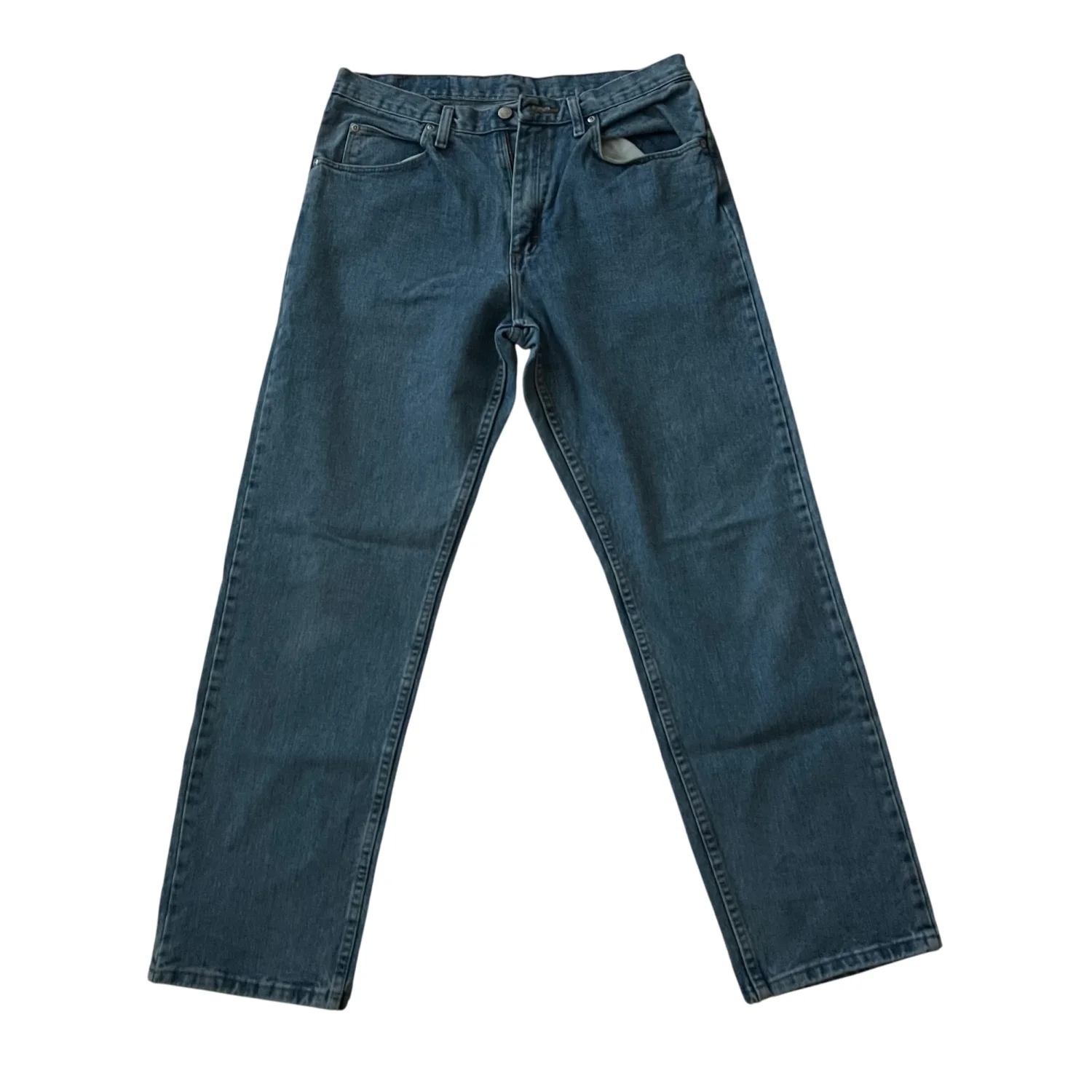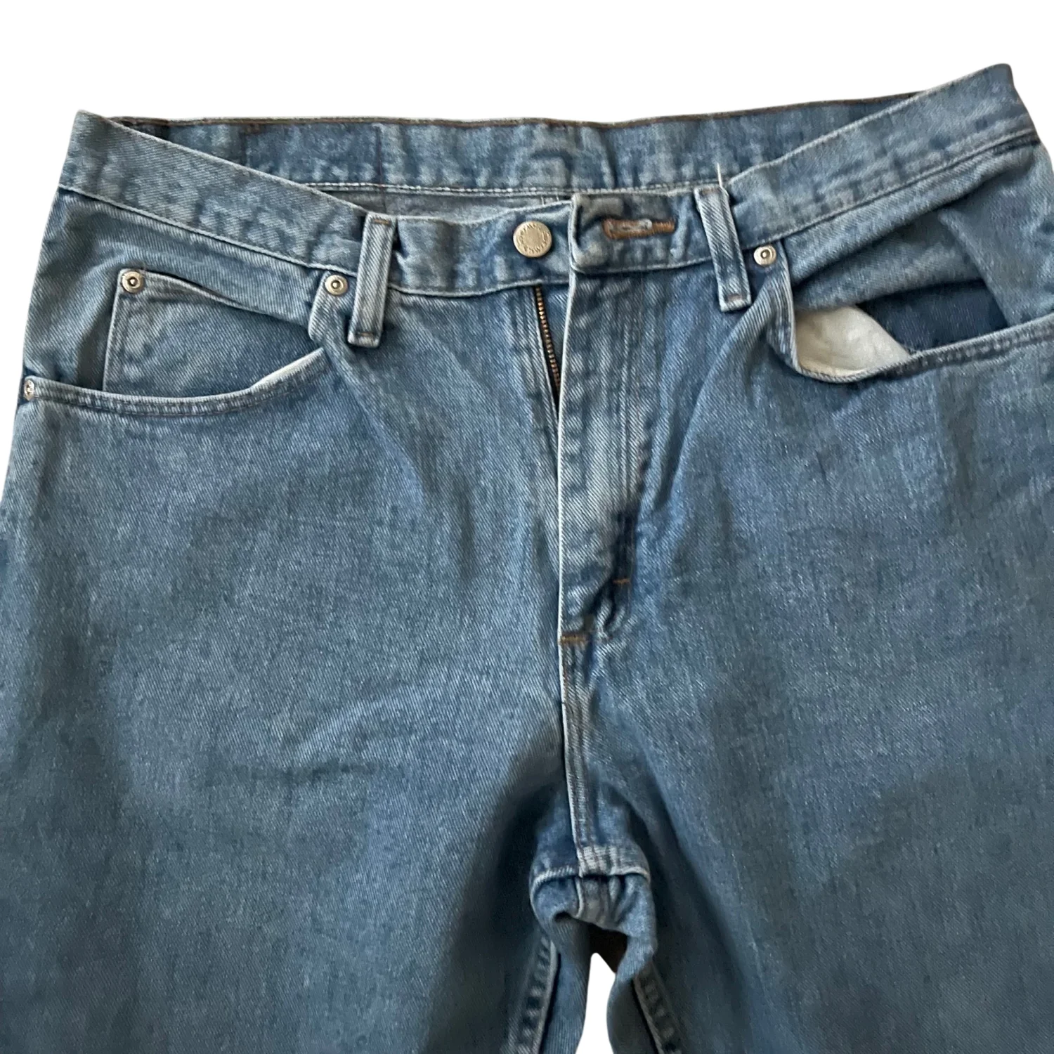 Vintage men’s wrangler jeans, sized 33x32. I thrifted them a long time ago. Light wash (the lighting in the photo is a bit dark). Relaxes fit (classic / timeless Jean but very on trend right now)