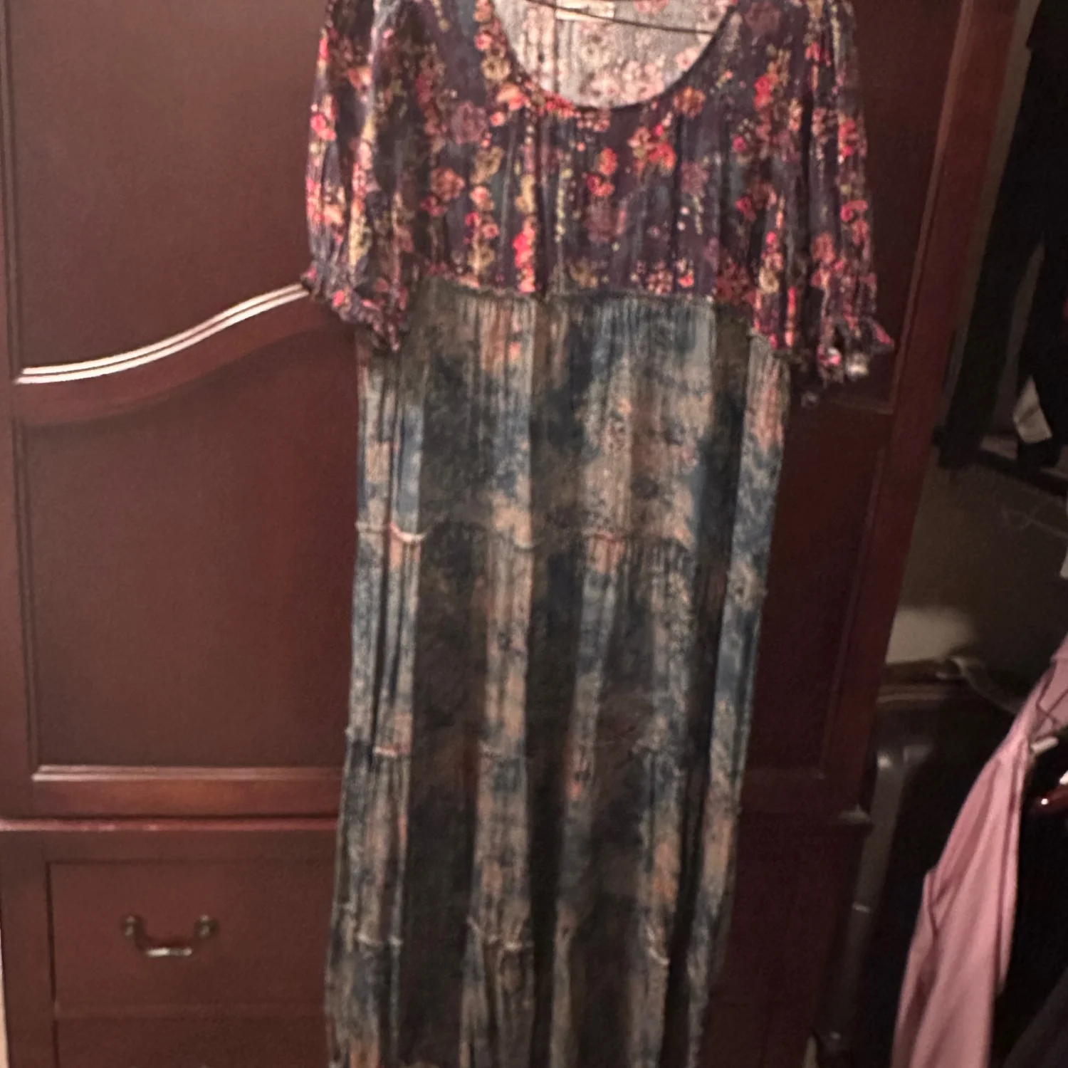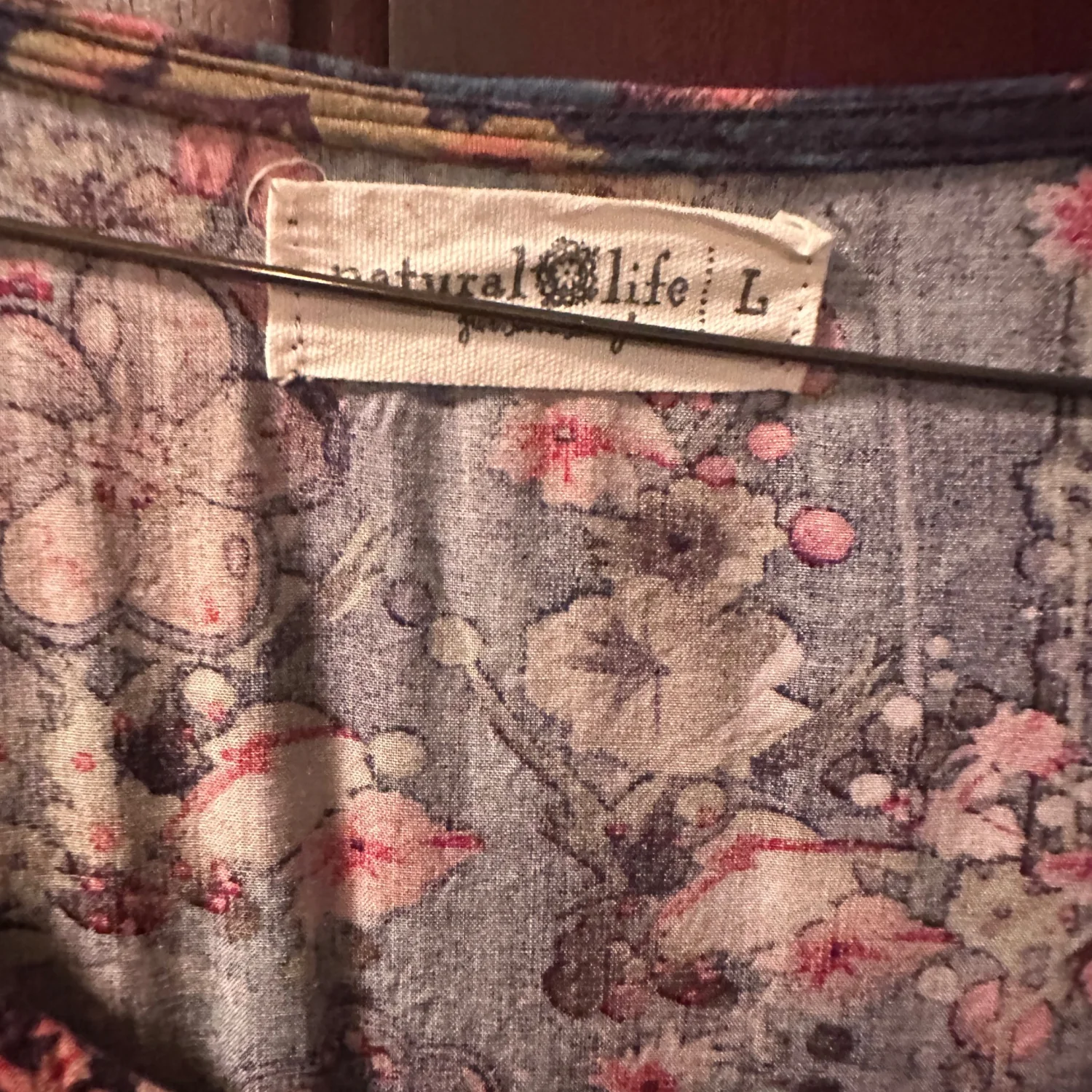 This bohemian-style floral and tie-dye maxi dress is designed by Natural Life. It features a floral pattern on the bodice and a relaxed tie-dye pattern on the skirt. The dress has flounce sleeves and a scoop neckline, perfect for casual or festival wear. Made of lightweight fabric, ensuring comfort and style. Size L. #bohemian #floral #tie-dye