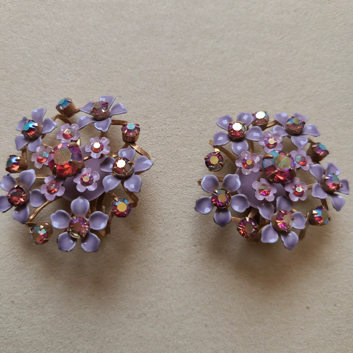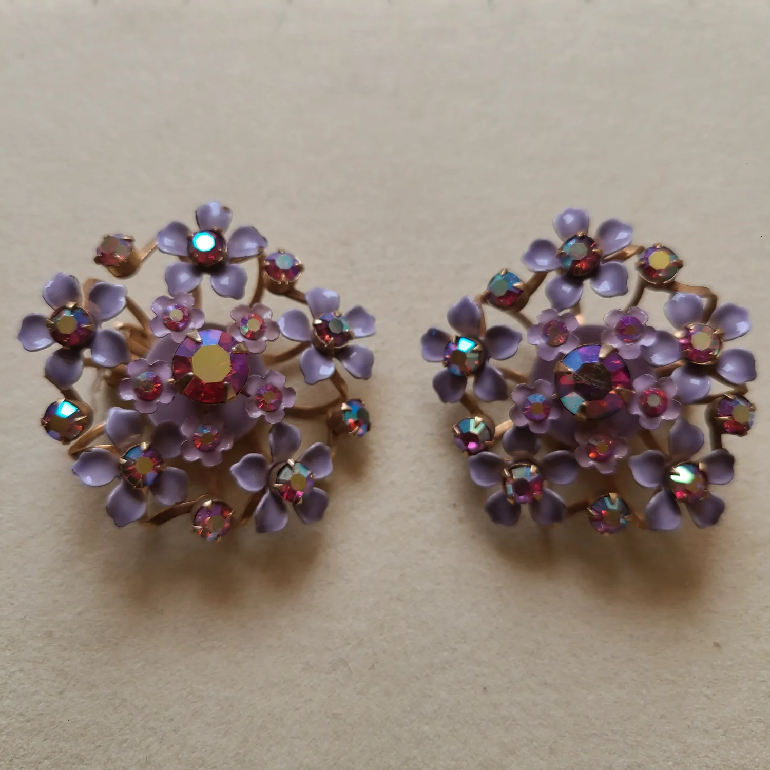 Vintage Floral Enamel & Rhinestone 60s Clip On Earrings