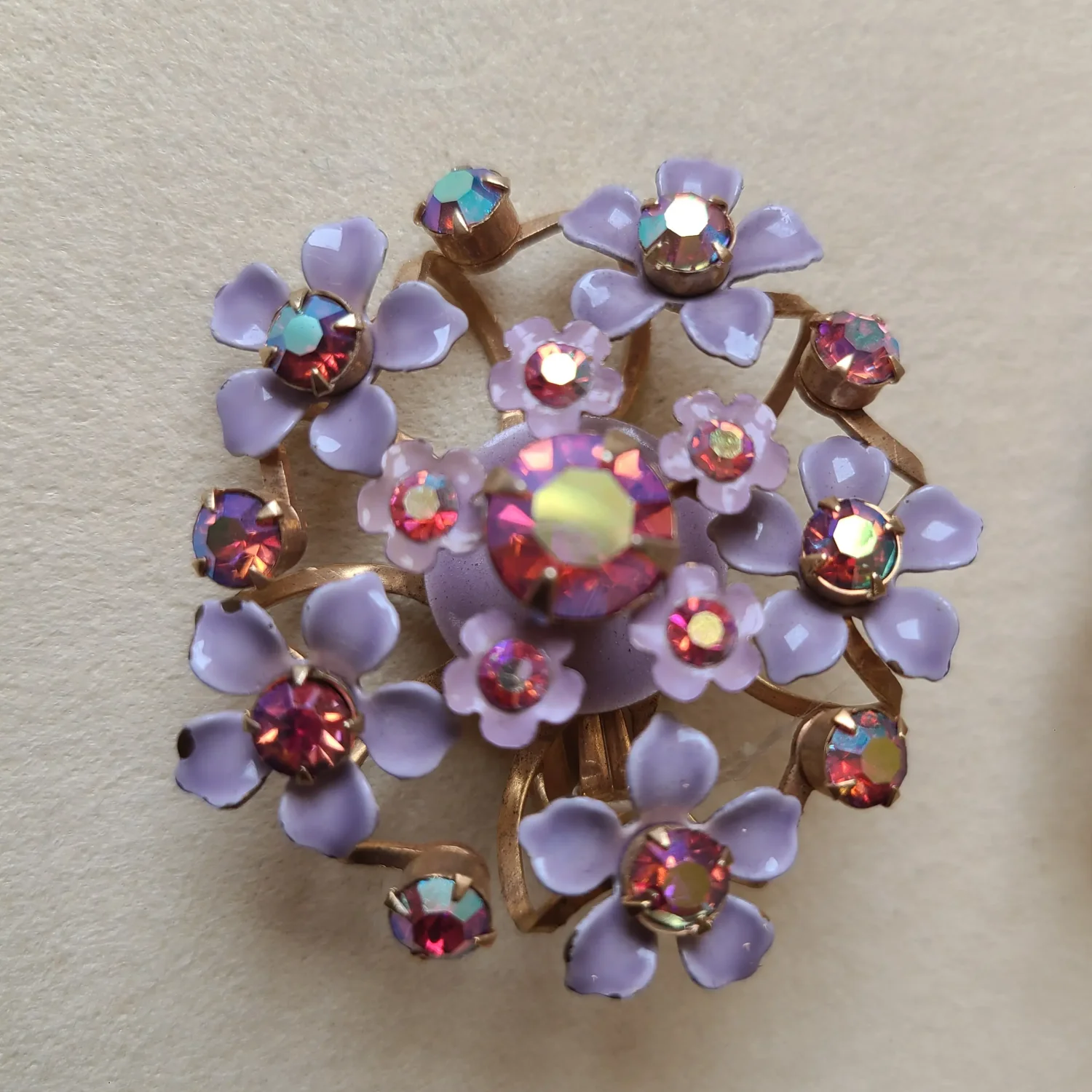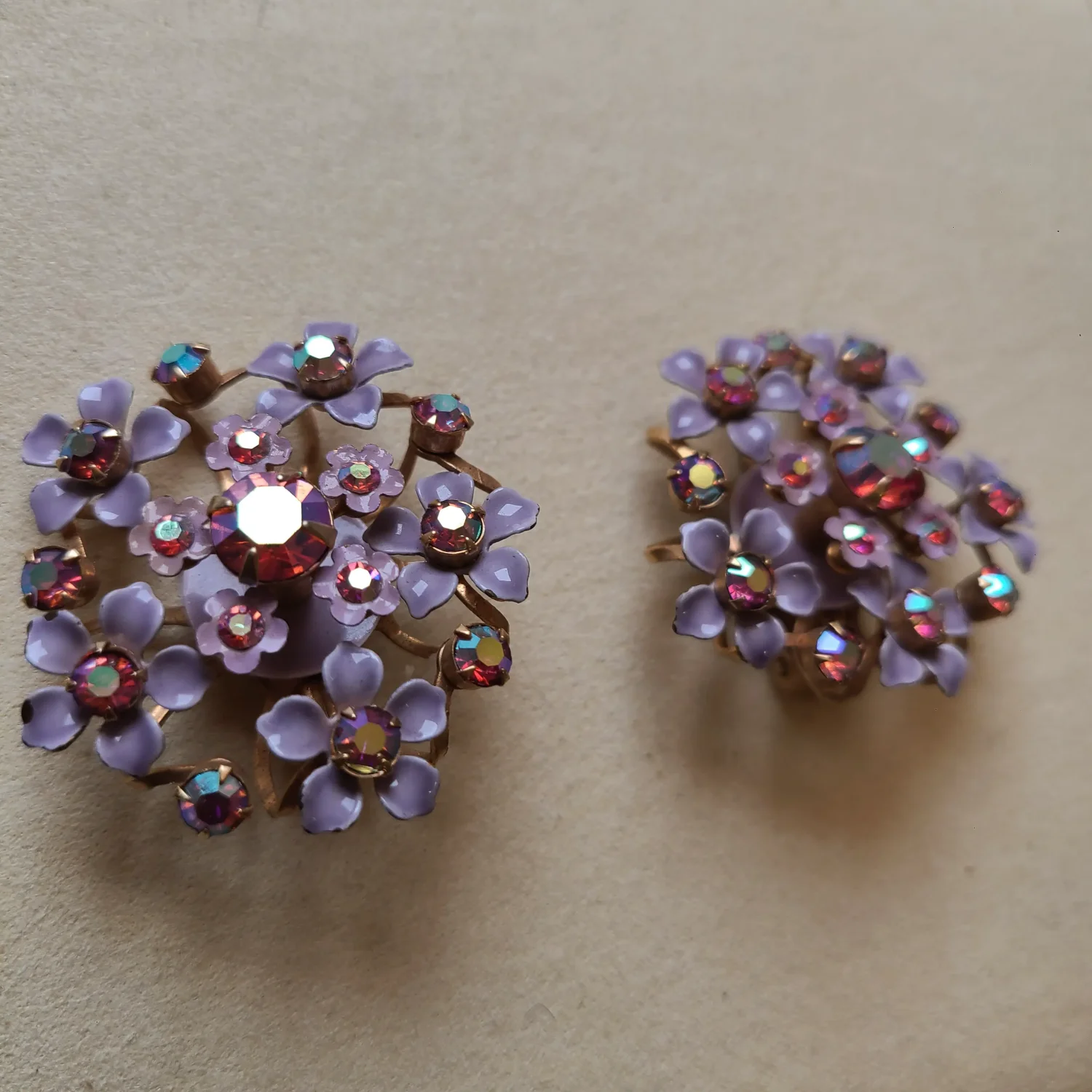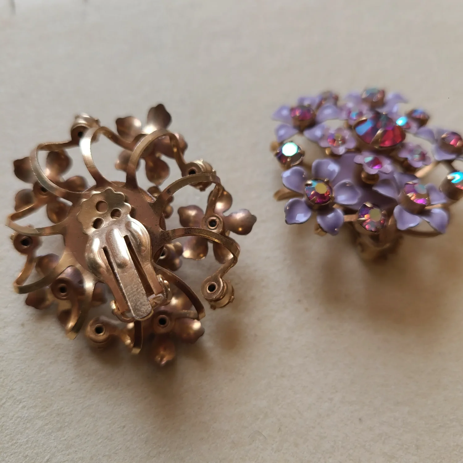 •Vintage Earrings• Designer/Signed by: Unsigned Era: 60s Color: Lavender & Reddish Pink AB Stones Type: Clip-On Earrings Shape: Large Round Flower Good condition, No signs of wear. Sold as-is