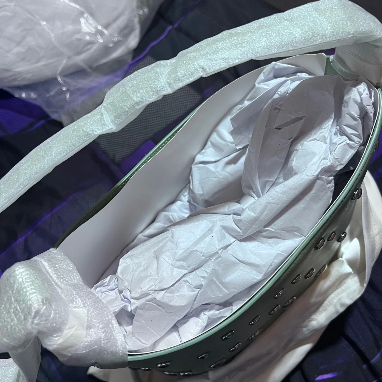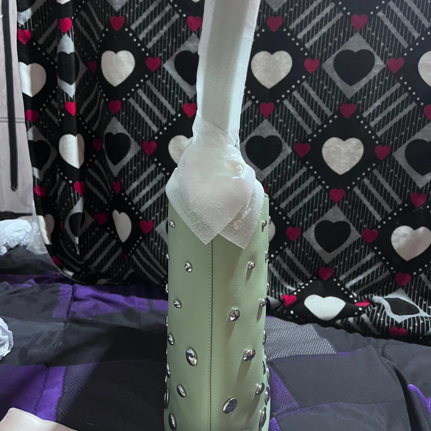 The NEW TAGS Kate Spade Crisp Sage Halo Stud Fine Grain Leather Bucket Bag KM493 is a stylish and versatile handbag perfect for various occasions such as travel, parties, casual outings, and business meetings. This large rectangular bag features a crisp sage exterior with silver studs as accents, giving it a unique and chic look. The adjustable handle, lined interior, inner pockets, and detachable strap make it both practical and comfortable to use. With its pebbled finish and high-quality leather material, this designer bag from Kate Spade New York is a must-have accessory for any fashion-forward woman. This bag also comes with the dust cover