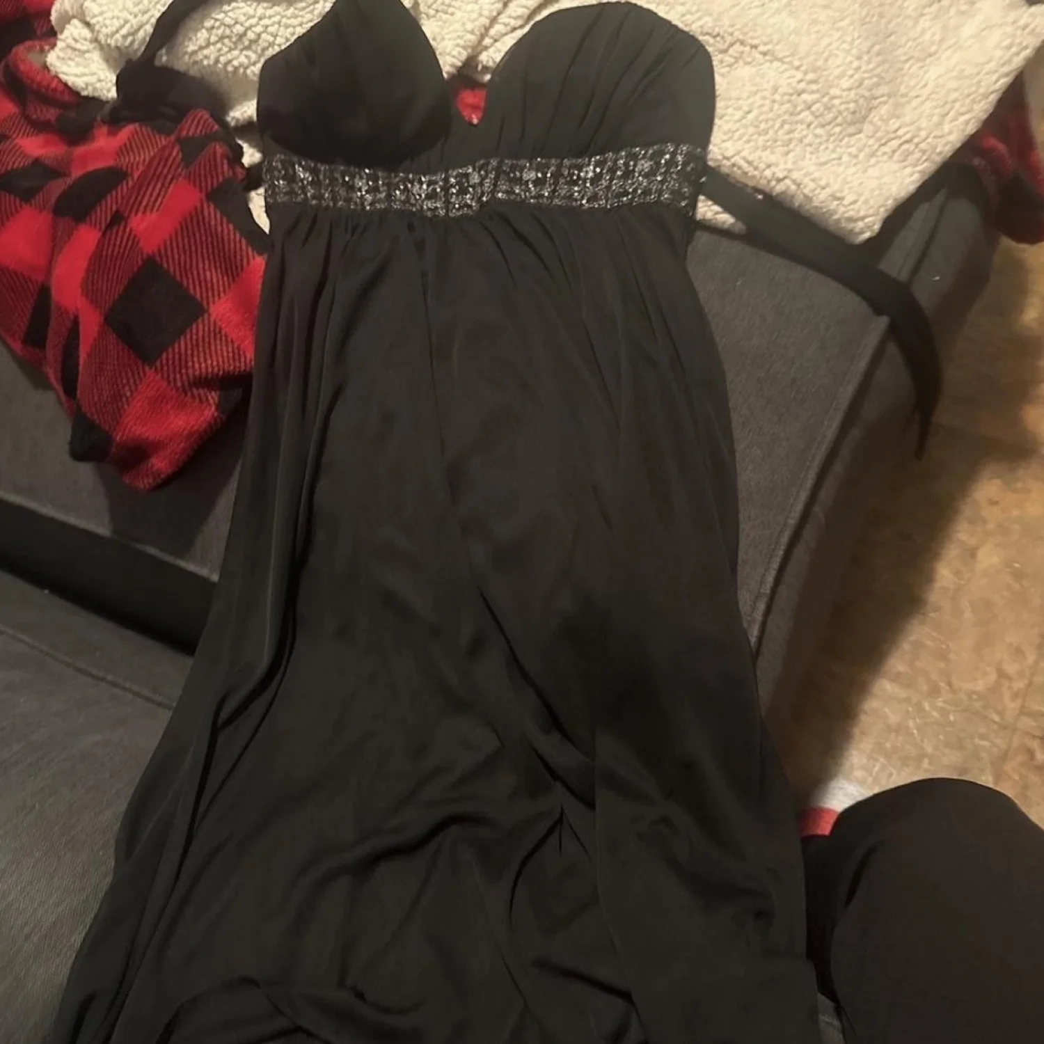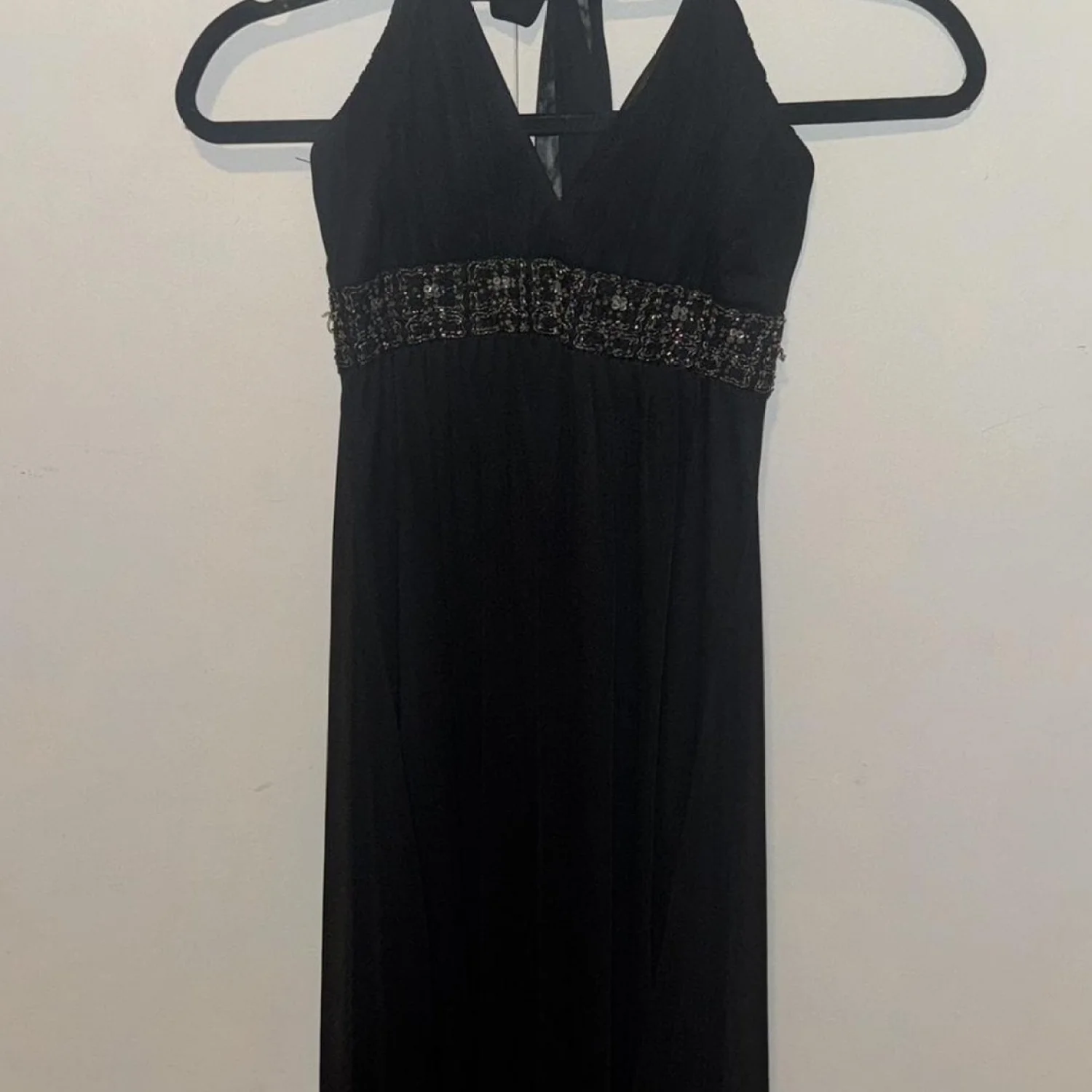 This elegant black halter evening dress from City Triangles features a deep V-neckline and a beaded waistband for a touch of sparkle. The dress is made of 100% polyester and requires dry cleaning only. Perfect for formal occasions and special events. Size: M. #eveningwear #formal #beaded