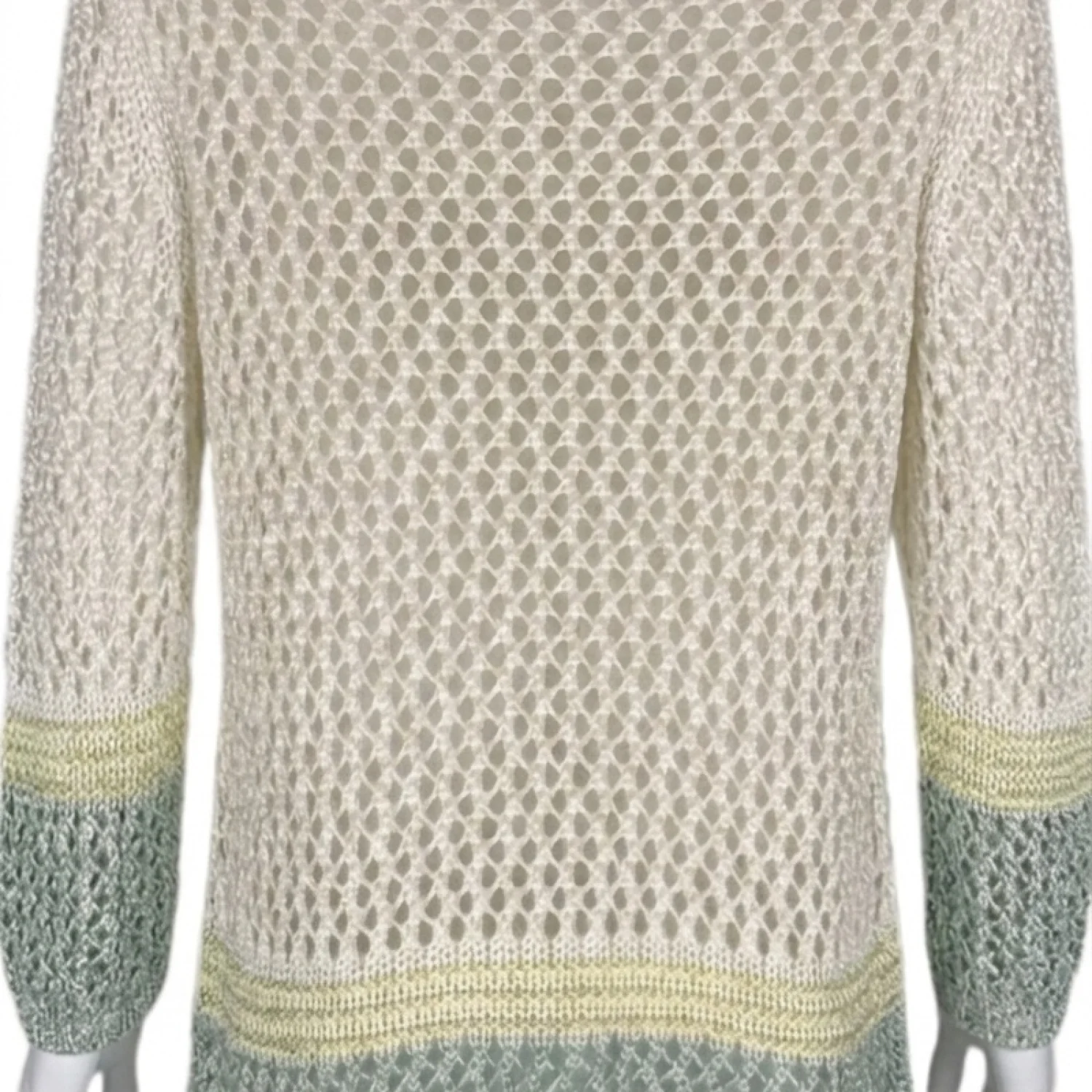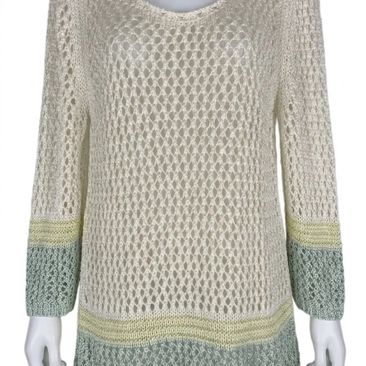 This stylish beige and green crochet tunic sweater features a delicate mesh knit design with subtle green and yellow accents on the cuffs and hem. It's perfect for layering or as a beach cover-up, providing a comfortable and chic look. Made from high-quality materials, this sweater ensures a relaxed fit and offers both style and versatility. Ideal for cool weather or casual outings. #crochet #tunic #beachwear