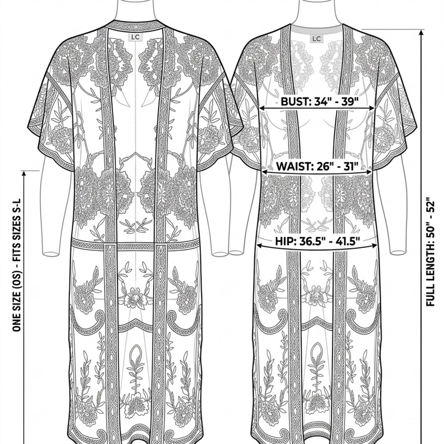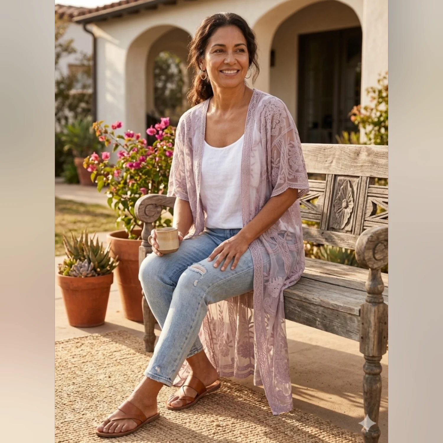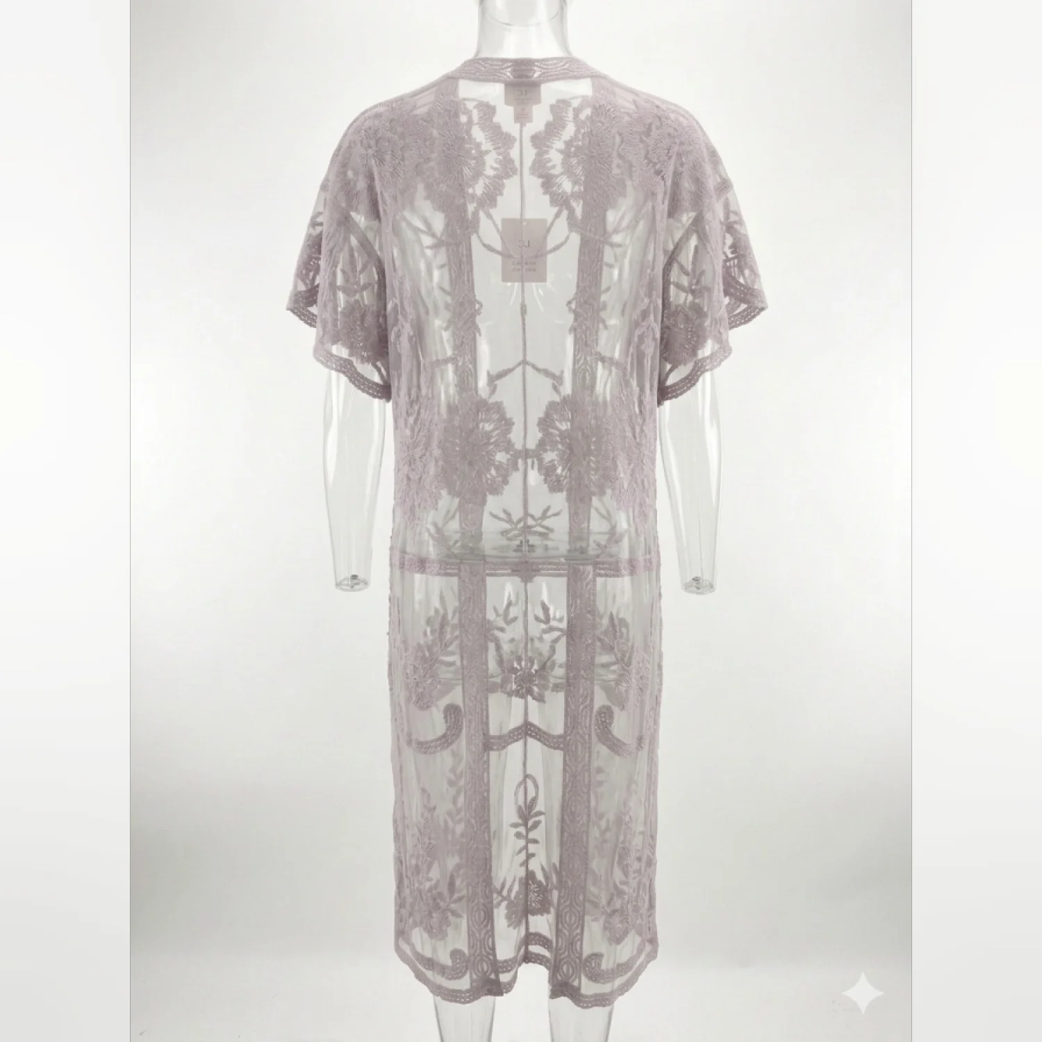 Elegant lavender lace kimono by Lauren Conrad. Features intricate floral patterns and an open front design, perfect for layering over casual or dressy outfits. Made of lightweight, breathable materials. Care details: Hand wash cold, lay flat to dry. #lacekimono #summerlayer #bohochic