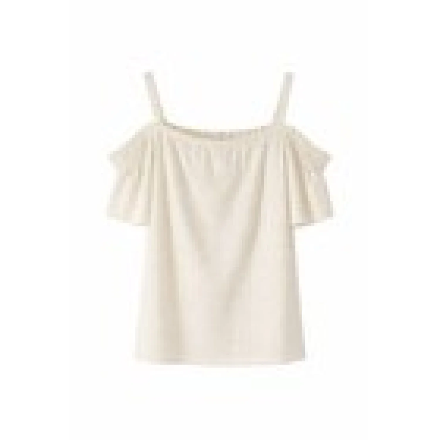 This off-shoulder eyelet blouse is crafted from lightweight, breathable fabric in an elegant ivory color. The top features delicate eyelet detailing and ruffled sleeves, perfect for a casual yet chic summer look. The elasticized neckline ensures comfort and ease of wear. Ideal for pairing with jeans or shorts for a relaxed outing. #summer #ivory #bohostyle