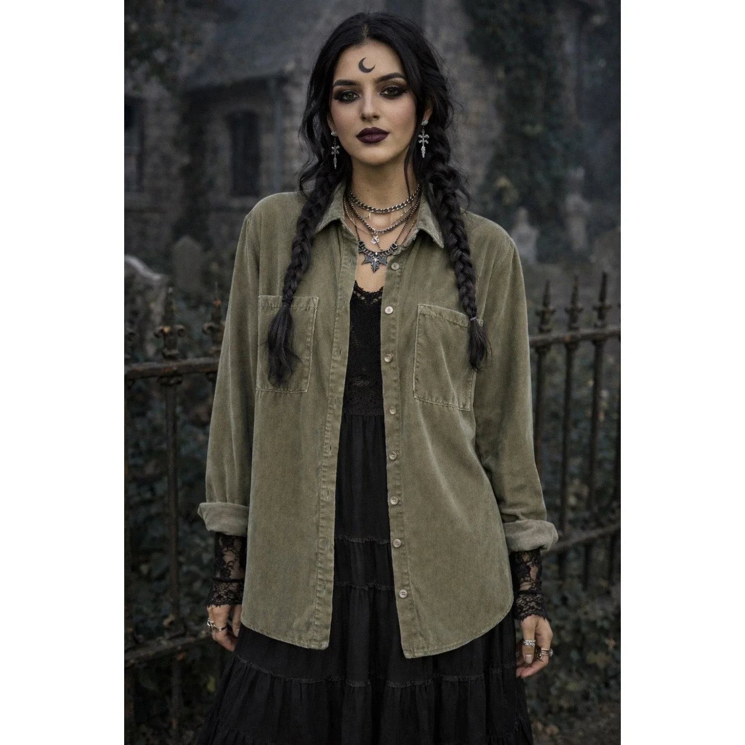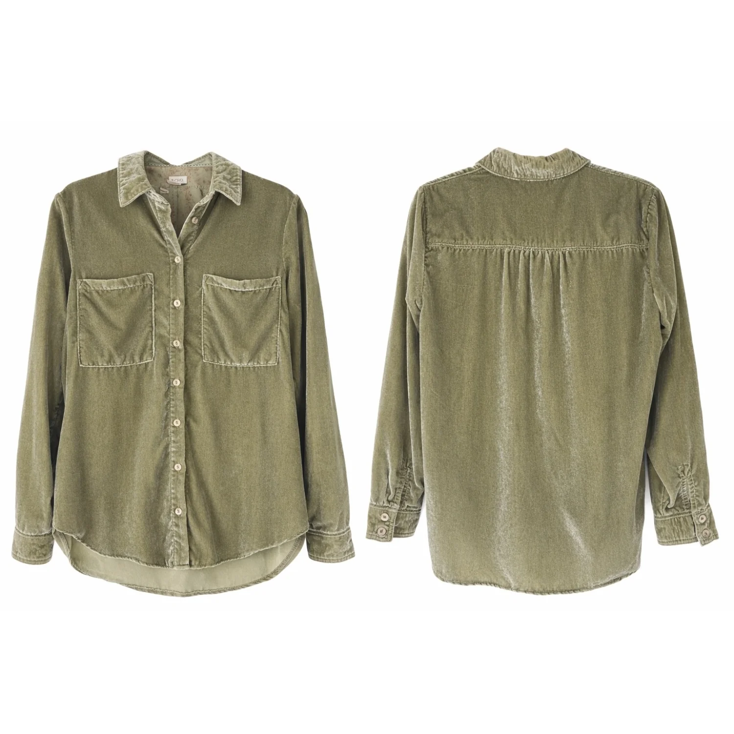 An olive green button-up shirt made from soft velour fabric. Features two front chest pockets and a classic collar design. The shirt has long sleeves with button cuffs and a comfortable fit, ideal for layering. Perfect for a casual look or adding a touch of texture to your outfit. Tags: #corduroy #buttonup #casual #olive