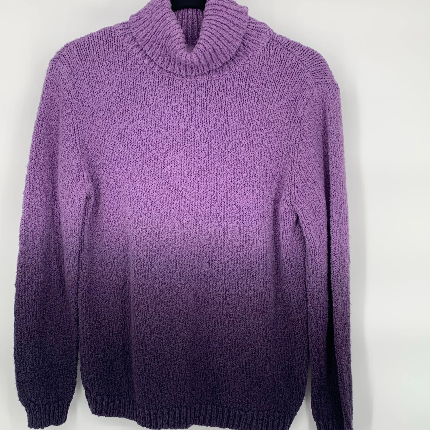 This cozy turtleneck sweater features a stunning purple gradient, transitioning from light to dark shades. It's made of a soft knit material, perfect for keeping warm during cooler months. Ideal for casual or office wear, this sweater adds a stylish flair to any outfit. #gradient #sweater #cozy