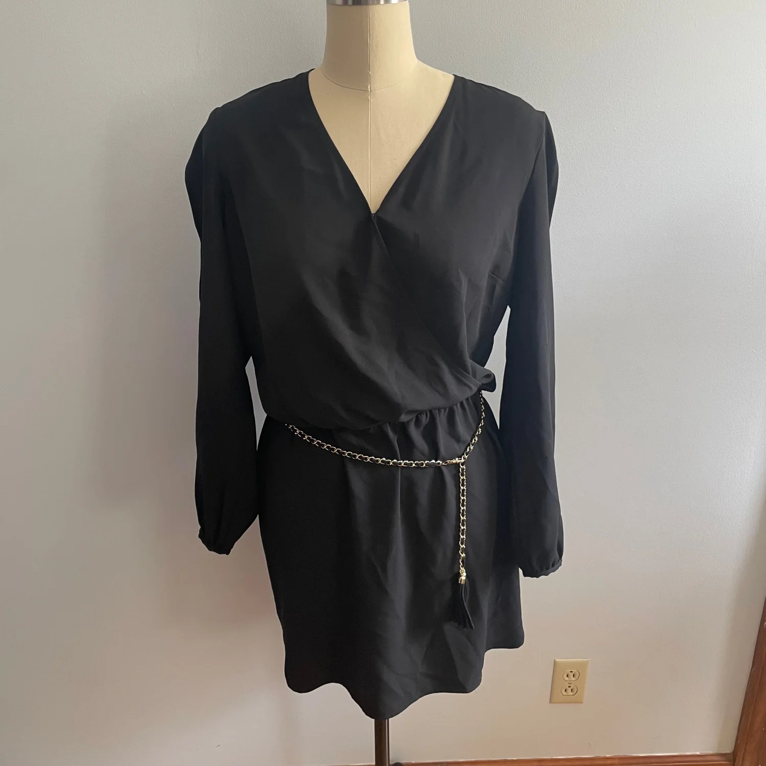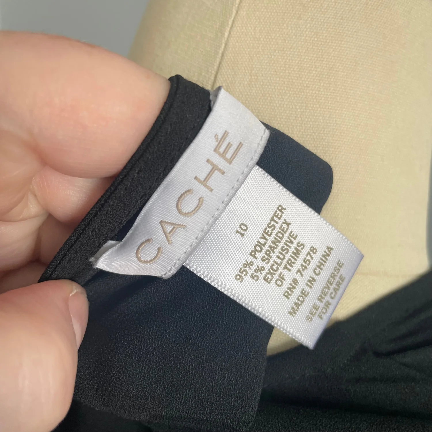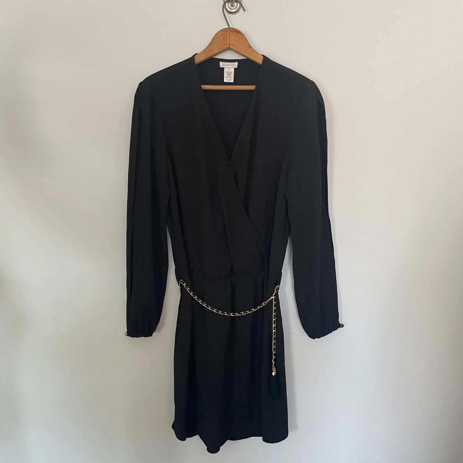 Chic and timeless Cache dress featuring a sleek black design with a statement leather tassel and metal chain belt. Size: 10 Color: Black Long sleeves for a flattering silhouette Sleeves have a slit for a fun peekaboo moment Gold buttons on cuffs V neck faux wrap top Snap on top for more modesty Includes detachable leather/chain tassel belt for an edgy, sophisticated touch Perfect for cocktail parties, date nights, or special events Fabric- 95% Polyester 5% Spandex
