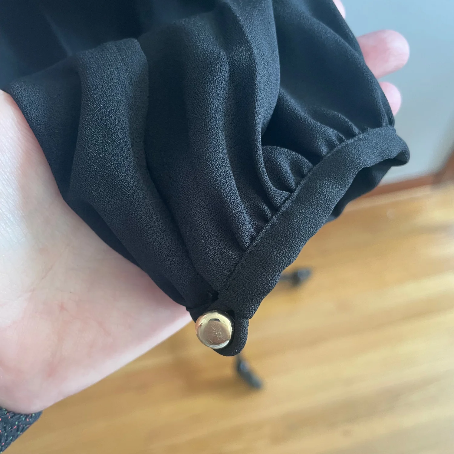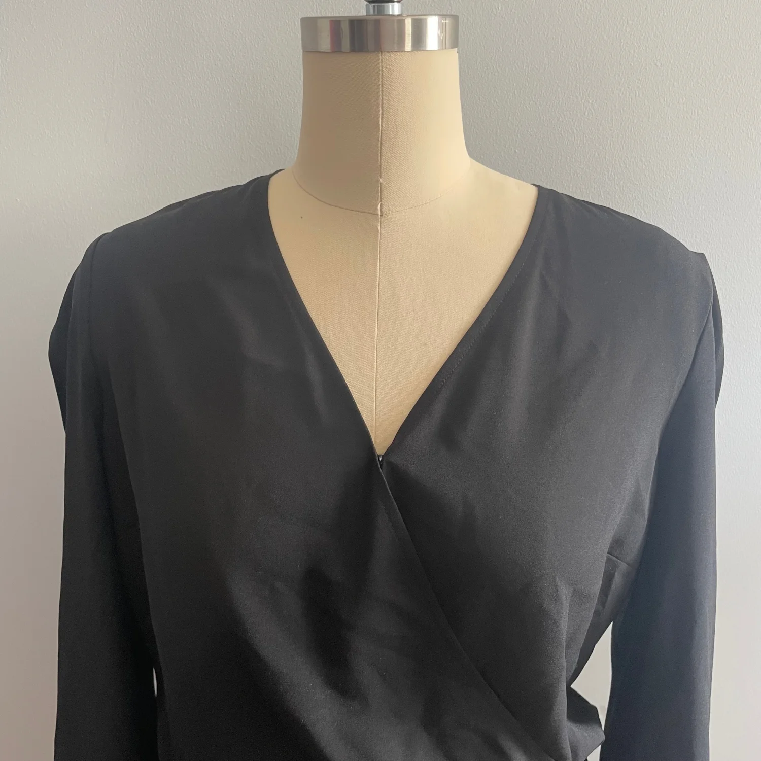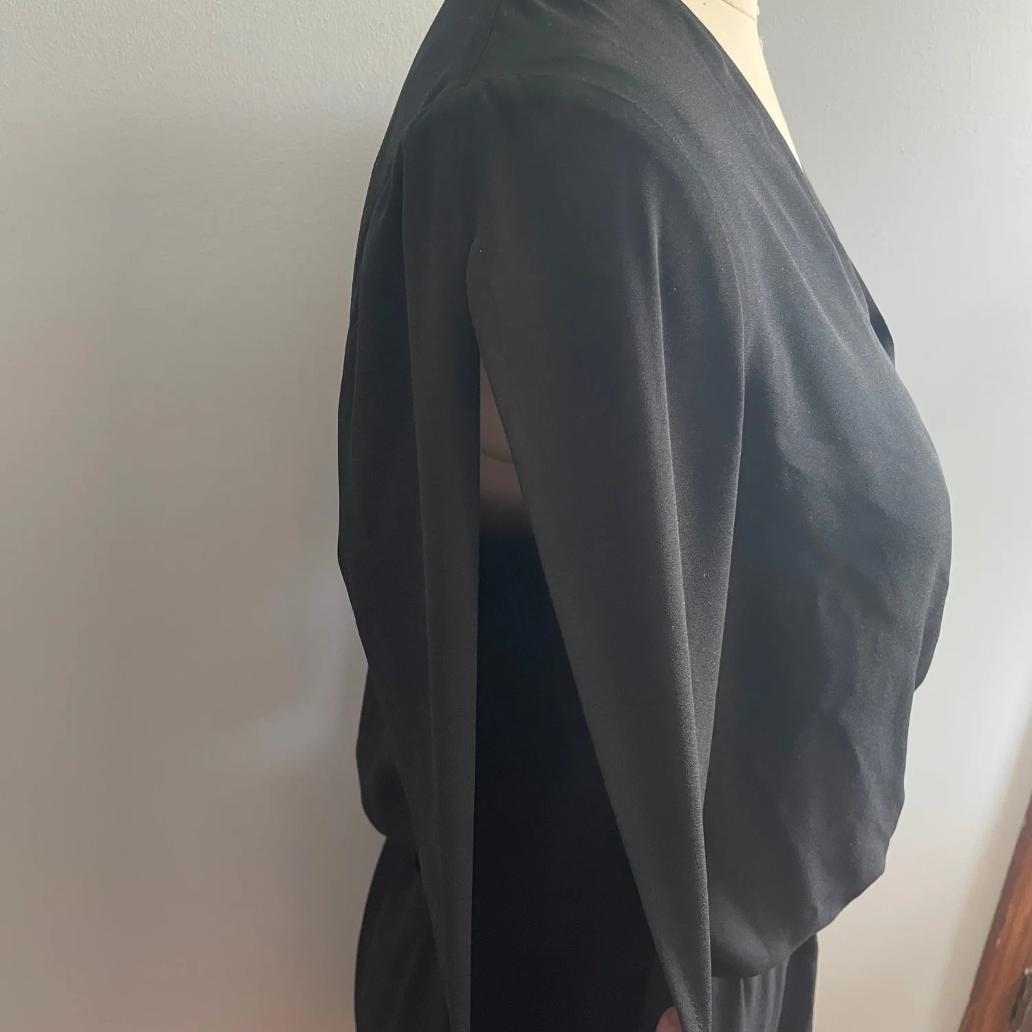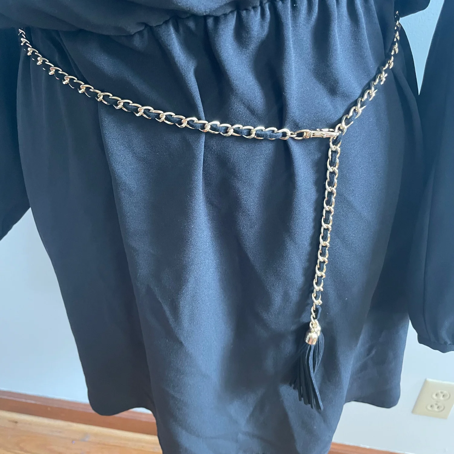 Chic and timeless Cache dress featuring a sleek black design with a statement leather tassel and metal chain belt. Size: 10 Color: Black Long sleeves for a flattering silhouette Sleeves have a slit for a fun peekaboo moment Gold buttons on cuffs V neck faux wrap top Snap on top for more modesty Includes detachable leather/chain tassel belt for an edgy, sophisticated touch Perfect for cocktail parties, date nights, or special events Fabric- 95% Polyester 5% Spandex
