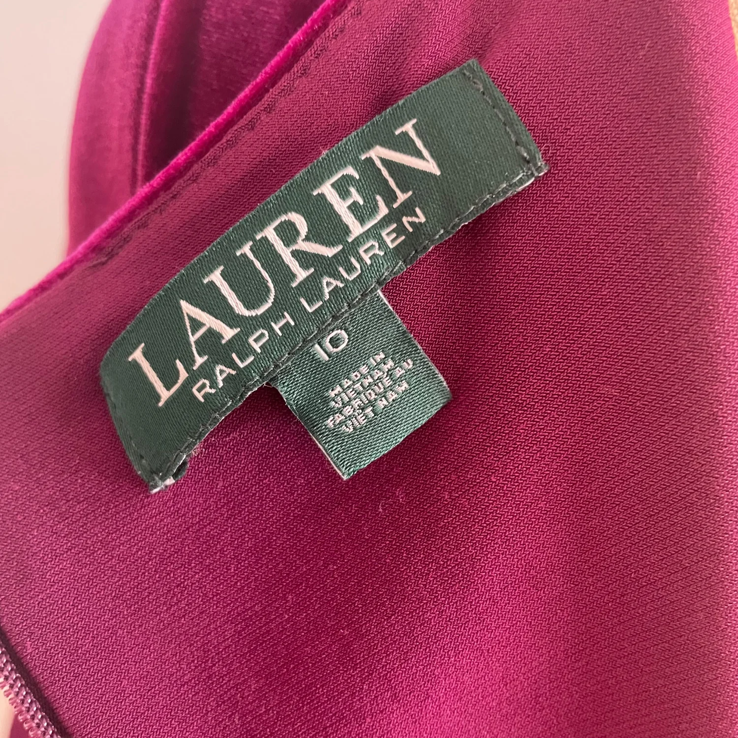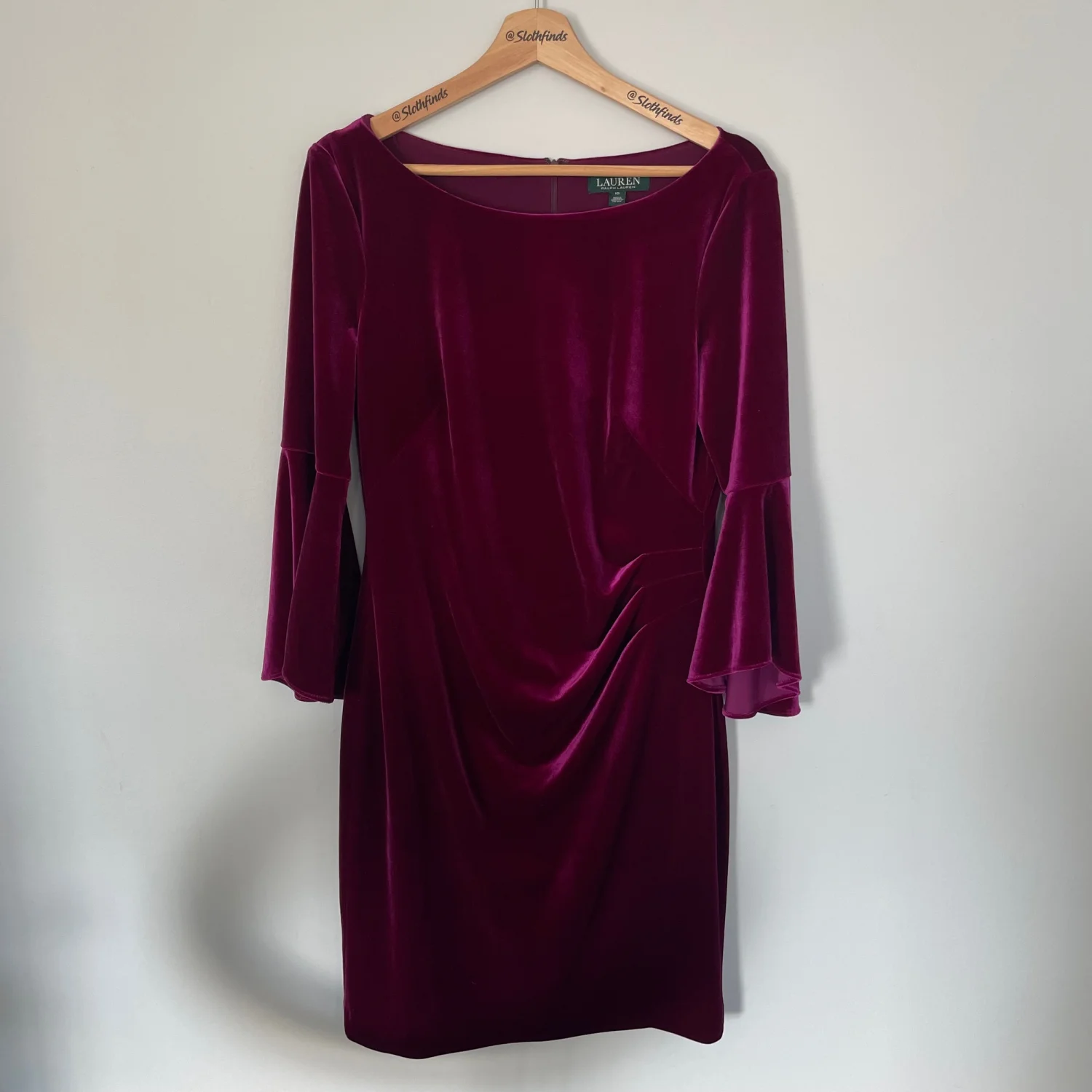 Turn heads in this stunning Lauren Ralph Lauren velvet dress. Crafted in rich purple velvet, this elegant piece features dramatic bell sleeves for a timeless, elevated look. Perfect for evening events, holiday parties, weddings, or any occasion where you want to feel effortlessly chic. Details: Brand: Lauren Ralph Lauren Size: 10 Color: Deep Purple Fabric: Soft velvet Sleeves: Bell sleeves Style: Elegant / Evening / Cocktail A classic silhouette with luxurious texture—easy to dress up with heels and statement jewelry or keep refined with simple accessories. Fabric- 90% Polyester 10% Elastane Pit 2 Pit- 18.5 inches