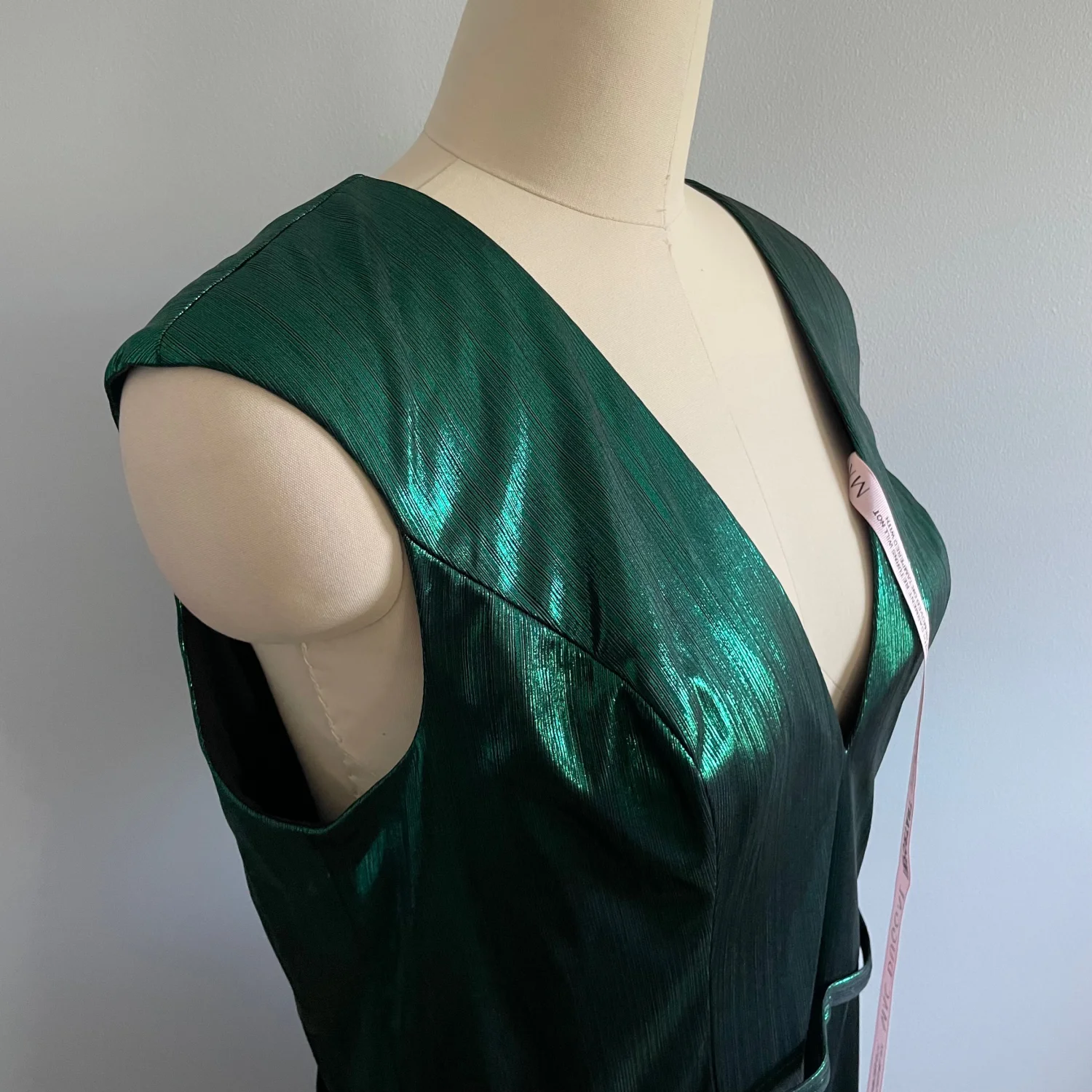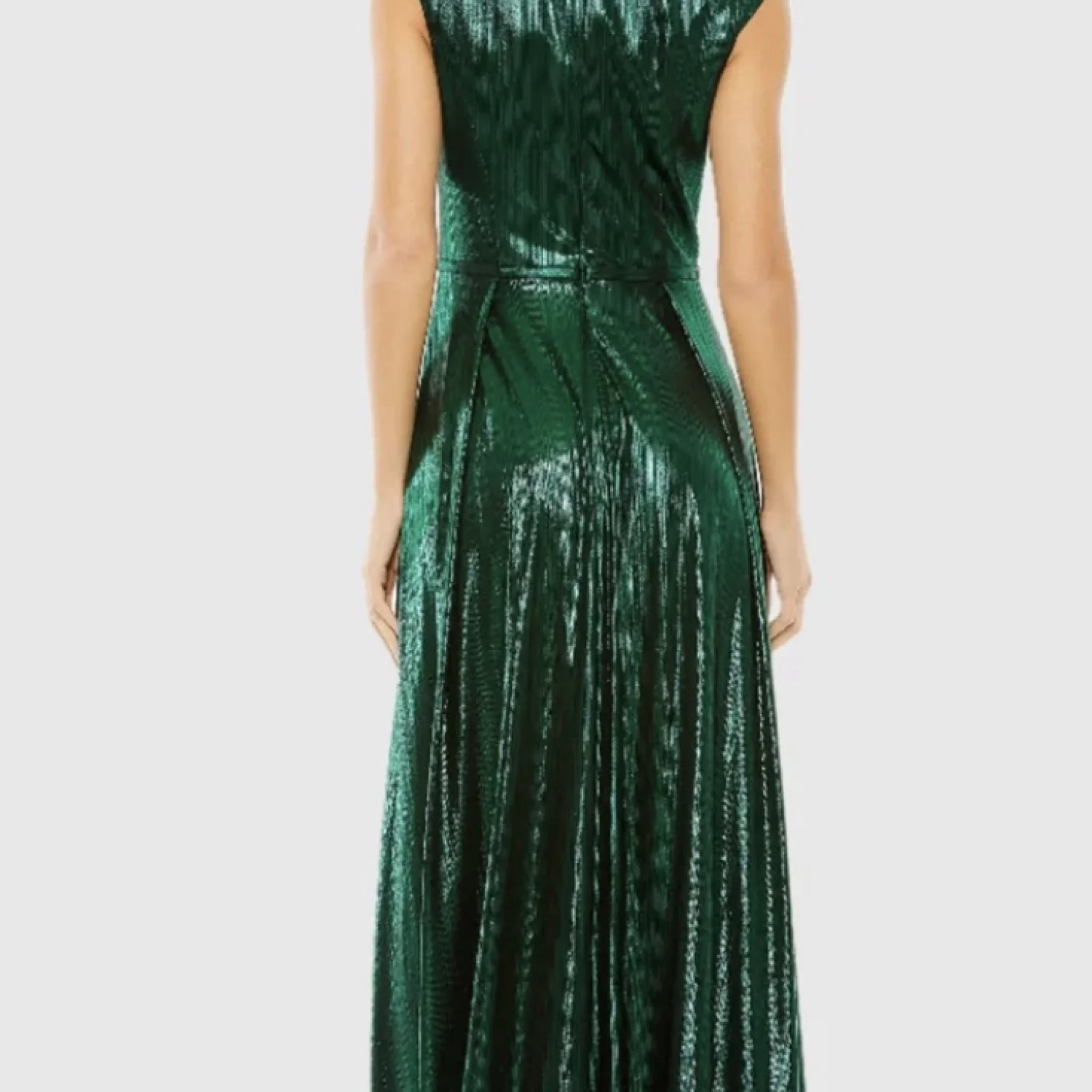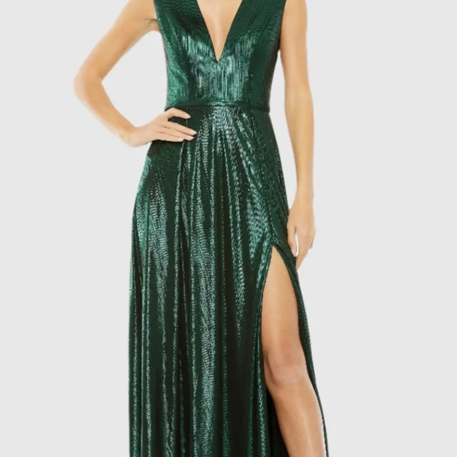 Shimmer in style with this elegant green evening gown. Perfect for special occasions, this dress features a stunning design that will make you stand out. It’s giving Emerald City/ Slytherin vibes in the best way possible! Perfect for weddings, prom, homecomings, galas, and more! Mac Duggal Metallic jersey fabric (100% polyester) Fully lined through bodice and skirt Deep v-neck Cap sleeves Thigh-high slit Concealed back zipper Approx. 60" from top of shoulder to bottom hem Available in Emerald Style #27156 Still available on the website!