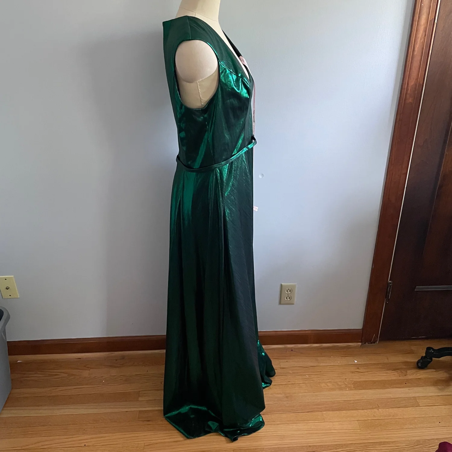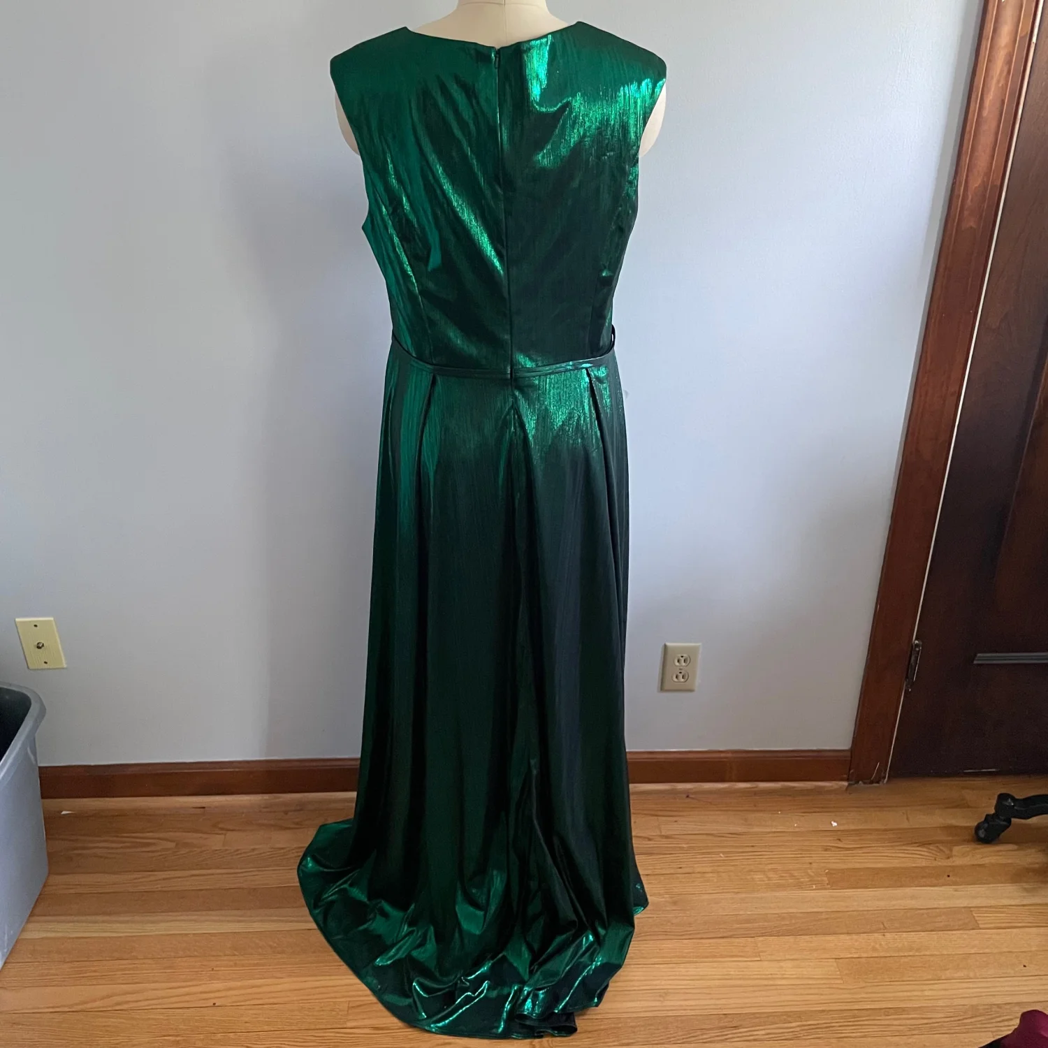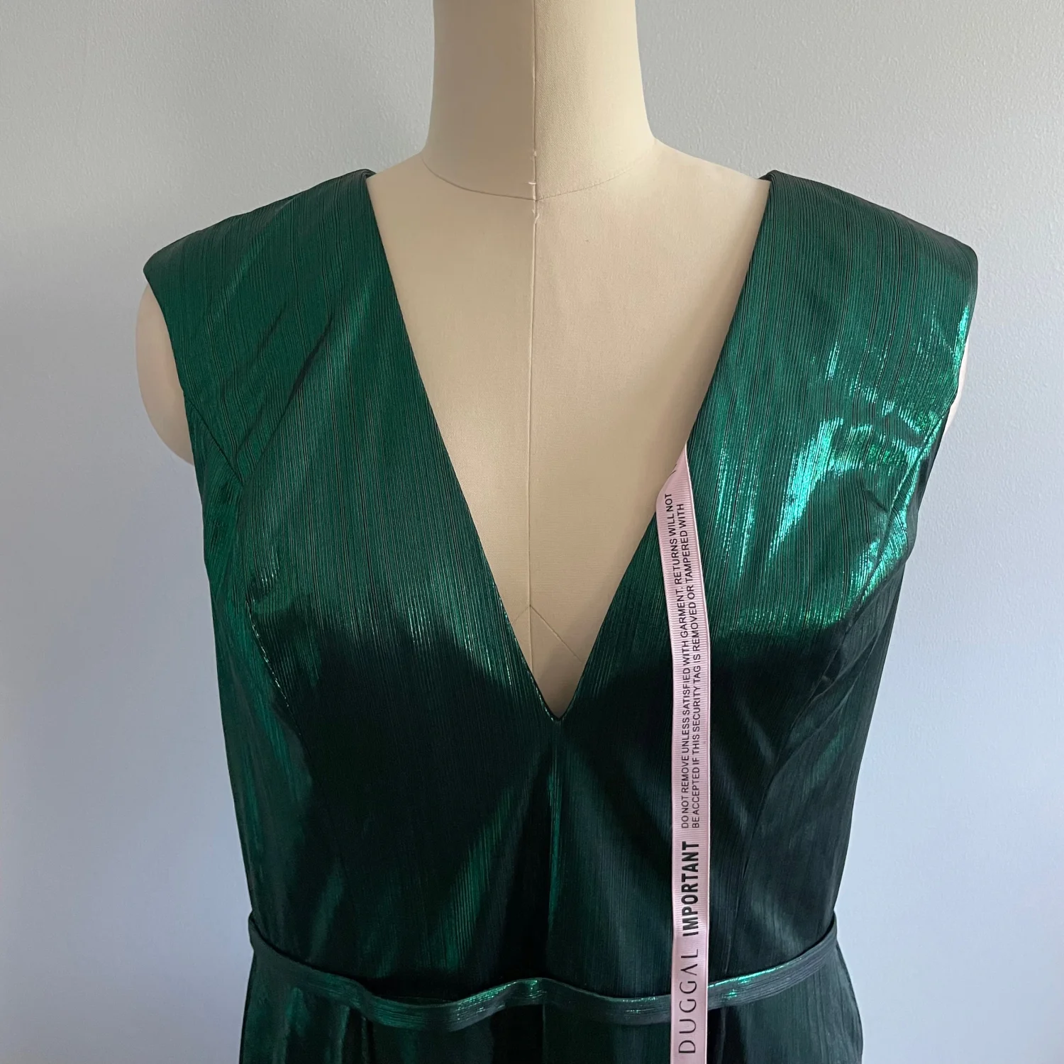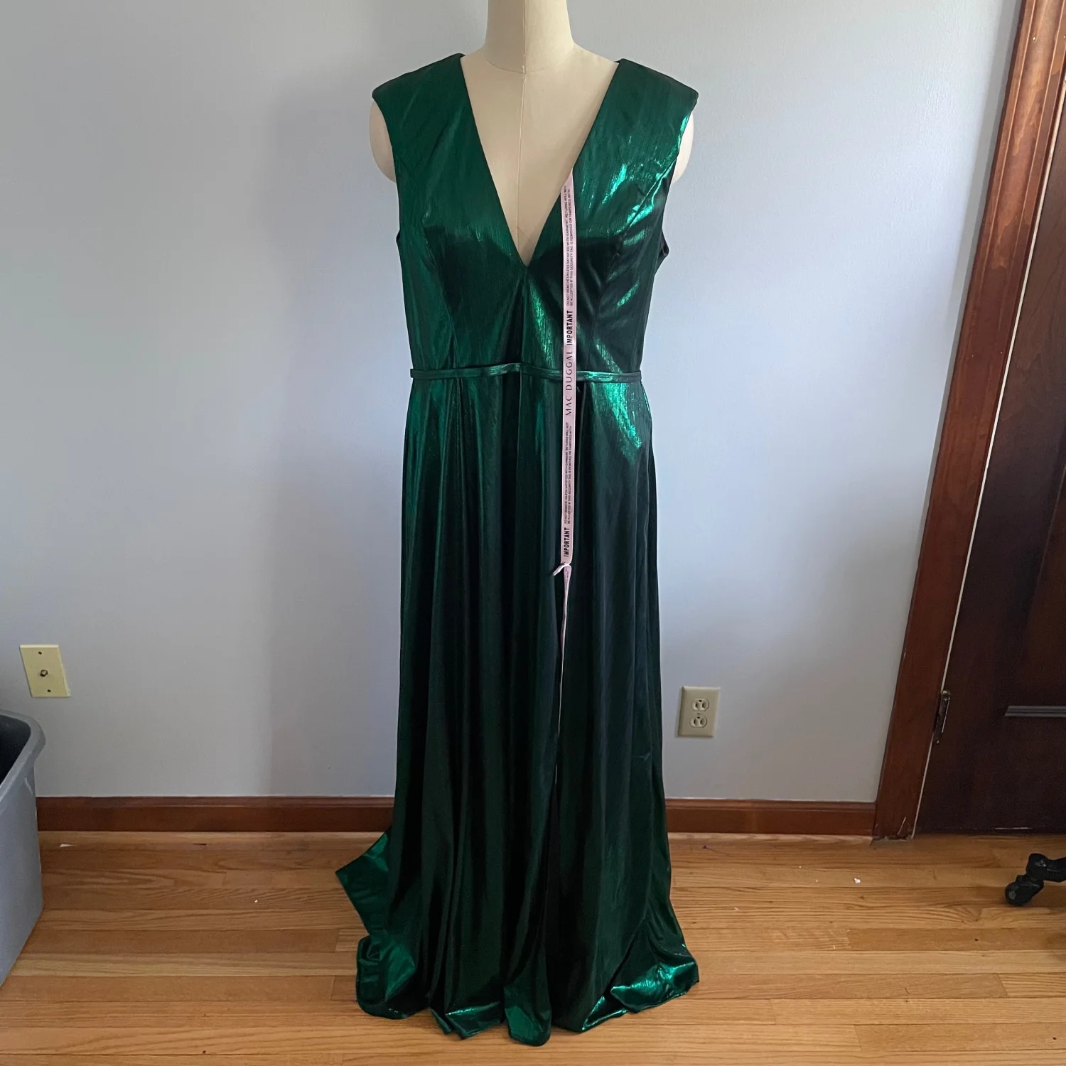 Mac Duggal Cap Sleeve Deep V Neck High Slit Metallic Gown- Size 12- Emerald- NWT