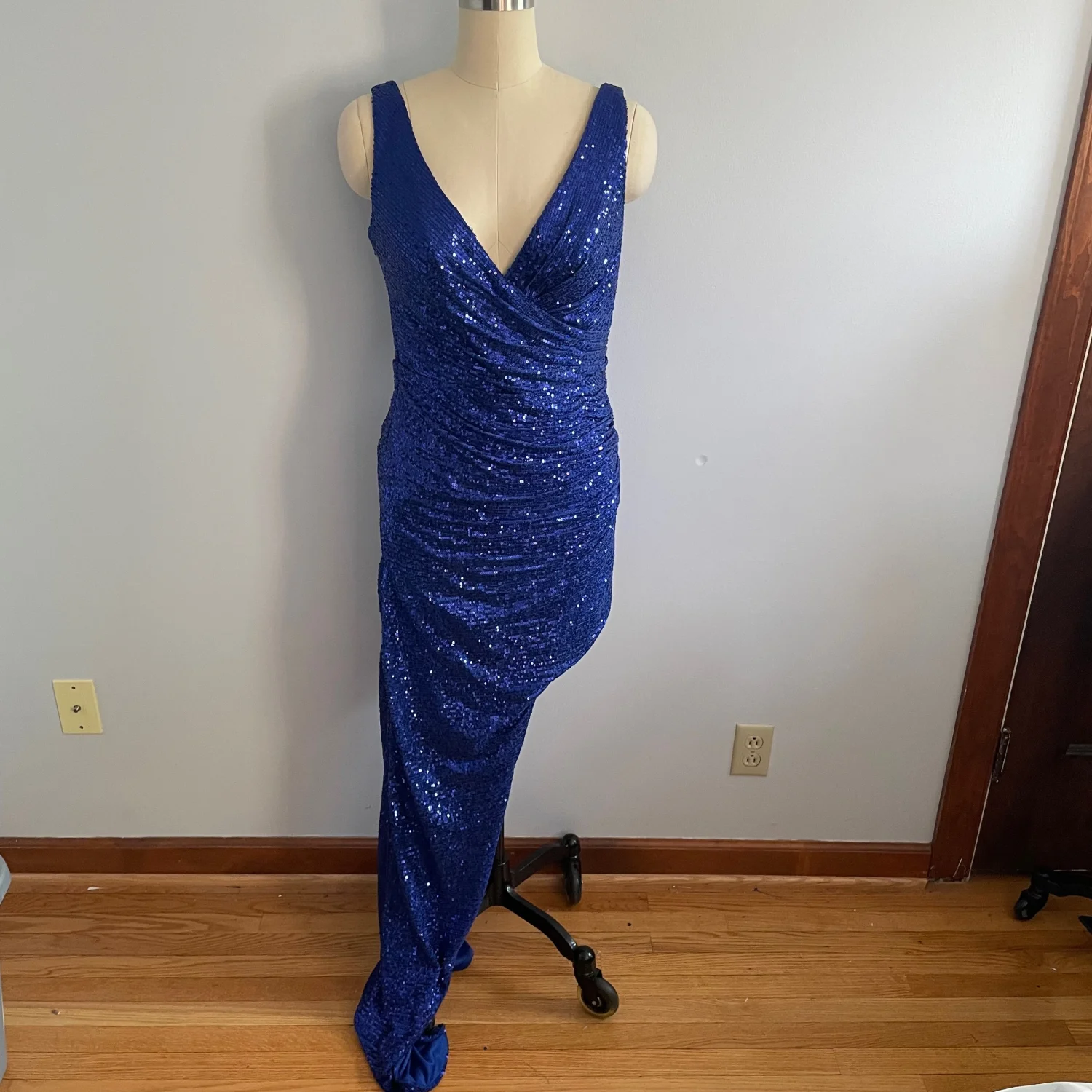 Dazzle in this royal blue asymmetrical dress. Features shimmering sequins and a unique hemline. Perfect for special occasions. Shine in this stunning blue sequin dress, perfect for any special occasion. Its elegant design ensures you stand out in style. New with tags Ieena for Mac Duggal Sequined Draped Faux Wrap Asymmetrical Hem Gown Color: Cobalt Sequin fabric (100% polyester) Fully lined through body V-neckline Sleeveless Faux wrap bodice Asymmetrical hem Concealed side zipper Approx. 60 from top of shoulder to bottom hem Style #A11275 Perfect for weddings, galas, prom, homecomings, and anywhere you need a special event dress. So pretty and unique!
