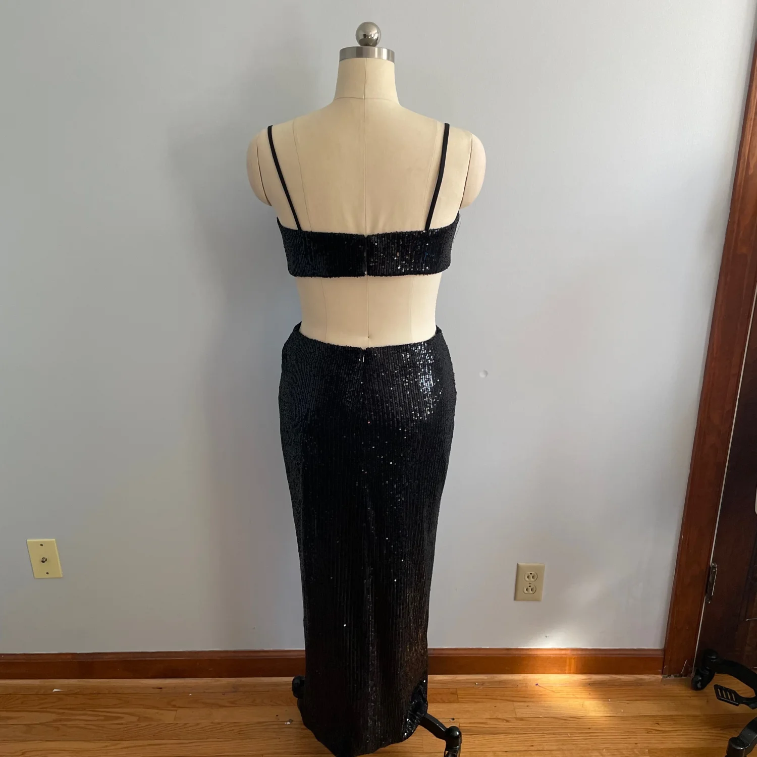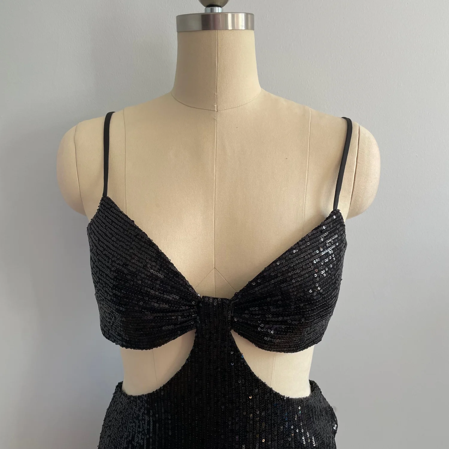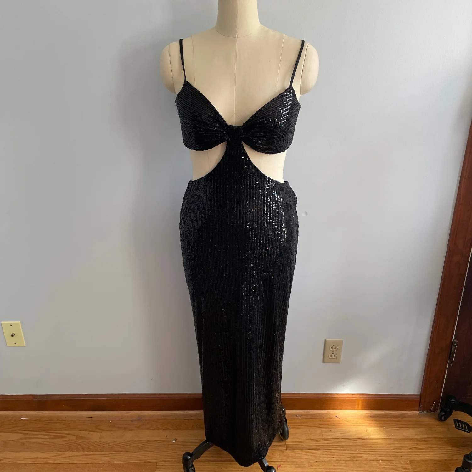 Mac Duggal Sequined Spaghetti Strap Cut Out Gown- Black- Size 8- NWT