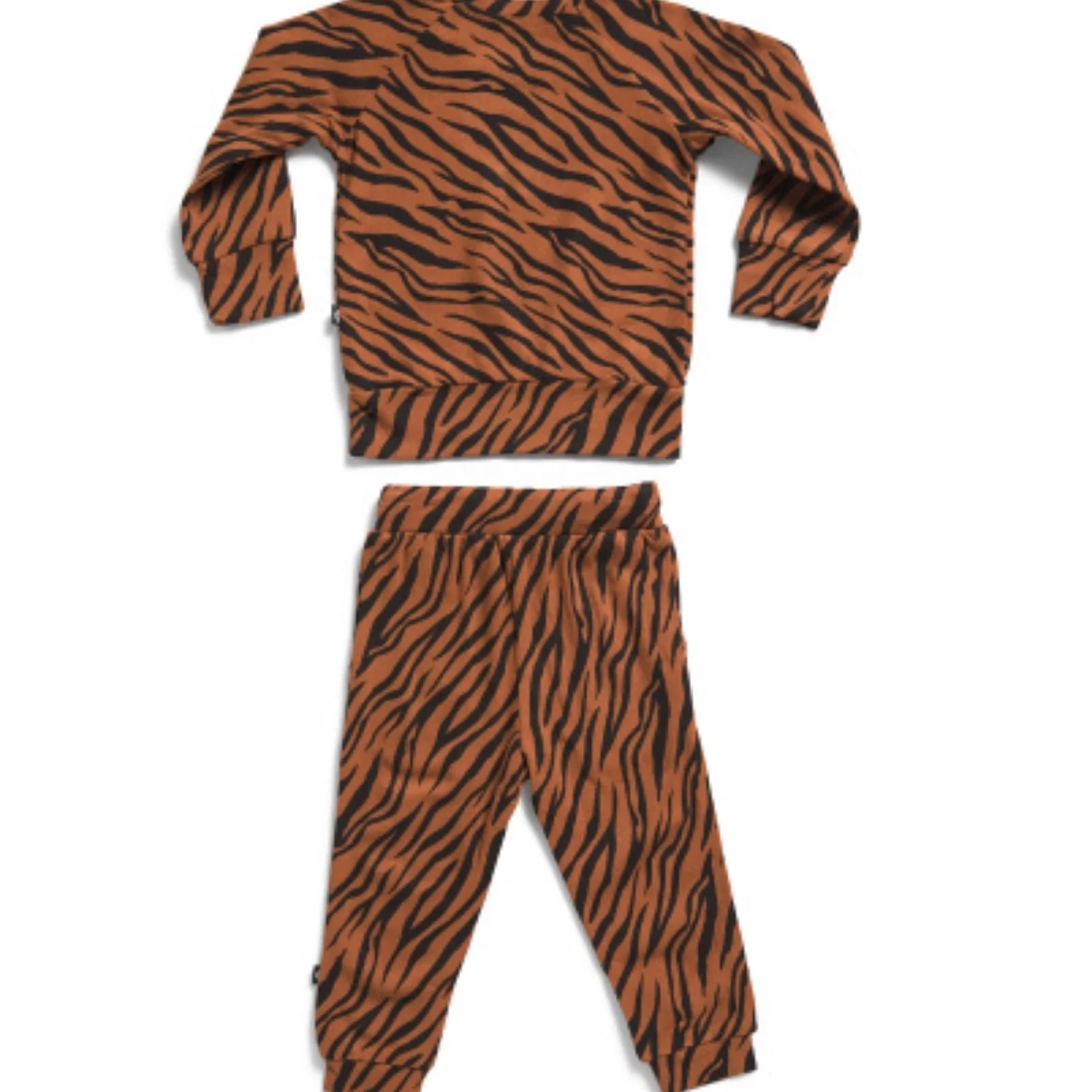 Cozy and fun tiger print pajamas for kids. Perfect for bedtime adventures. Brand new with tags 3-6 months 2 piece matching set inches 1 top and 1 pair of joggers Top: Crewneck Pull on Long sleeve Animal print Fabric provides stretch Jogger: Drawstring waist Animal print Fabric provides stretch Rayon/Spandex