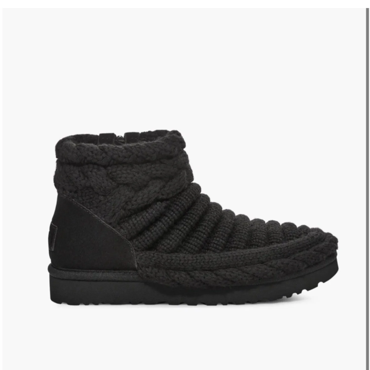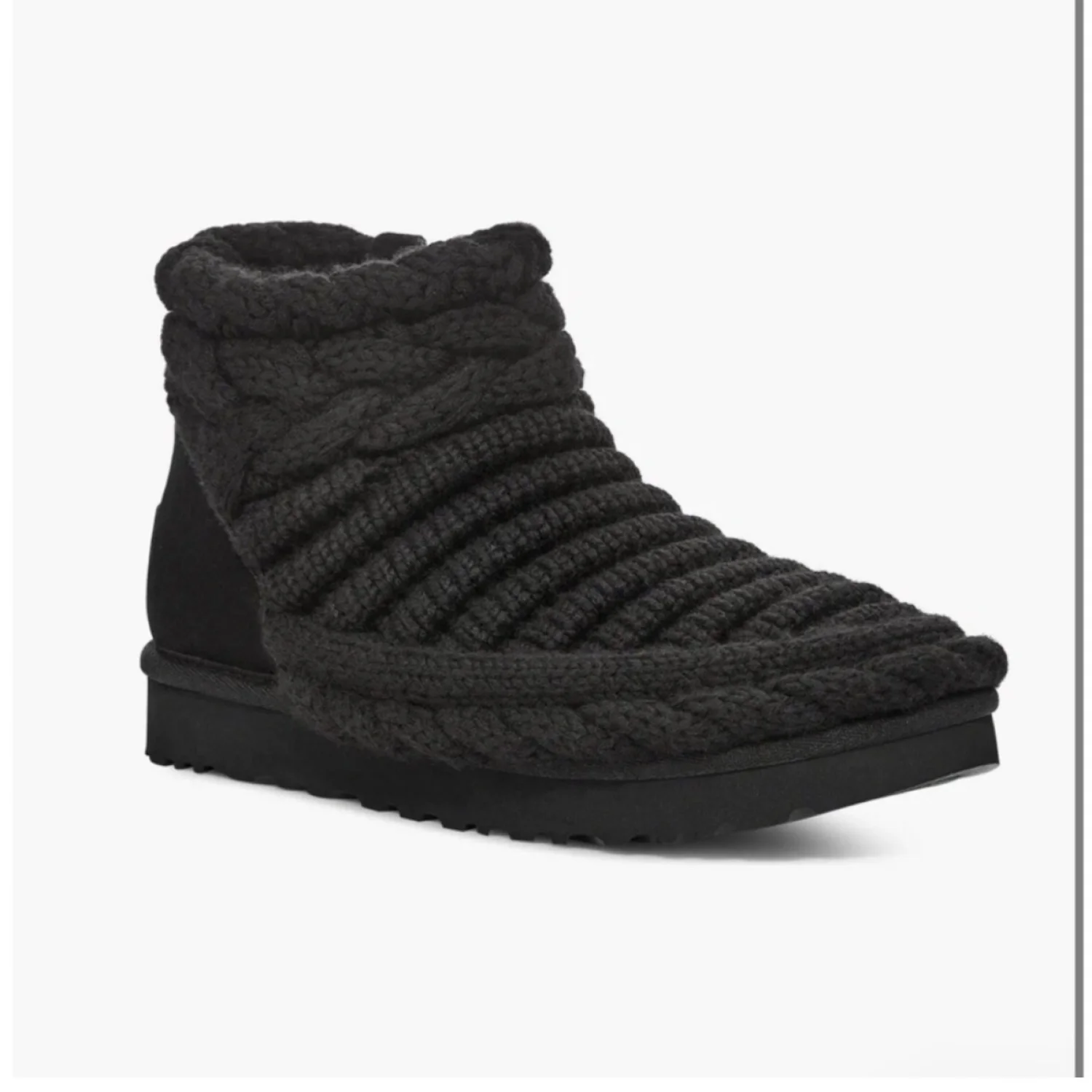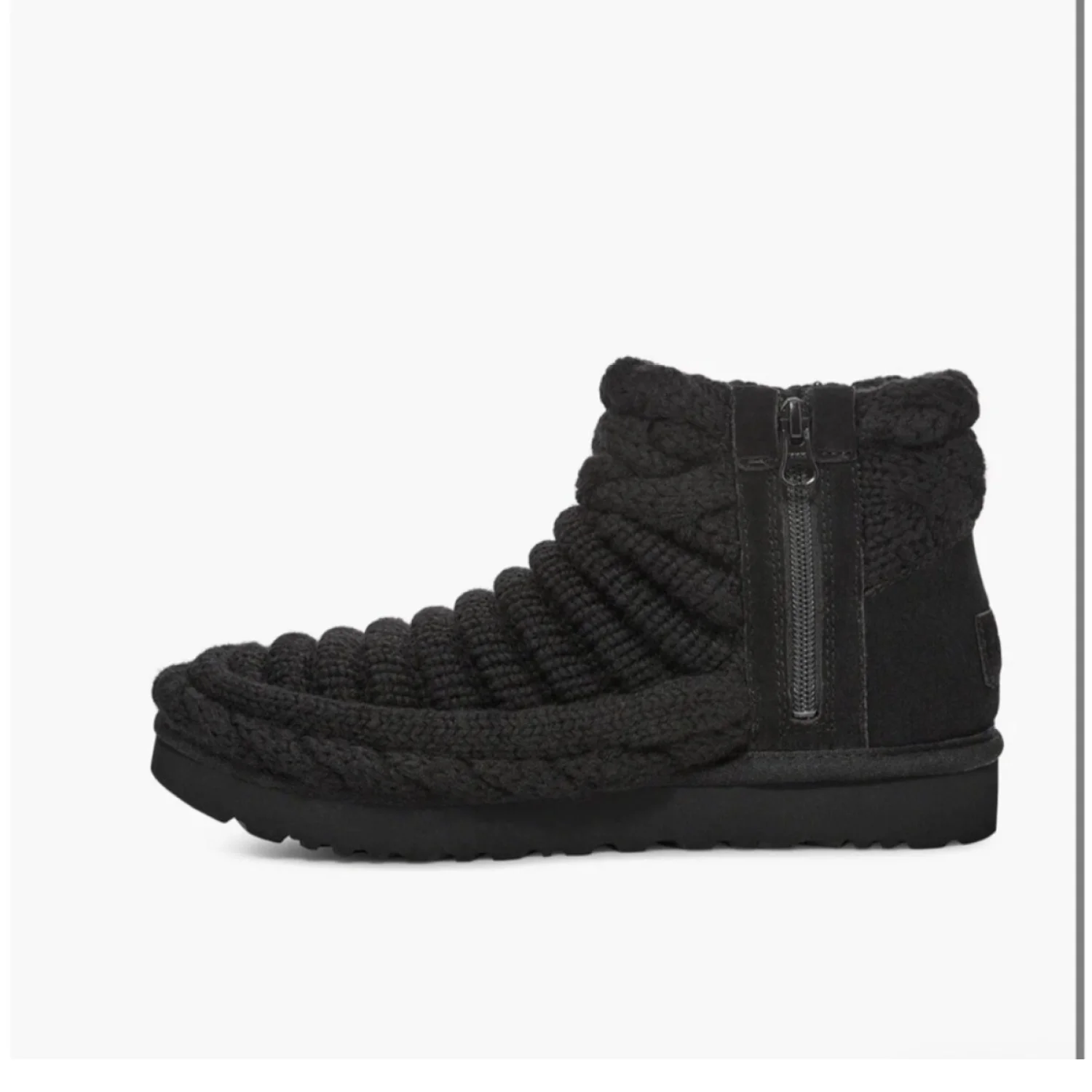 Brand new! A chunky knit bootie offers warmth and comfort with a nubby lining made from supersoft UGGplush. This fabric is a moisture-wicking textile made from a wool-rich blend but crafted to feel and wear like genuine shearling. 5" shaft Textile and leather upper/UGGplush wool-blend lining/synthetic sole